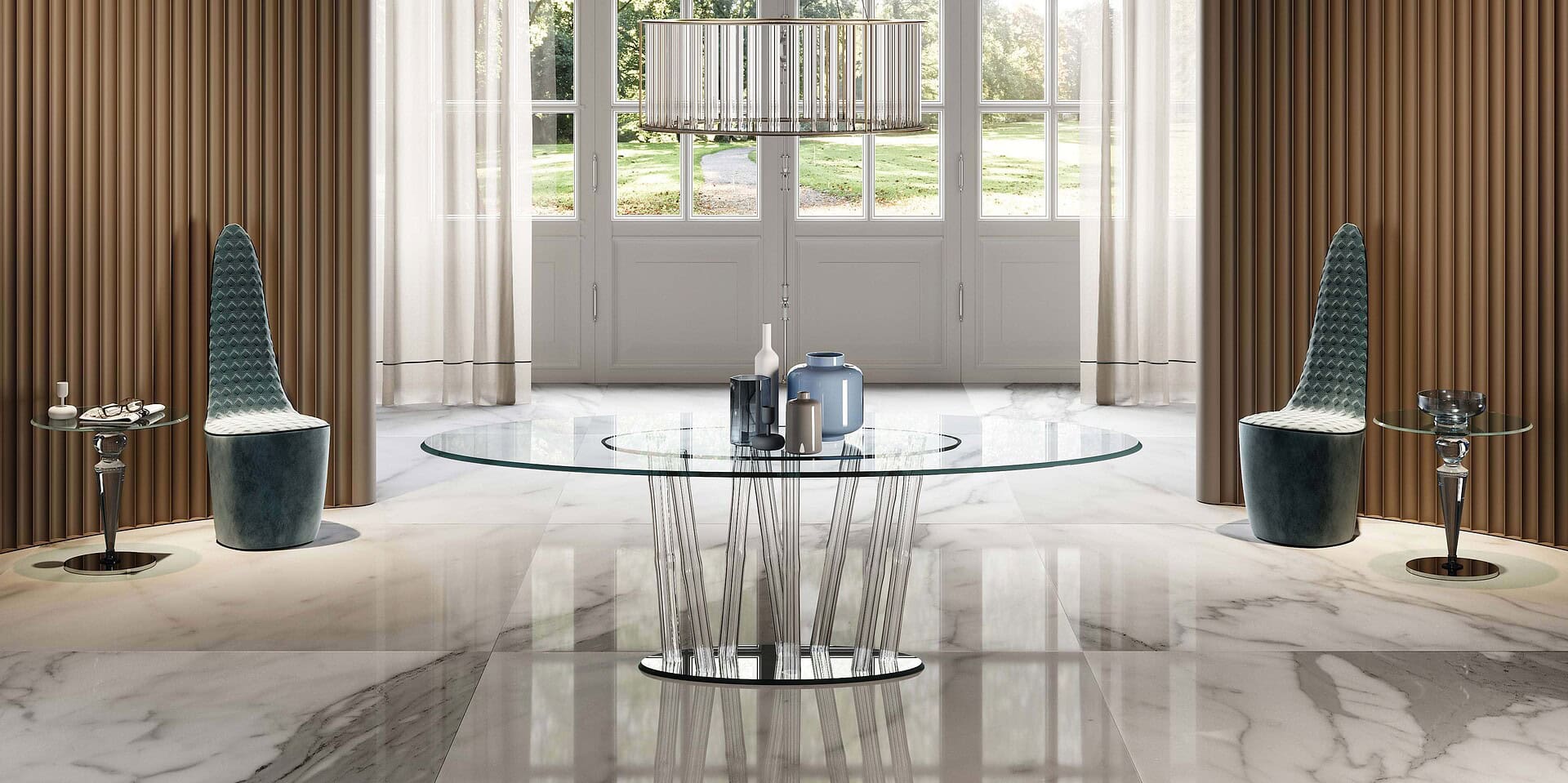 Elegant glass dining table with gold accent chairs and modern chandelier for stylish interior design.