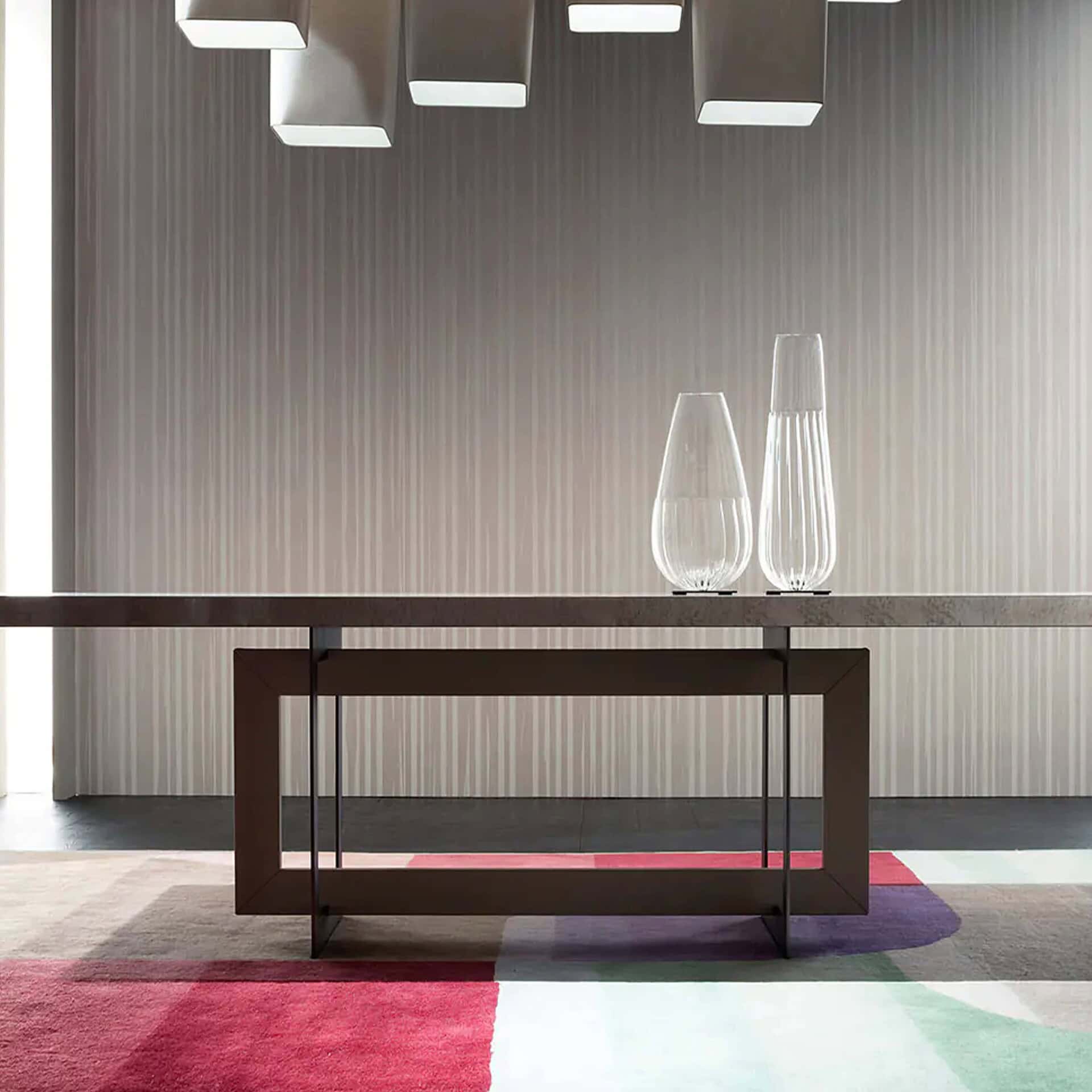 Contemporary, geometrical beauty. This table is the epitome of style and smooth lines. The top is supported by intersecting frames made of various material combinations, such as metal, solid wood, or leather, and is of the highest quality.