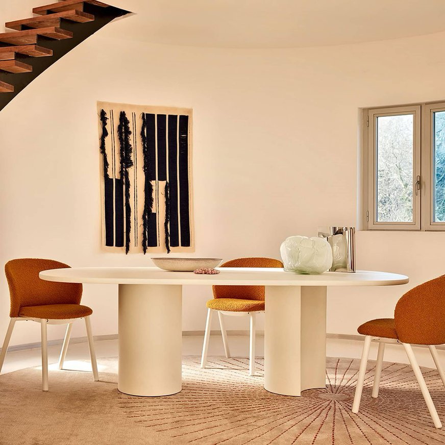Offered in both circular and oval shapes, Bol is available in a variety of sizes to suit a range of dining configurations. The MDF tabletop comes in coordinated matt finishes to match the base, creating a seamless and sophisticated silhouette. Whether used in residential dining rooms or design-forward hospitality spaces, Bol is a versatile table that blends technical precision with elegant aesthetics.