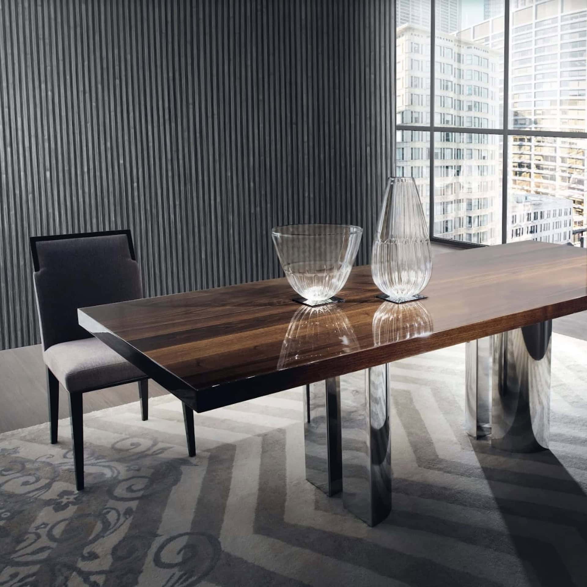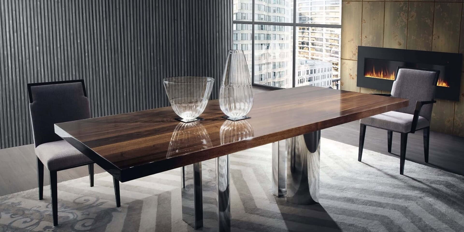 The contrast between the wood top and the base of four gleaming steel columns in this table, which combines a straightforward design with fine craftsmanship, creates a stunning visual impact. The Central Park table top is offered in a variety of wood species, three standard sizes, and both fixed and extendable options. There are also many options for customization.