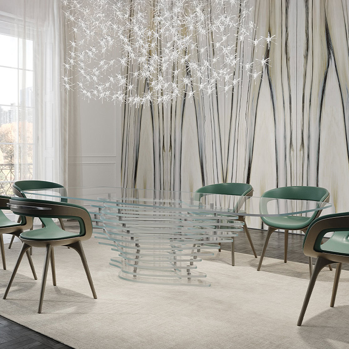 Handcrafted in Italy, the Dune 72 showcases Reflex’s signature mastery of glasswork, offering both durability and artistry. Available in a range of square-round and rectangular sizes, it adapts seamlessly to intimate dining rooms or large open spaces. With shiny steel joints providing stability and a sleek accent, this table is as functional as it is visually striking.