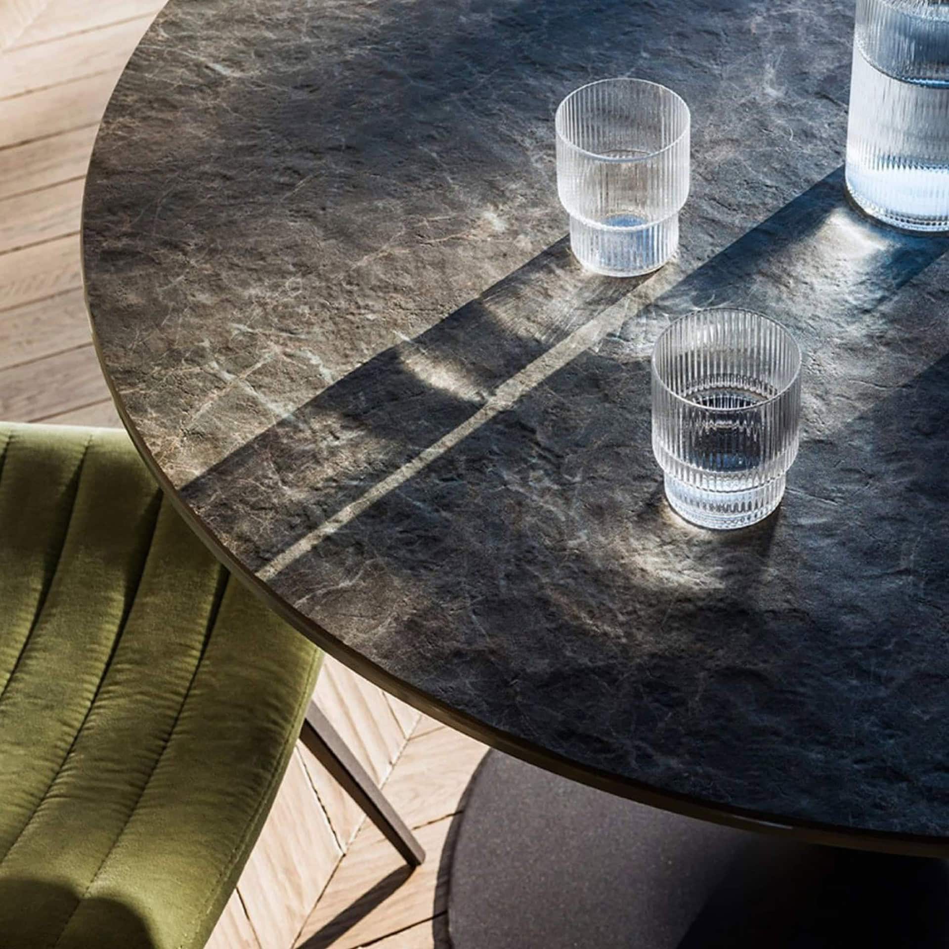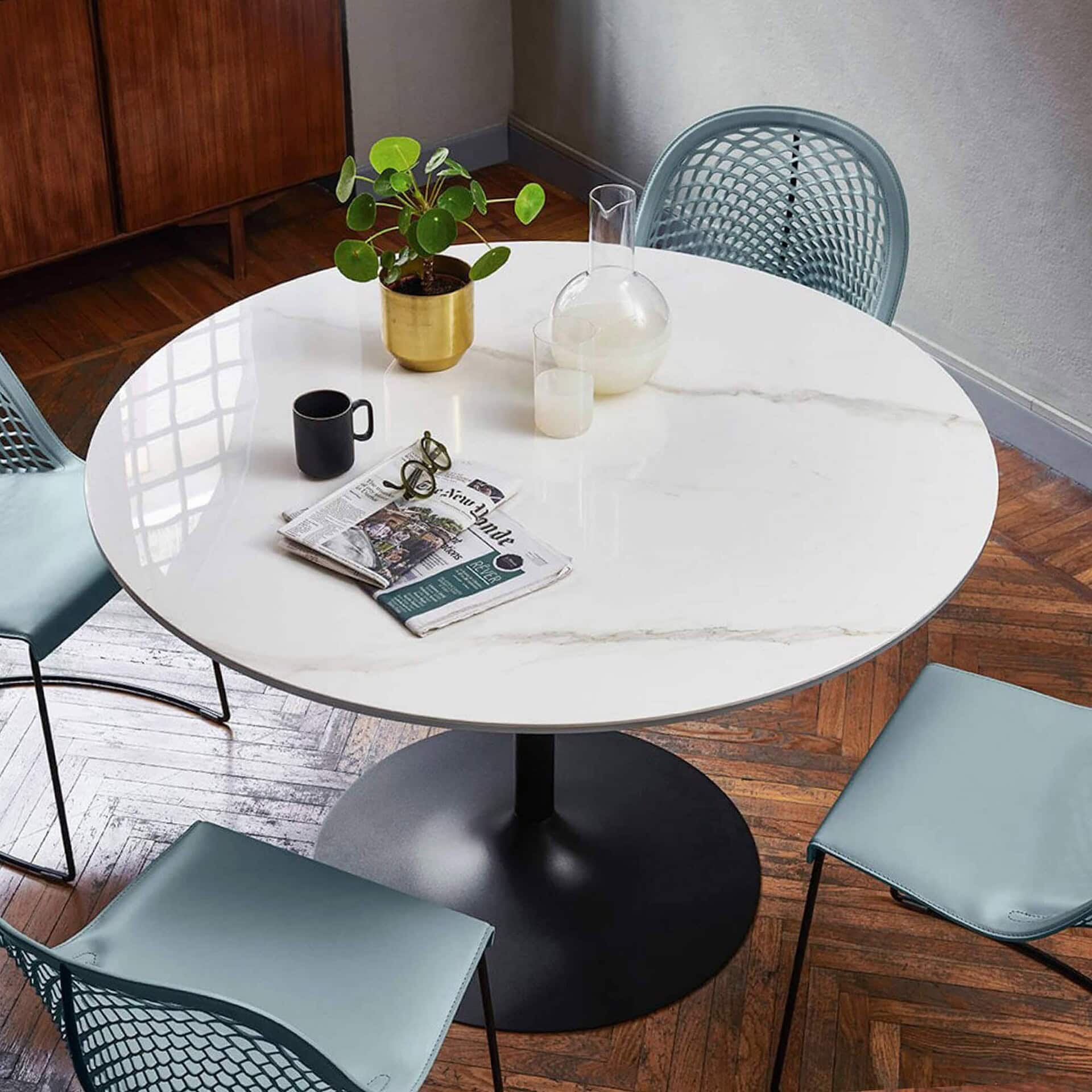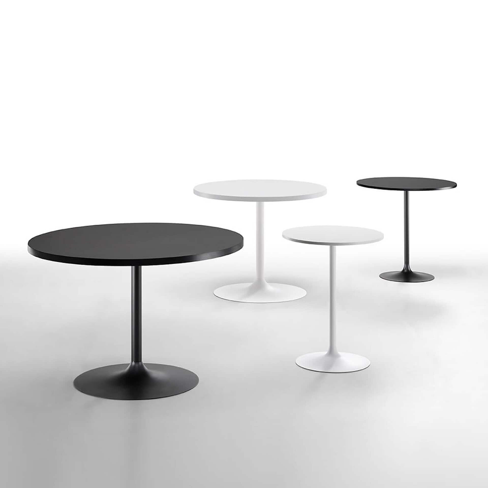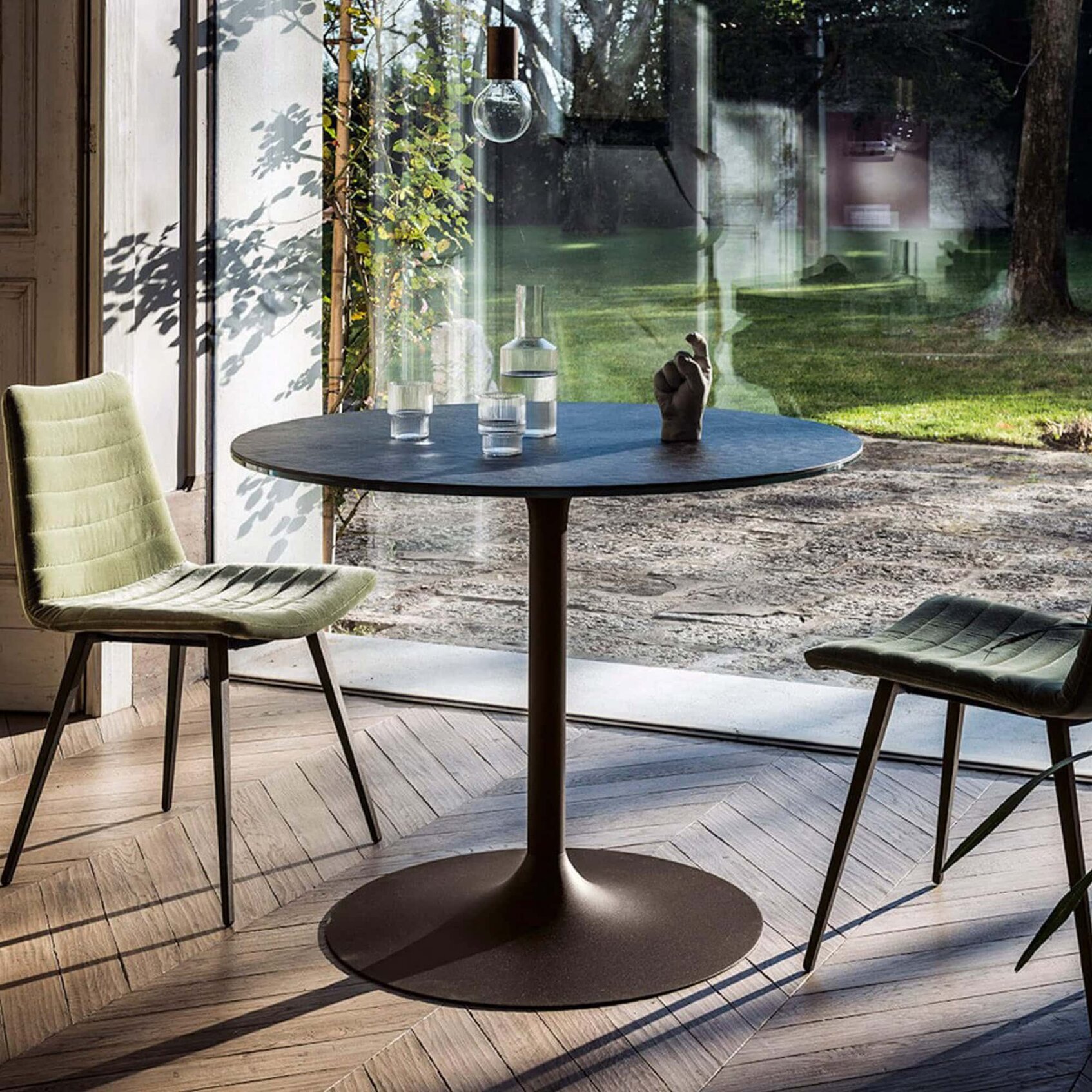 Available in six top diameters—from a compact Ø60 cm to a generous Ø120 cm—the Infinity table adapts beautifully to various layouts and room sizes. The central base is offered in a broad spectrum of lacquered metal finishes, from soft neutrals to bold statement hues. Tabletops come in a range of material options including melamine, fenix, laminate, HPL, crystalceramic, and tempered glass, providing the freedom to customize the table to your vision.