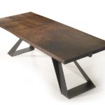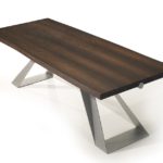 The Karma Dining Table is a centrepiece that catches the eye, with modern lines and an elegant form built on a symmetrical base. A minimal design allows this piece to elevate the contemporary dining space. The dark multilayered poplar wood of the piece is available in a smoked oak or sycamore veneer, with a powder-coated metal base. Warranted to meet or exceed industry standards.