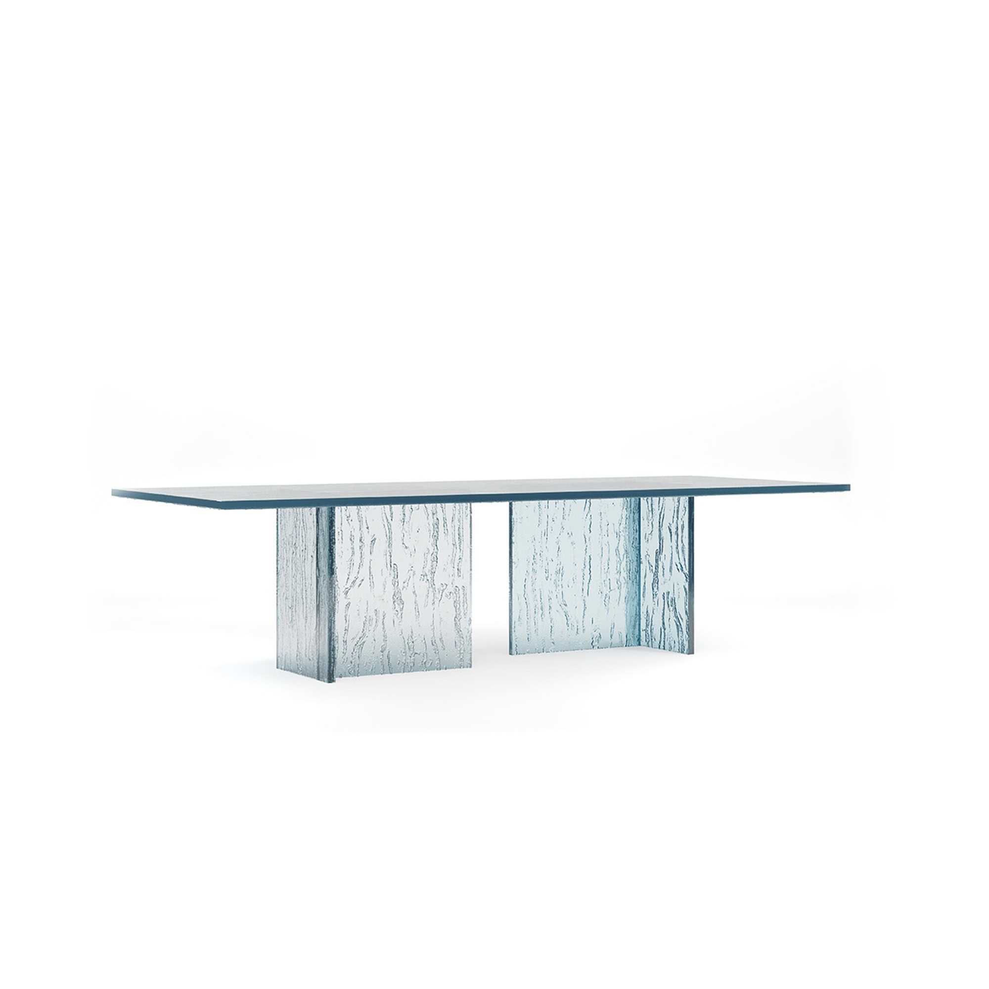 The Laguna 72 Dining Table is an exquisite expression of traditional glass artistry and contemporary design. Handcrafted by master glassmakers, its solid fused glass construction exhibits natural, organic beauty with a distinctive, irregular texture and sculpted underside. Each table is a unique, luminous centerpiece that captures and refracts light in a way that transforms any space.