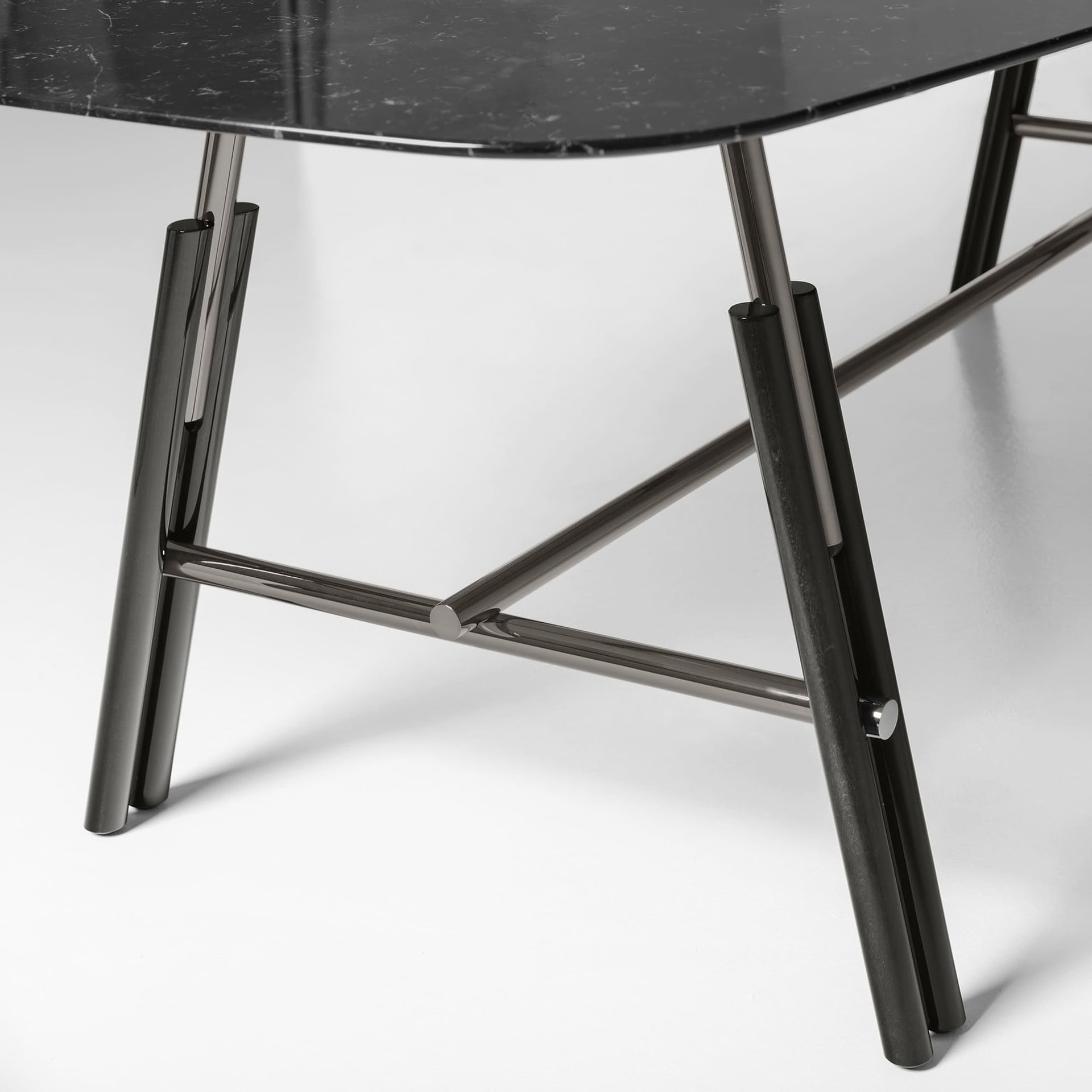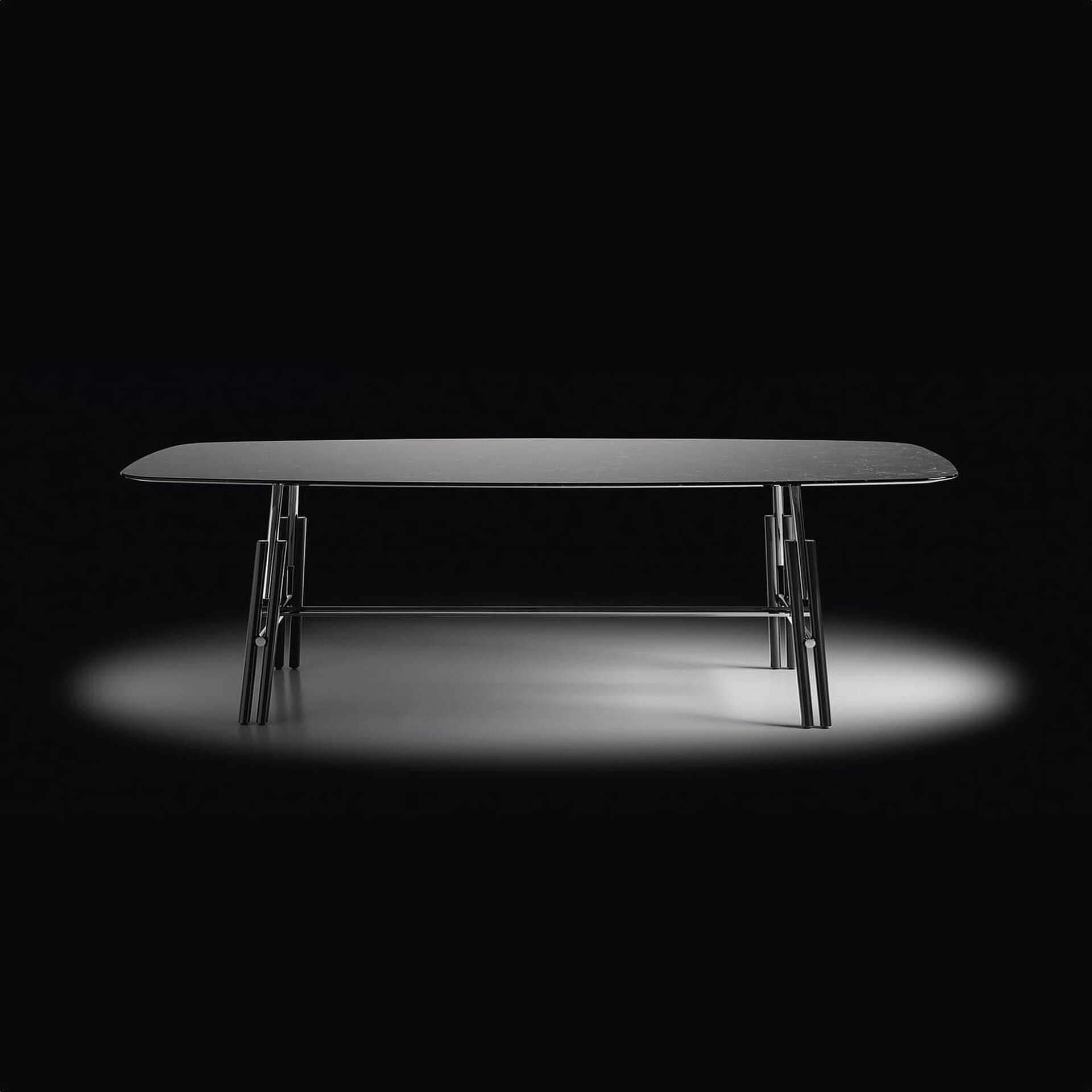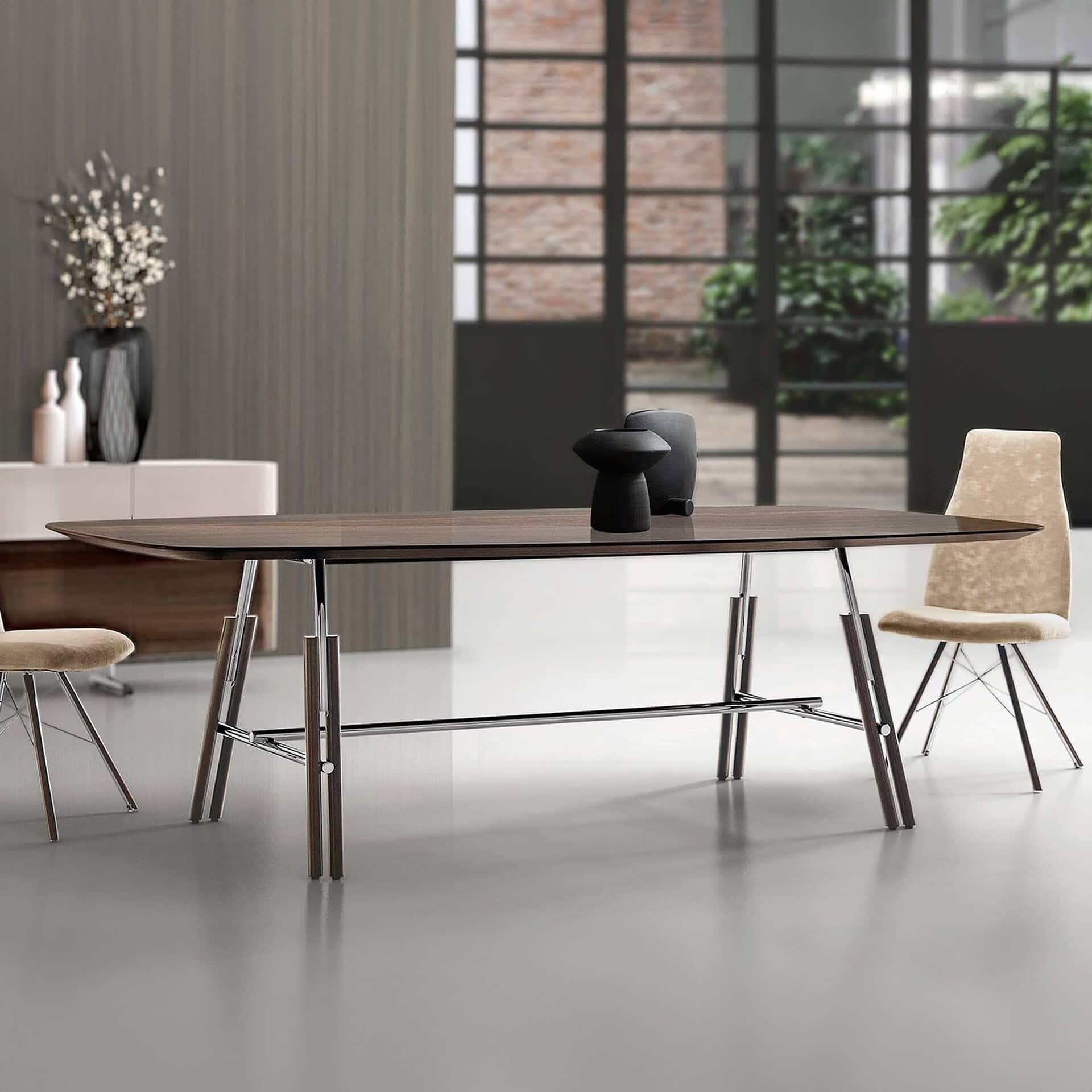 Its clean and bold lines, accentuated by a sturdy metal structure, blend beautifully with the warm wood, creating a striking visual effect. This table stands as an exemplar of exquisite craftsmanship and design, with meticulous details and an engineering masterpiece that hides any visible screws, making it a versatile and charming centerpiece in any setting, from dining rooms to executive offices.