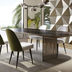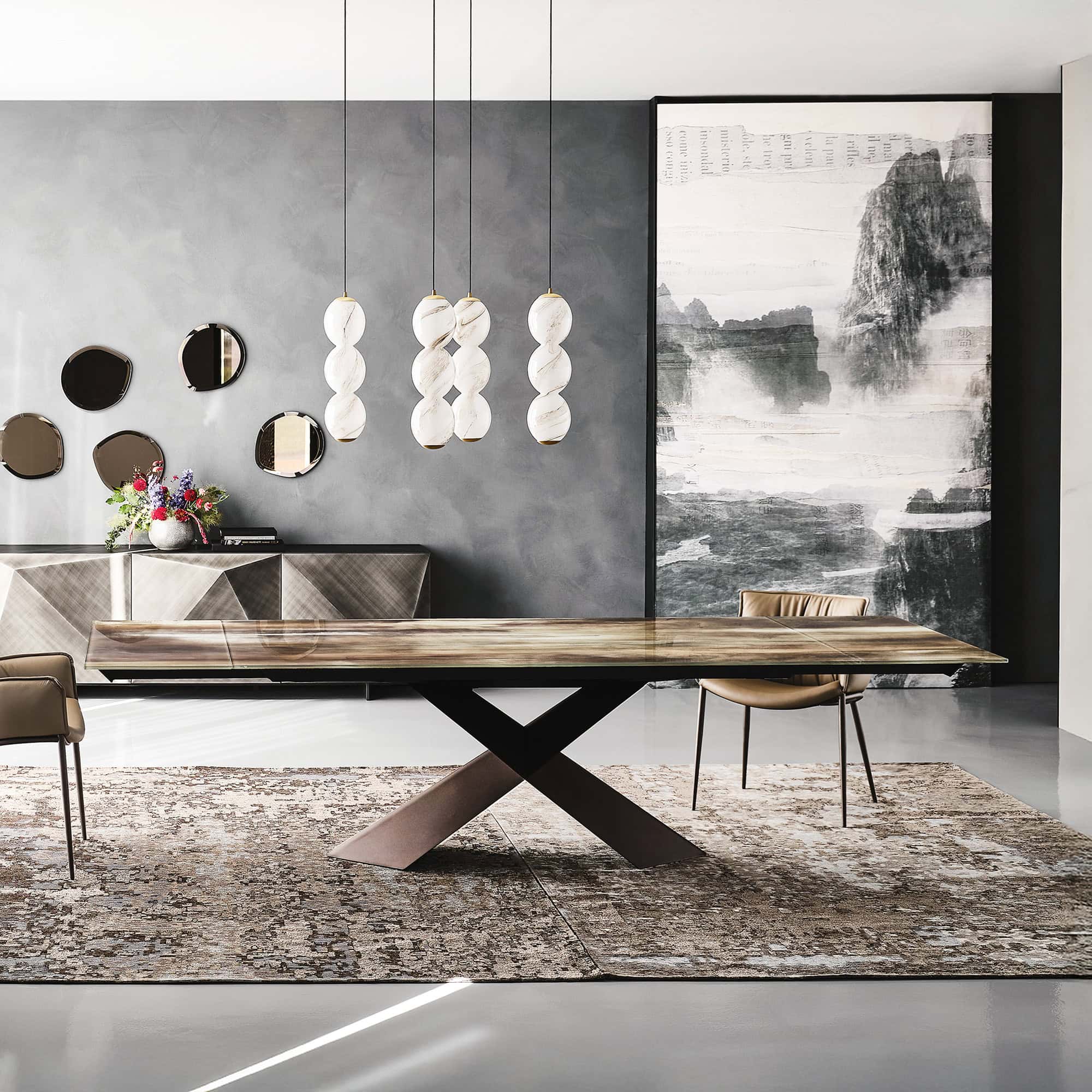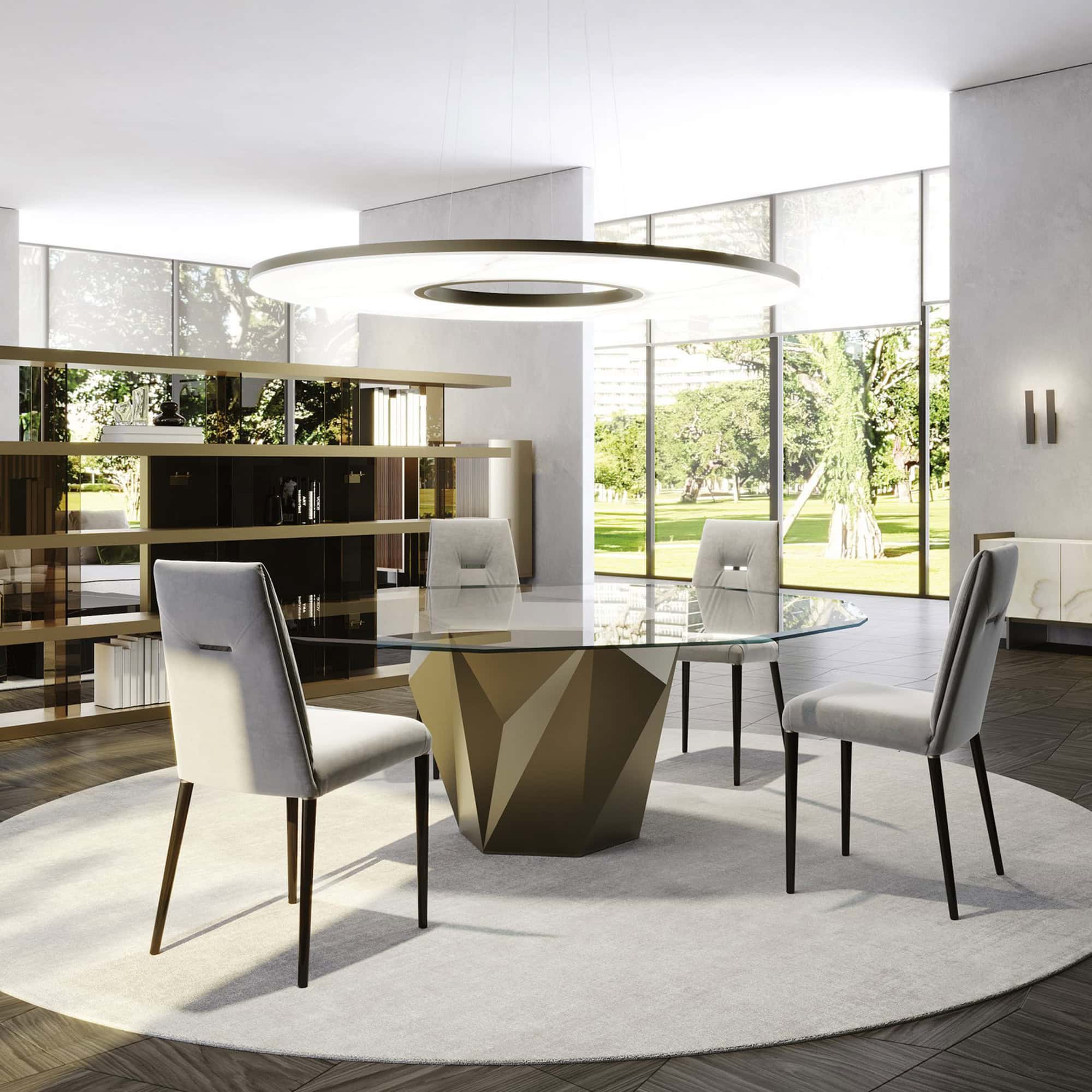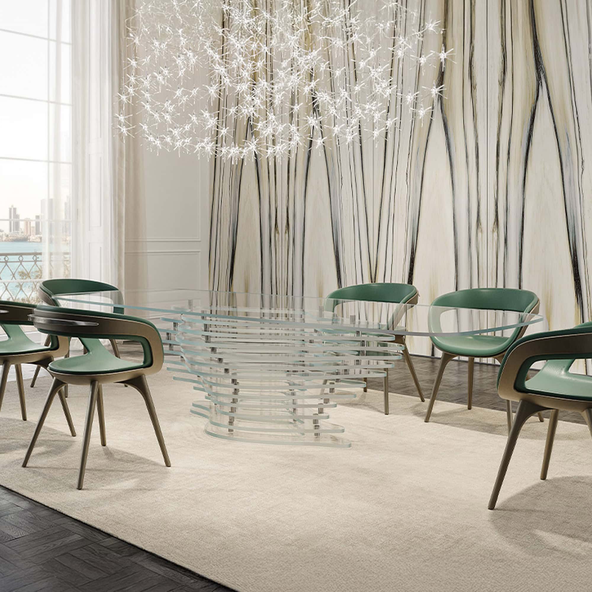 The Monolite 72 Dining Table combines elegance and style with its beautifully engraved glass legs available in transparent, bronze, or smoked-grey options.