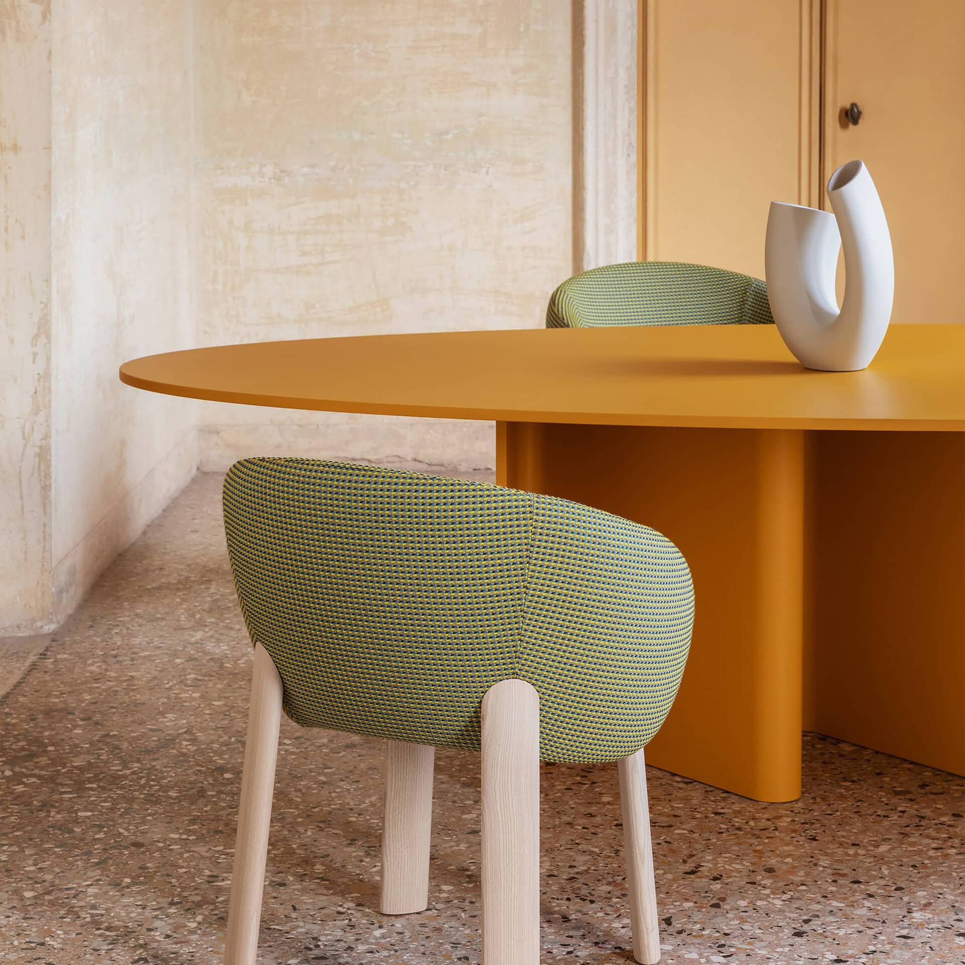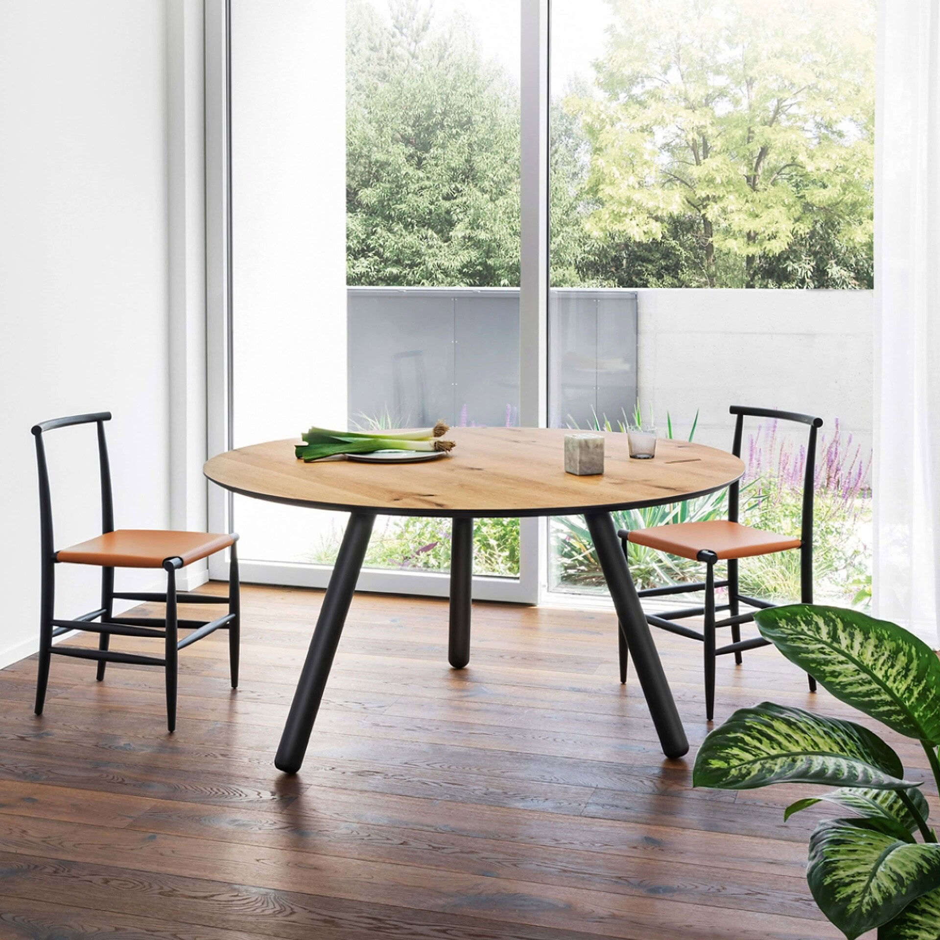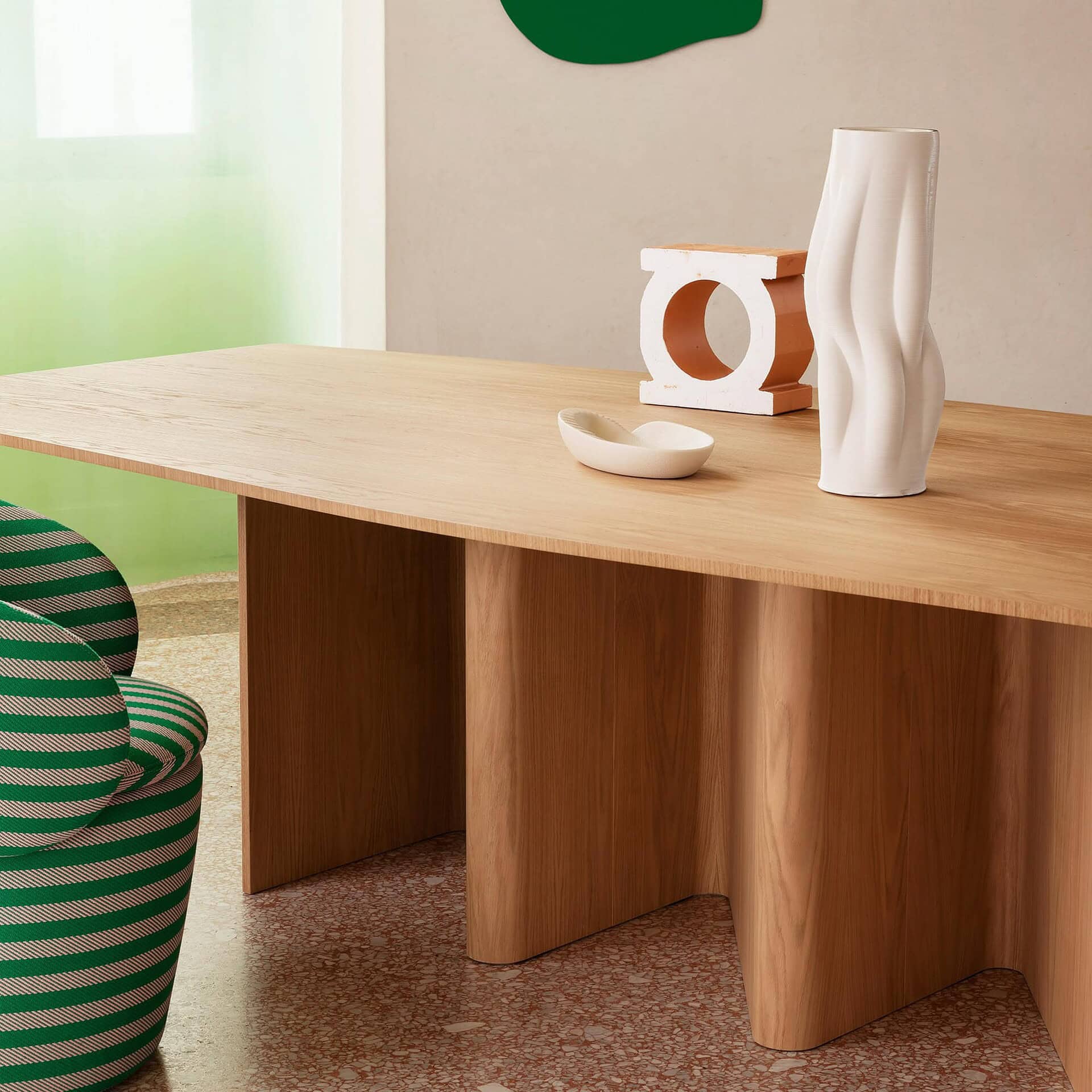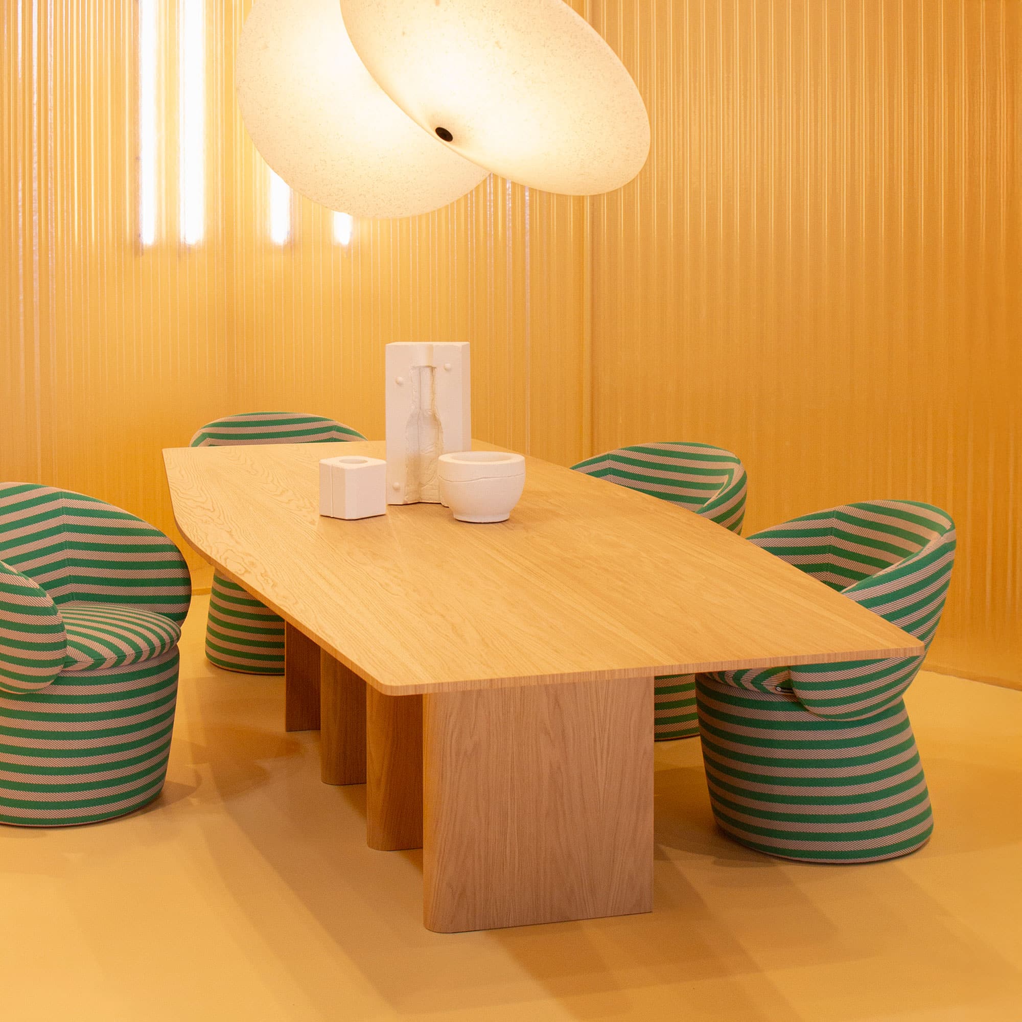 Crafted with a bent wood base and available in a selection of rich finishes, Nami’s table tops can be round, oval, barrel-shaped, or rectangular, in sizes from 130 cm to 300 cm. Finishes include lacquer in 13 NCS-matched hues, premium woods like Flamed Oak, Canaletto Walnut, or Black Ash, and select options in luxurious marble or stoneware such as Calacatta Black or Statuario Bianco. With its sculptural form and versatile customization, Nami is a refined yet distinctive centerpiece for any dining room.