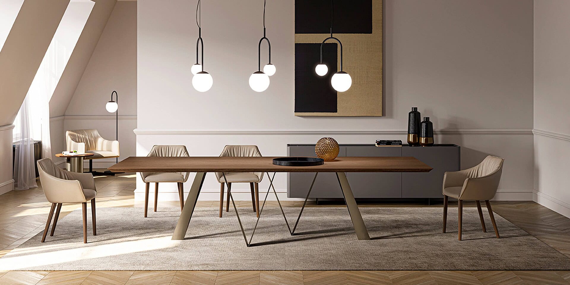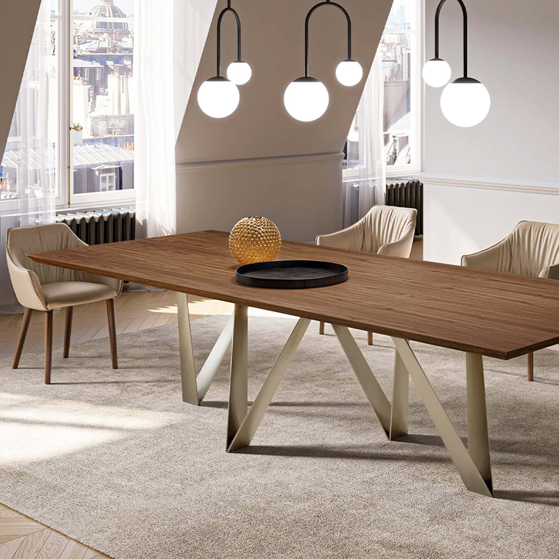 The Noa Dining Table is symmetrically elegant and refined for the dining room. With ample space to serve and entertain, this is a bold choice that will leave a lasting impression for years beyond. This is a timeless dining table that will never go out of style, featuring a painted metal base and top in veneered wood round, rectangular or shaped, with oblique edges in 38 mm thickness.