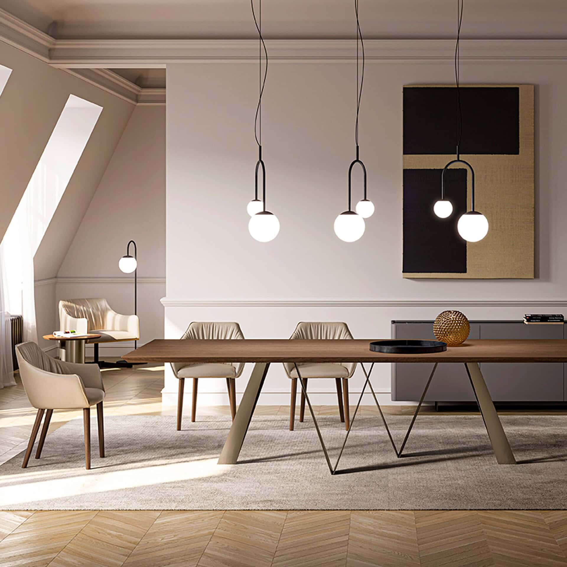 The Onda collection is offered in a wide range of premium tabletop options—including ceramic, ceramic King, glass, wood, marble, and wood with ceramic—each crafted to enhance the sculptural base beneath. Ceramic tops combine tempered glass with refined ceramic slabs for durability and visual depth, while marble and wood options introduce natural warmth and material richness. Select versions are available with rounded or oblique edges, lacquered wooden frames, or dual-surface compositions, depending on configuration. The number and positioning of the metal legs vary according to table size, ensuring structural balance and visual harmony across all formats. Optional Lazy Susan trays are available on round configurations, enhancing both function and conviviality.