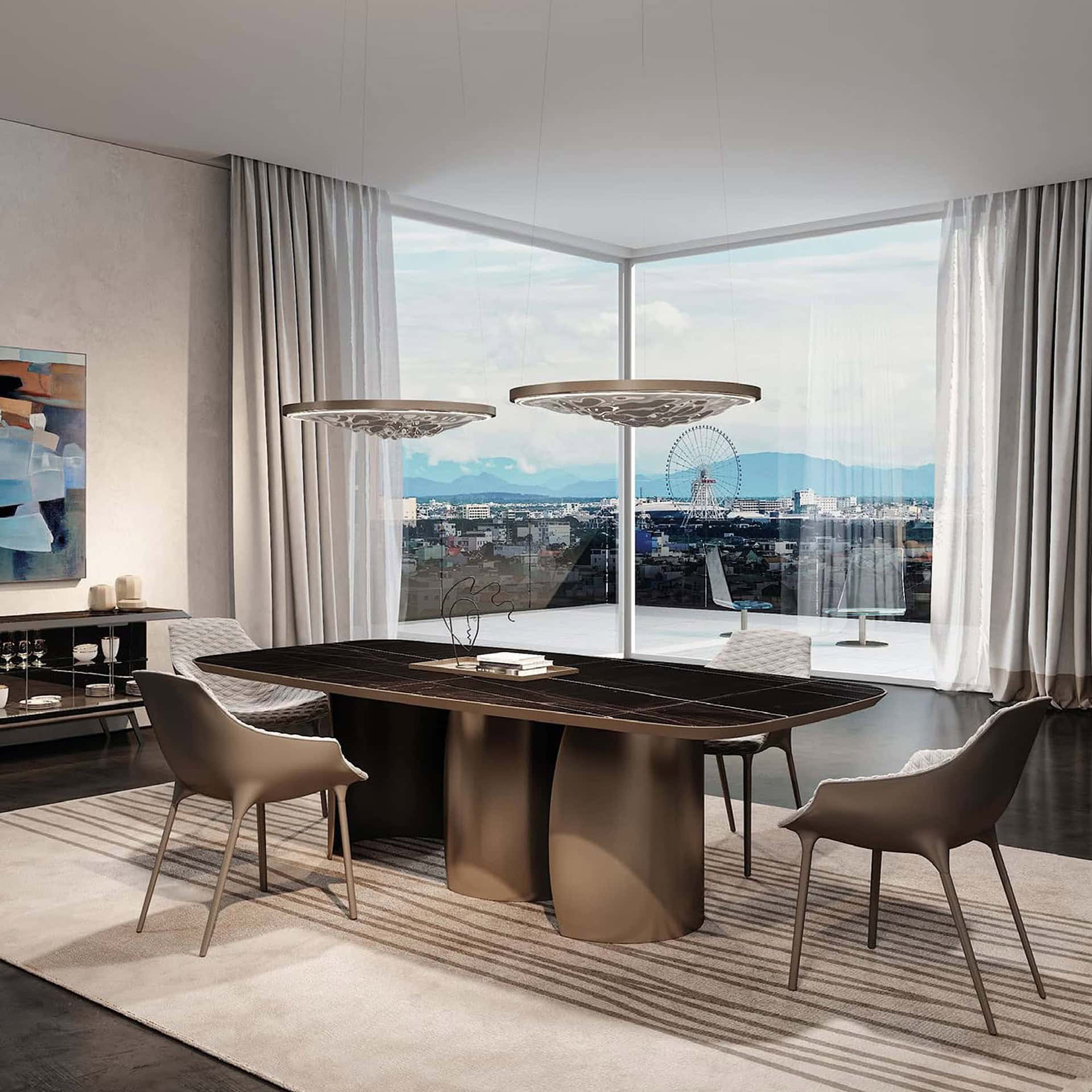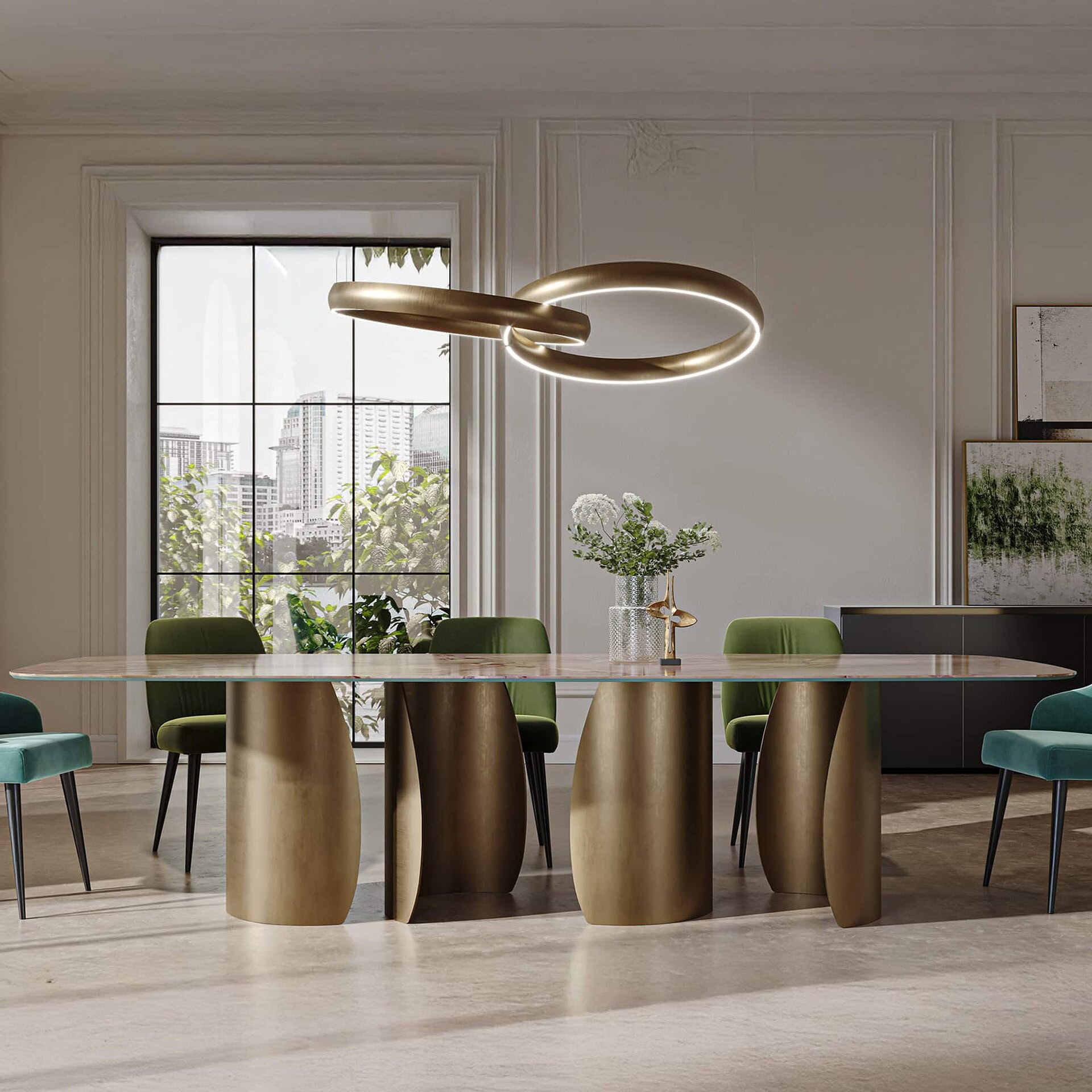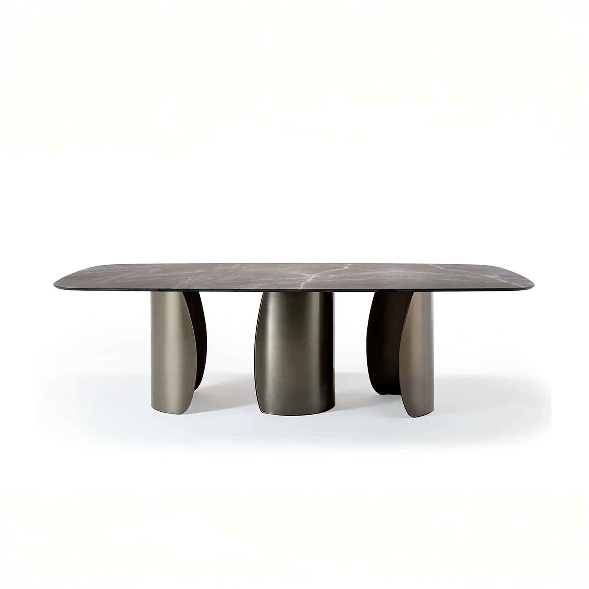 The Petalo 72 Dining Table, designed by Tulczinsky, is a sculptural expression of refined Italian craftsmanship. Featuring gracefully curved bases in 10mm-thick extra-clear glass with internal finishes in Bronze, satin brass, satin dark brass, or satin titanium, the table balances lightness with luxurious presence. Its dynamic silhouette makes it an elegant centerpiece that merges seamlessly into modern interiors.