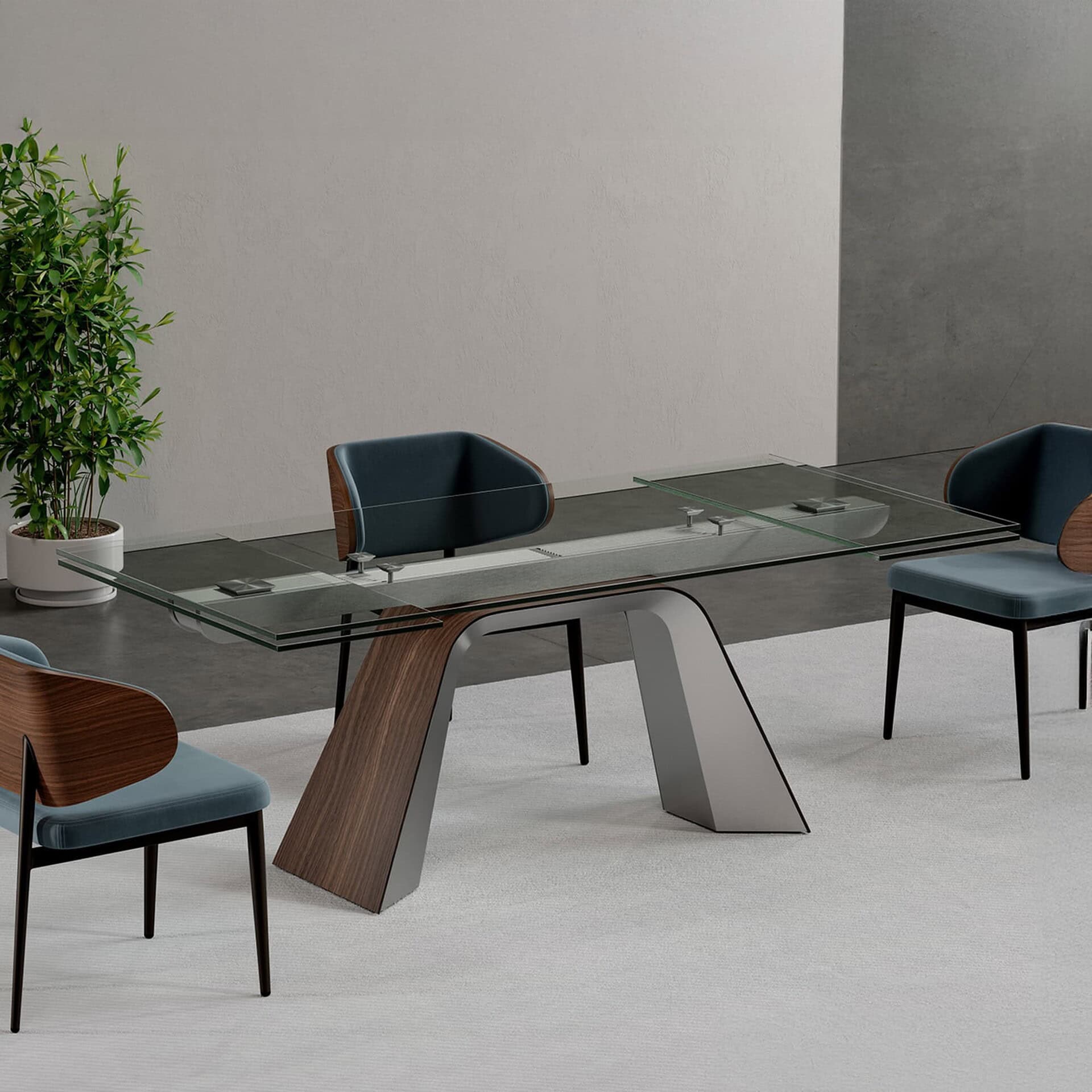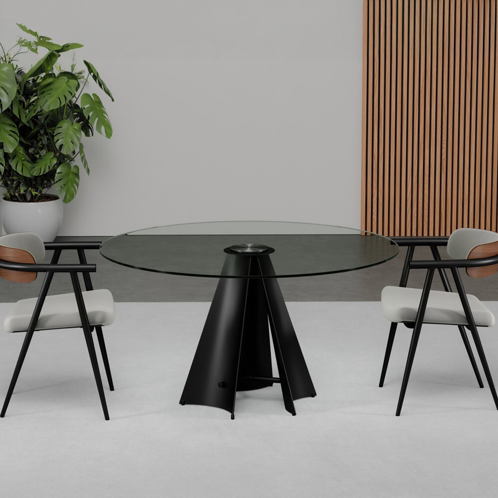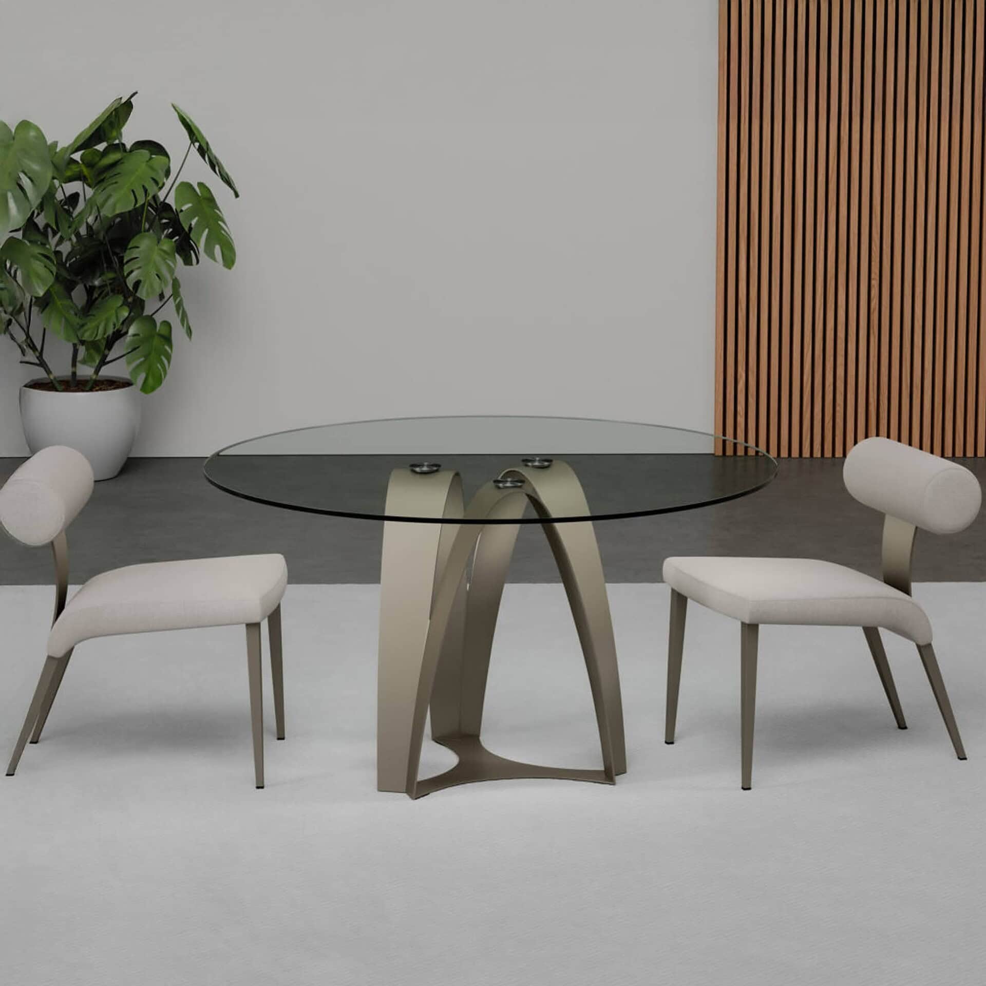 The Pinnacle Dining Table embodies architectural elegance with three sculptural steel pillars rising in inverse arcs to cradle a clear tempered glass top. These curved forms converge at the center to create a dynamic yet stable base that commands attention while maintaining a sense of lightness. The design is a celebration of structural grace, making it an ideal statement piece for modern interiors.