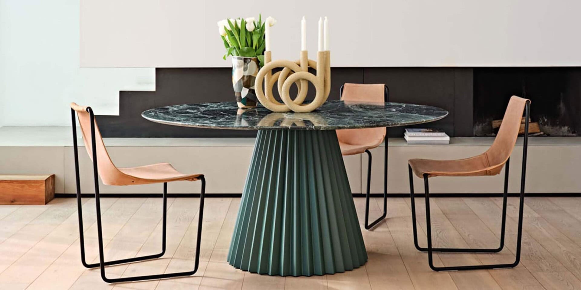 The Plisse Dining Table from Midj is perfect for modern dining rooms. It features a large, round top finished in marble and a striking base with sharply angled ridges. Add a matching lazy Susan to make buffet-style meals a breeze. Choose from two sizes with a selection of marble finishes and metal base colors. Designed by Paola Navone, the Plisse Dining Table is an elegant and functional addition to any home.