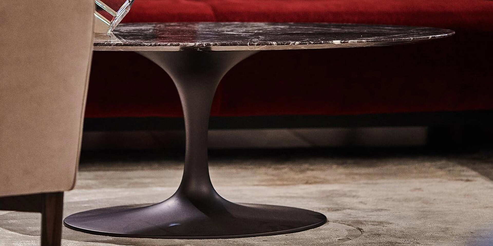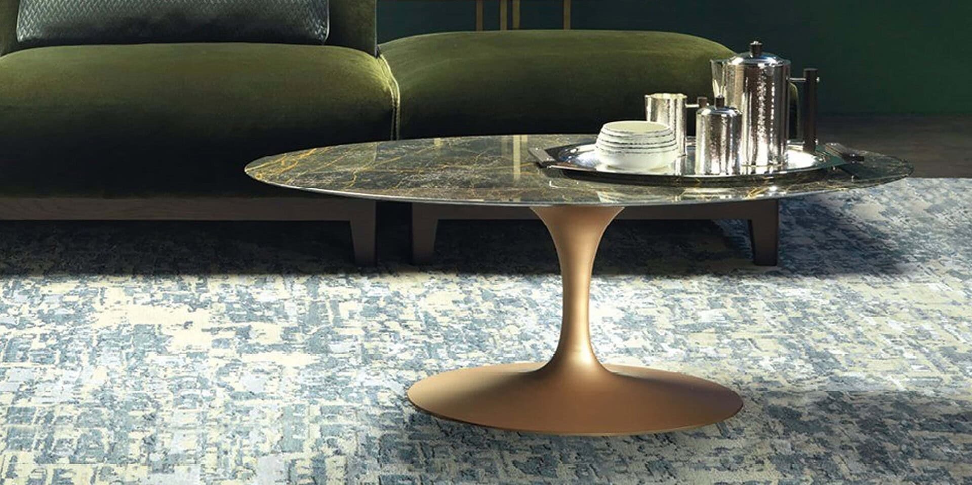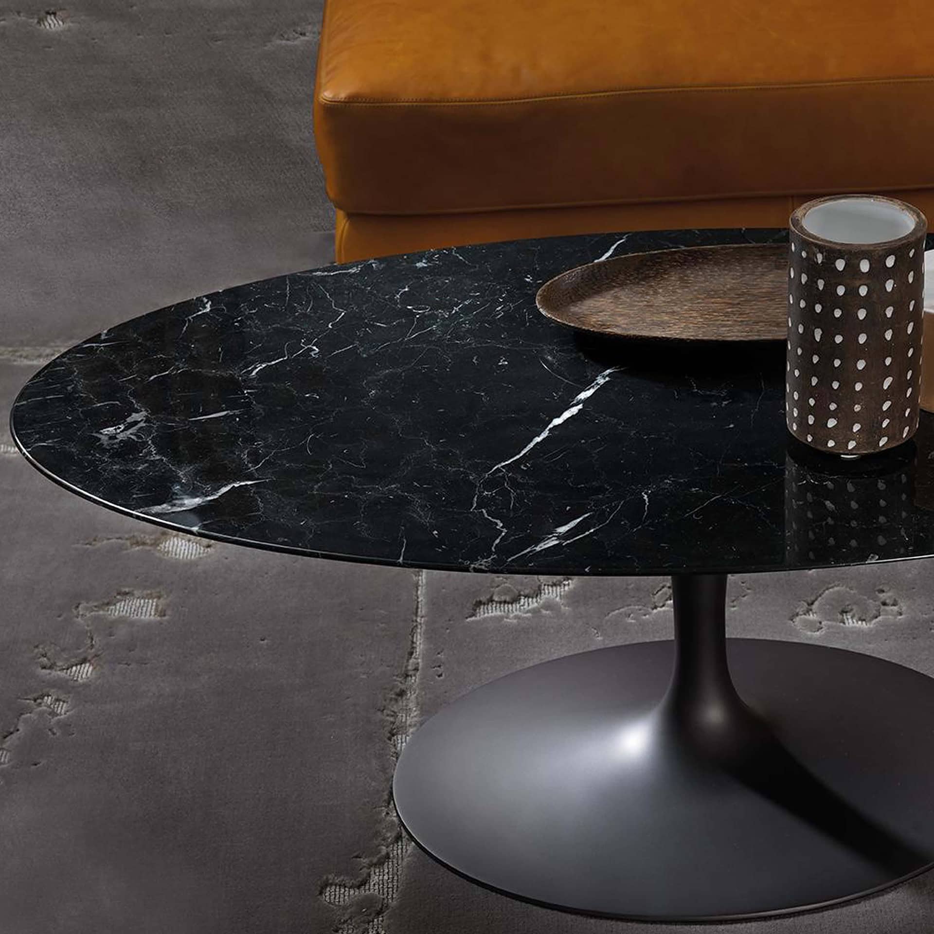 The Saar Coffee Table by Borzalino is offered in a wide range of natural stone and marble finishes in different colors and shades, as well as glossy and matte options. This coffee table is ideal for placing in front of a sofa in a chic and sophisticated living room. Without any edges or perimeter legs, this table stands out for its stem-like structure, with a curved central base in powder-coated cast aluminum in six finishes, or in sunset copper matte lacquer.