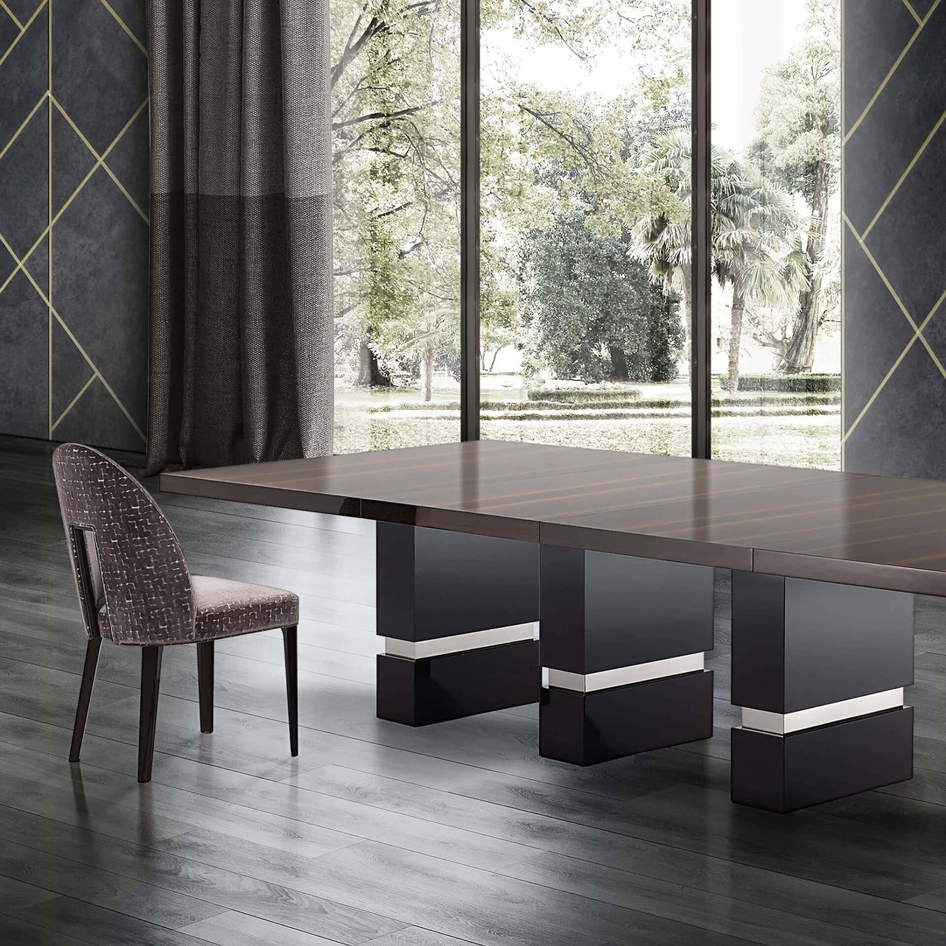 The Solution Dining Table is made of wood with a linear design that highlights the shapes' impeccable geometry. The table top comes in a variety of essences that seamlessly blend into any setting, and the base is enhanced with precious metal details. Both in terms of length and width, the customization is made to be as flexible as possible.