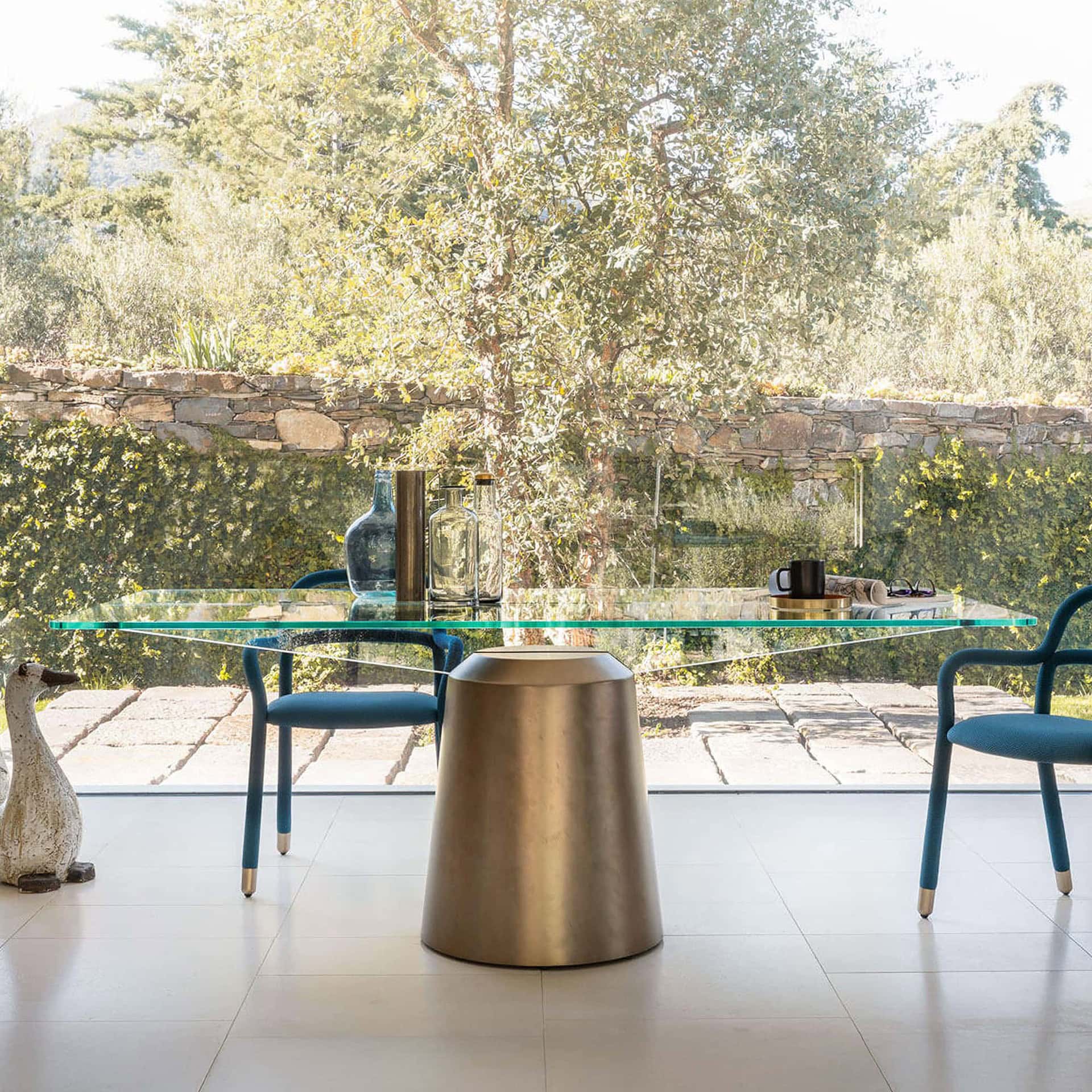 A study in contrast and innovation, the Spike Dining Table by Giulio Iacchetti seamlessly blends futuristic design with Italian craftsmanship. Its standout feature is the illusion of a floating top—crafted in either transparent or glossy fumé glass—elevated by an intersecting vertical glass plate anchored to a sleek cylindrical base. The table's bold geometry and unique composition make it the centerpiece of any contemporary dining space, effortlessly drawing the eye while remaining elegant and refined.