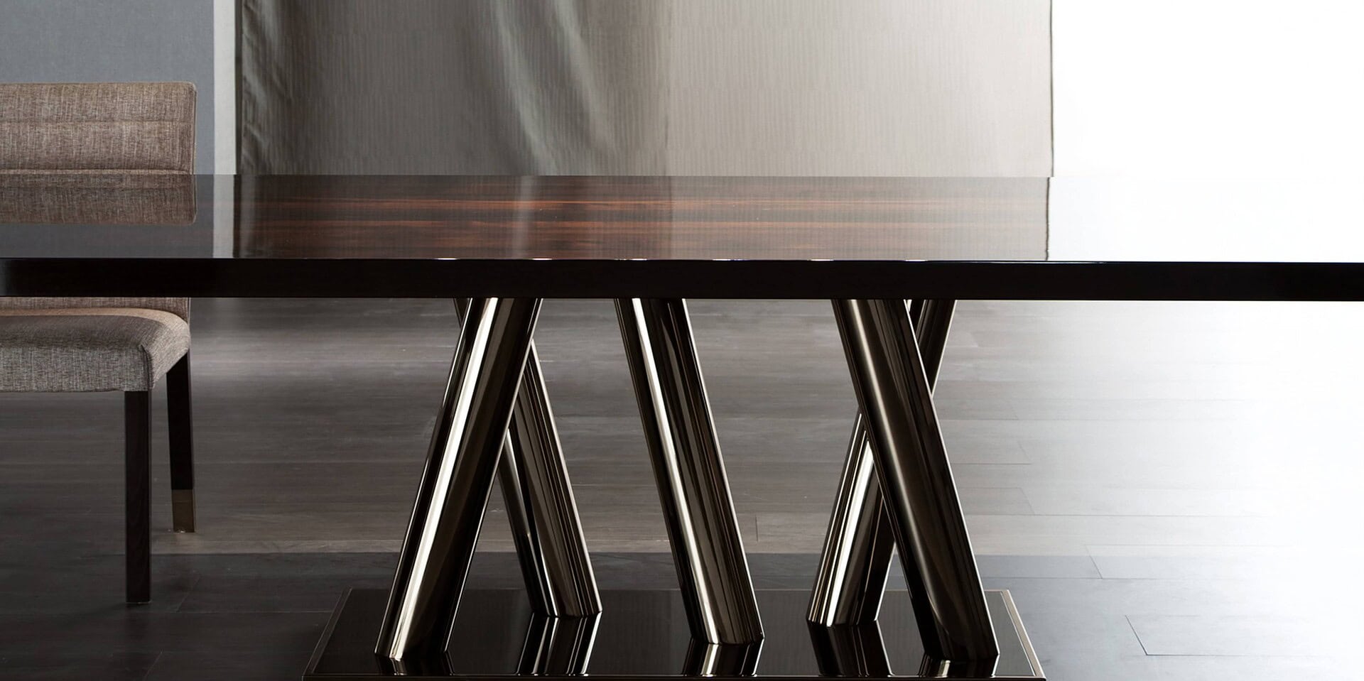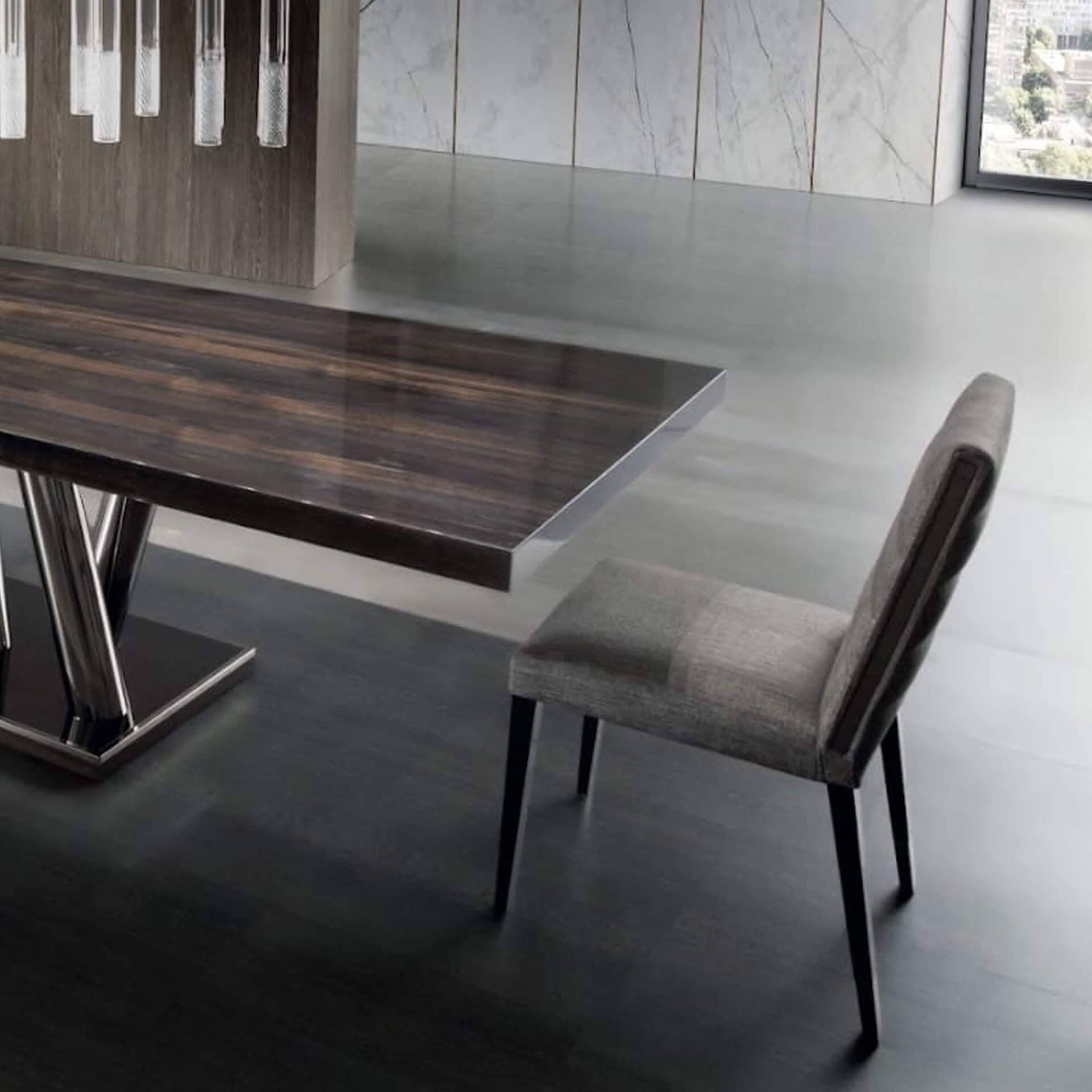 The Status Dining Table is a classic addition to a modern dining room, and its gleaming sculptural legs make it a focal point.