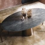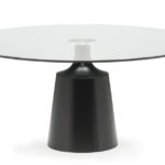 The Yoda Dining Table is built with your choice of a satin titanium steel, white, black, or graphite base THe round top is made of 15mm clear or extra clear glass with bevelled edges. The satin titanium base is hand-glazed. Warranted to meet or exceed industry standards.