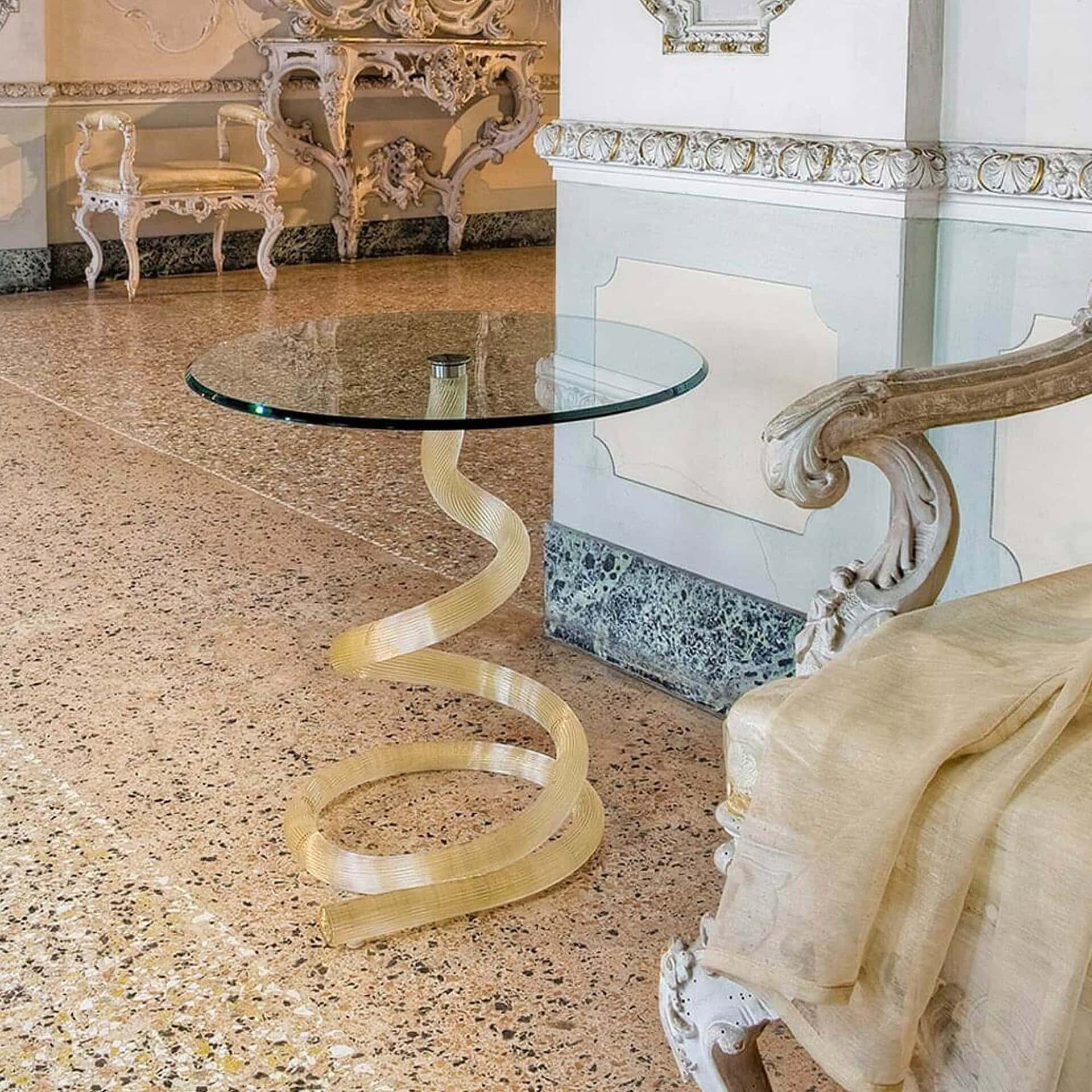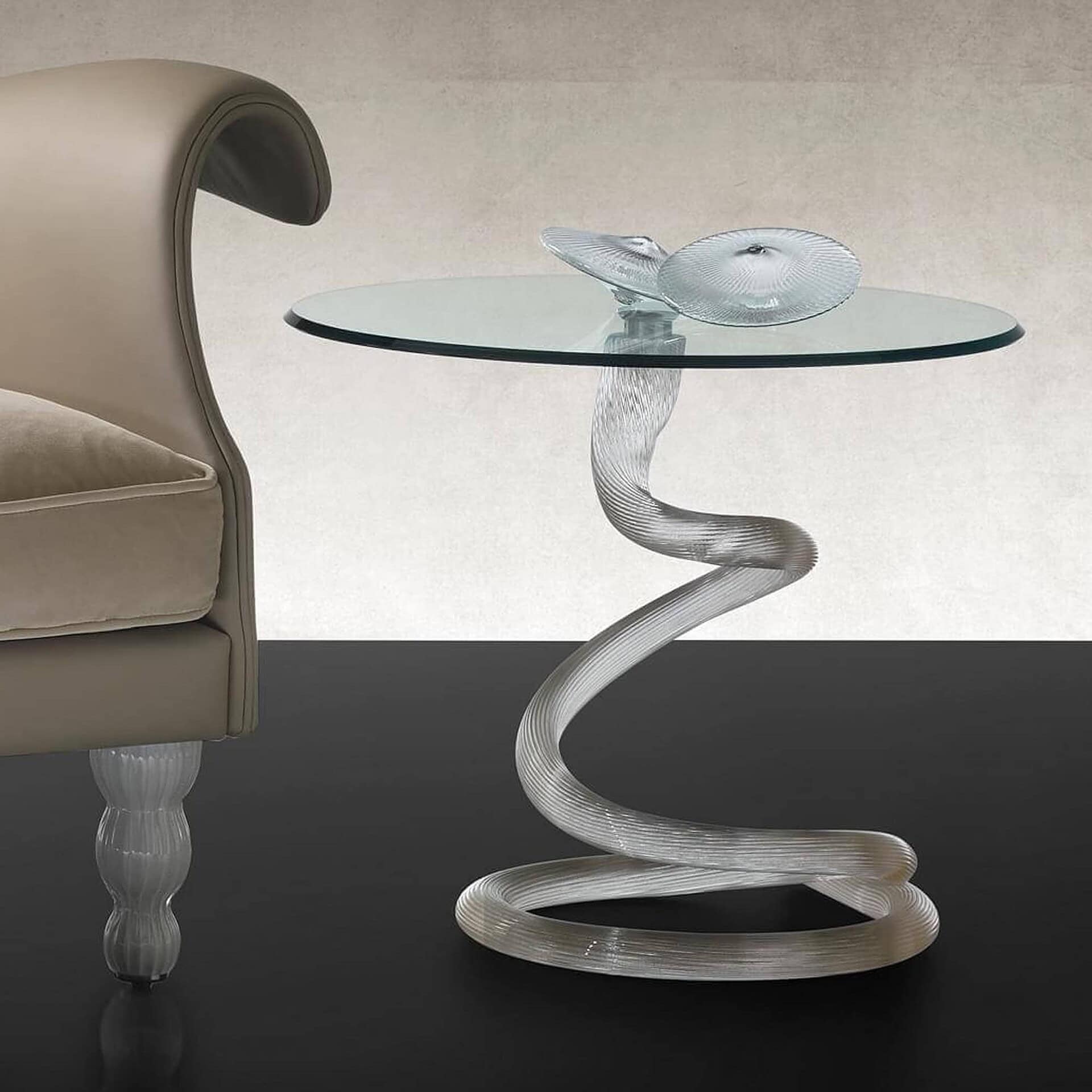 The Ghibli Side Table by Tulczinsky is a sculptural accent piece that blends artistic craftsmanship with modern glamour. Its striking profile is defined by a finely ribbed Murano glass base, available in a range of dramatic tones that refract light beautifully. Topped with a bevel-edged round glass surface, the Ghibli brings a sense of refinement and visual lightness to living spaces, making it a perfect companion to luxurious seating or as a standalone statement.