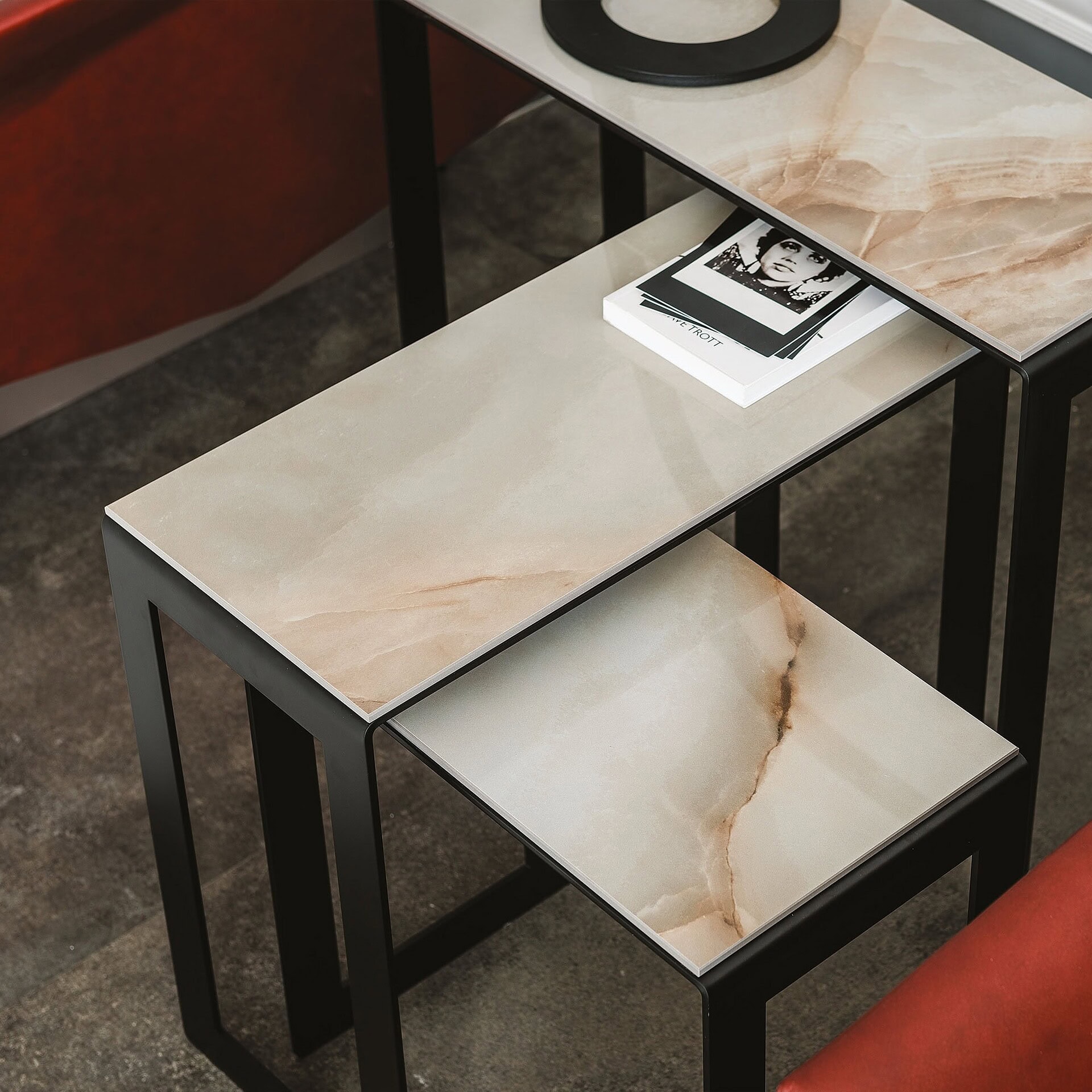 A modern solution for versatile living, the Kitano Tris Stacking Tables are a sculptural set of three coffee tables that nest seamlessly together or can be spread out for a dynamic visual effect. Designed with layered functionality in mind, each piece sits at a different height and size, creating a visually engaging composition when arranged together. The clean metal bases offer stability and style, while the ceramic tops add a luxurious, tactile surface that’s both durable and refined.