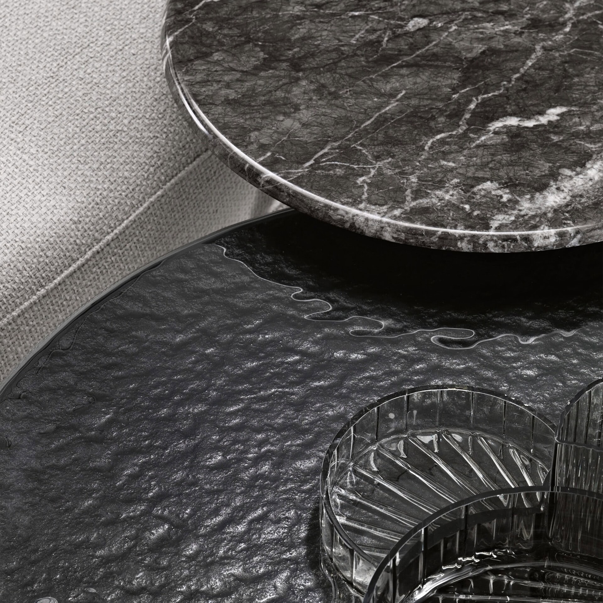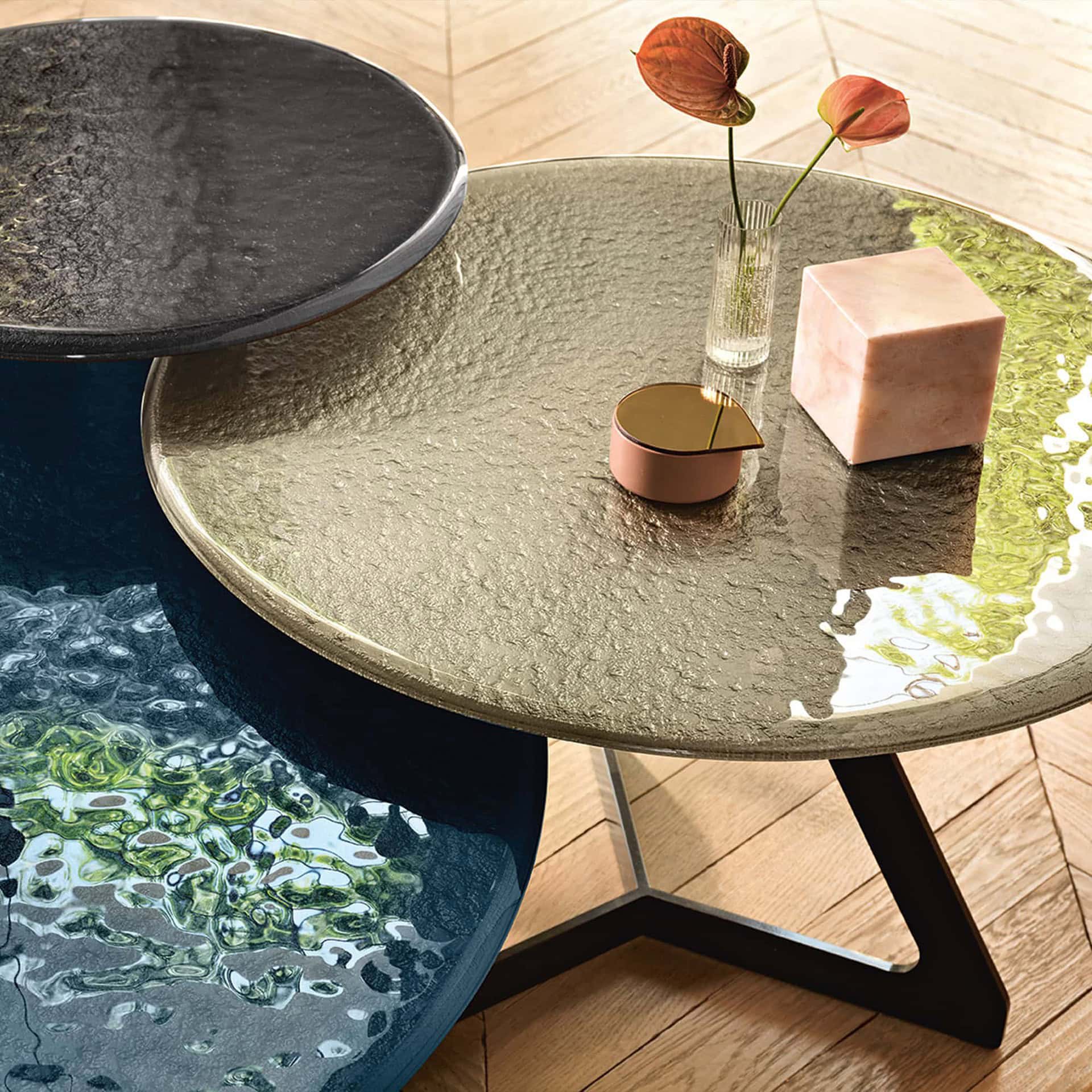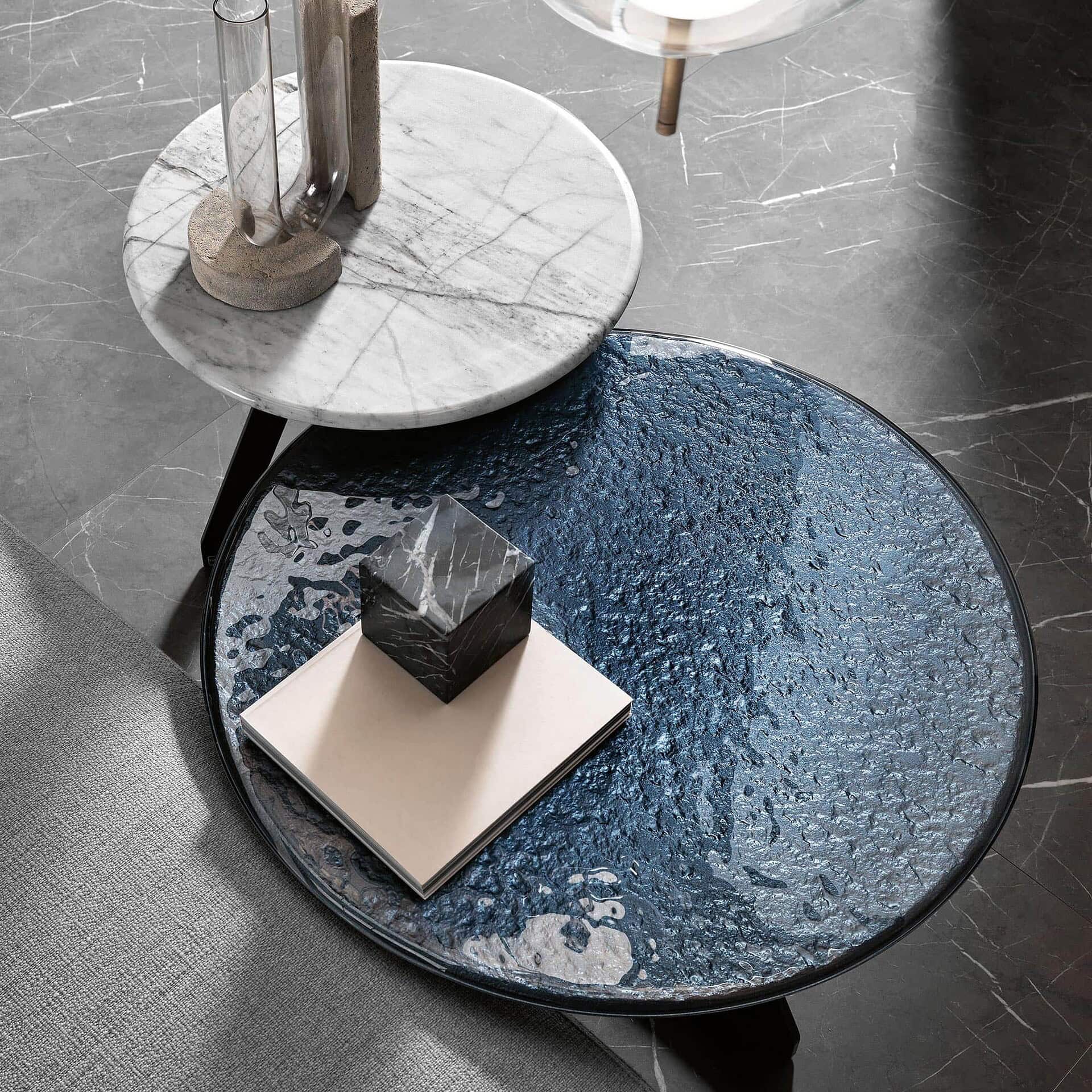 Perfect as a centerpiece in a lounge or paired in varying sizes for a layered look, the Lakes Coffee Table balances beauty with durability. The metal base, available in Lava Grey or Metallic Champagne, provides a stable foundation while complementing the chosen top finish. Whether styled with statement décor or left unadorned to showcase its material beauty, Lakes adapts effortlessly to diverse aesthetics. Manufactured in Italy, it embodies FIAM’s dedication to innovation and quality, making it a lasting investment in style.
