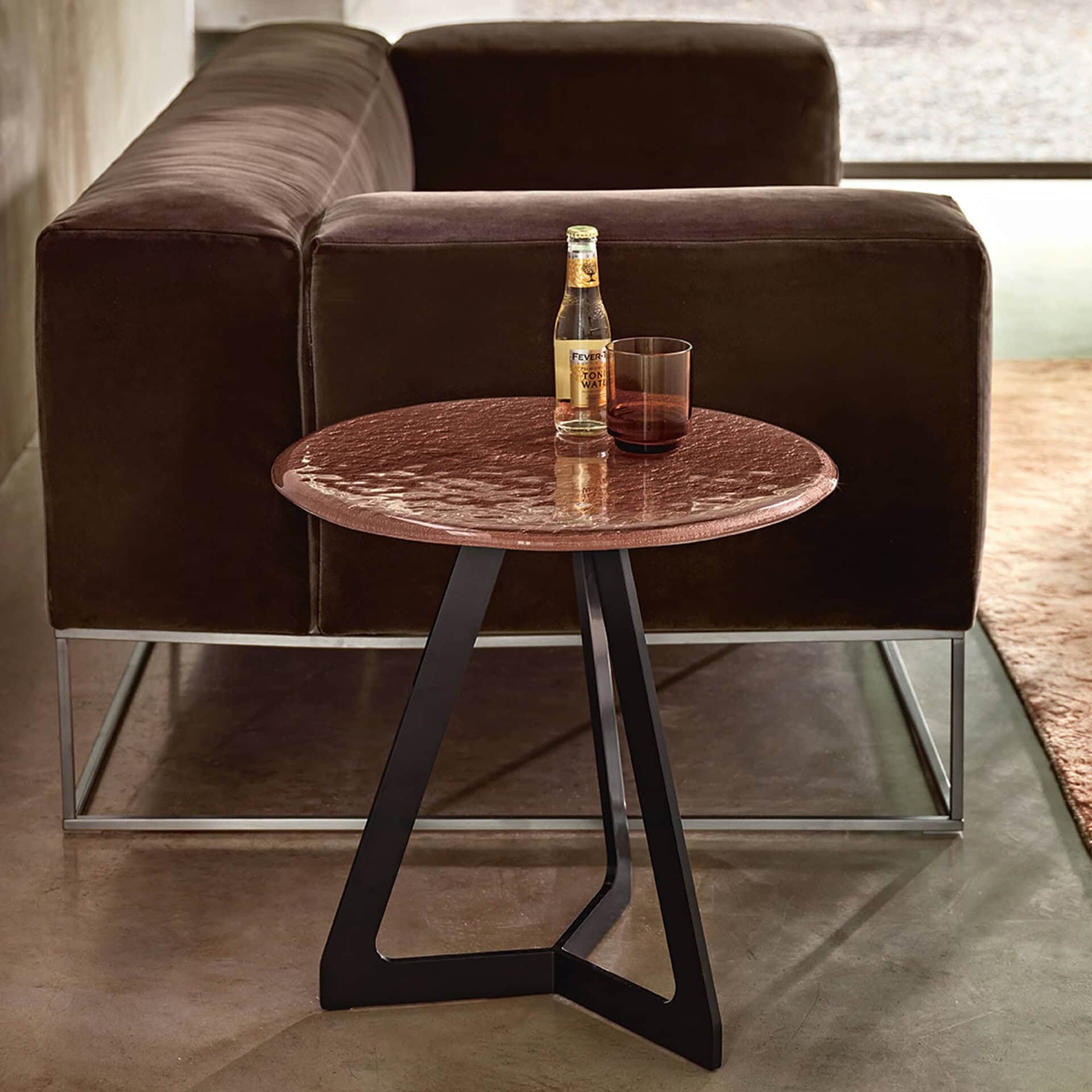 Designed by Studio Klass, the Lakes Coffee Table blends modern sophistication with artisanal craftsmanship, offering a sculptural focal point for any living space. Its striking round top is available in two luxurious versions: a ⅜″ thick fused, back-lacquered glass finished in rich metallic hues, or a ¾″ thick marble surface that adds timeless elegance. The distinctive texture of the fused glass catches light beautifully, while the marble’s natural veining ensures each piece is unique. With its sleek silhouette and harmonious proportions, Lakes is ideal for contemporary interiors seeking both function and refined style.