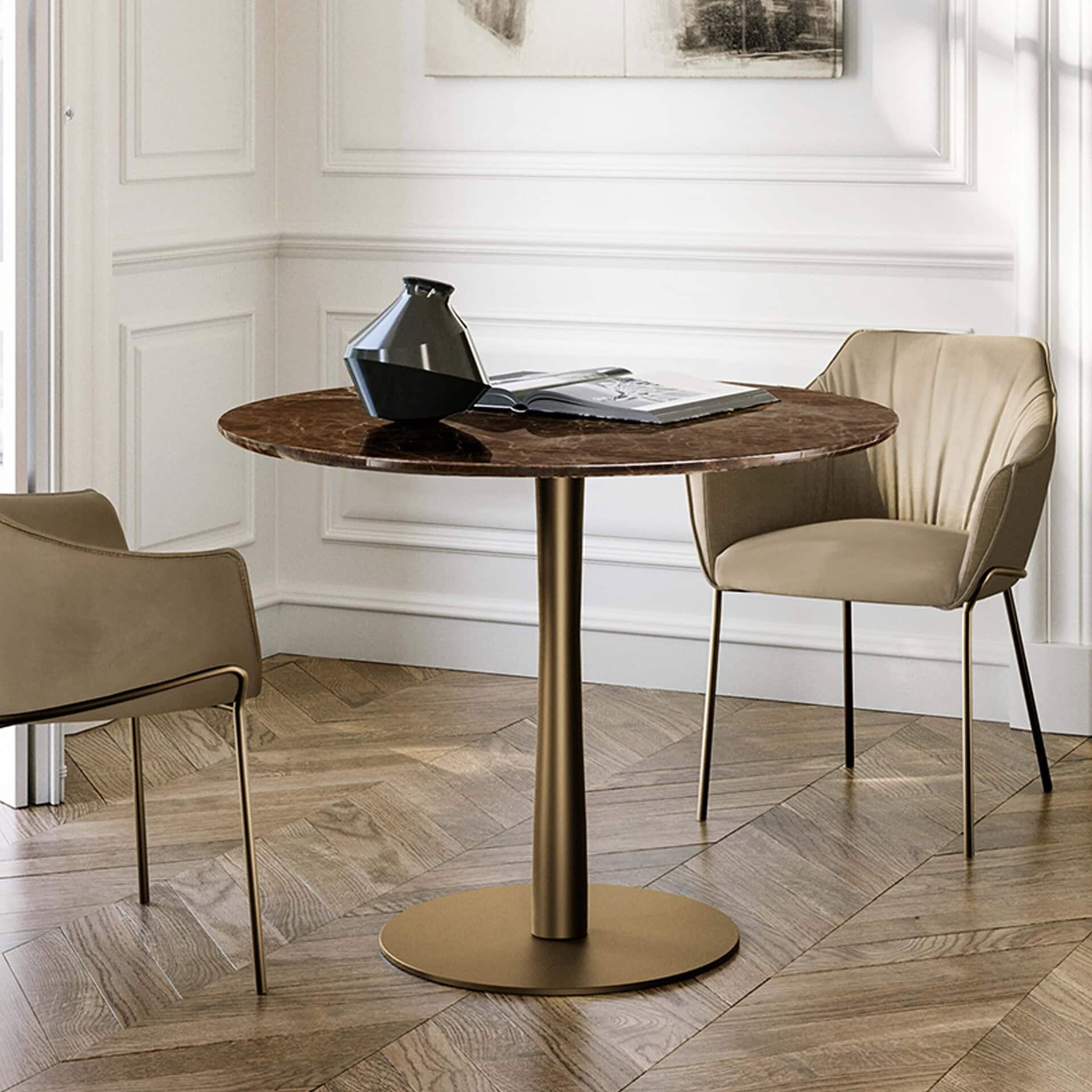 Filù is a dainty yet striking bistro table designed to make heads turn. Whether you're looking to upgrade a kitchen or dining space minimally or drastically, the Filù Bistro Table is a stellar choice when it comes to sleek and effortless style. This bistro table features a painted metal base and glossy marble top with oblique edges in 20 mm thickness.