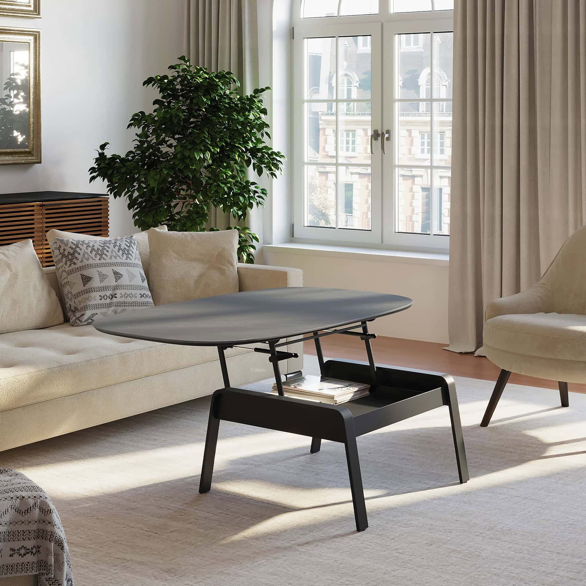 The Cloud 9 Lift Top Coffee Table is a masterclass in motion and minimalism, effortlessly bridging the gap between functionality and refined design. Designed by Matthew Weatherly, this multifunctional piece features a porcelain tabletop that glides to a raised position, ideal for working from your sofa or enjoying a casual meal. The lift-top opens smoothly with pneumatic assistance, while a contoured grip ensures stability in motion. A hidden, felt-lined storage compartment beneath the top keeps your essentials neatly tucked away but easily accessible. Perfect for compact or flexible living, Cloud 9 adapts beautifully to both everyday life and unexpected moments.