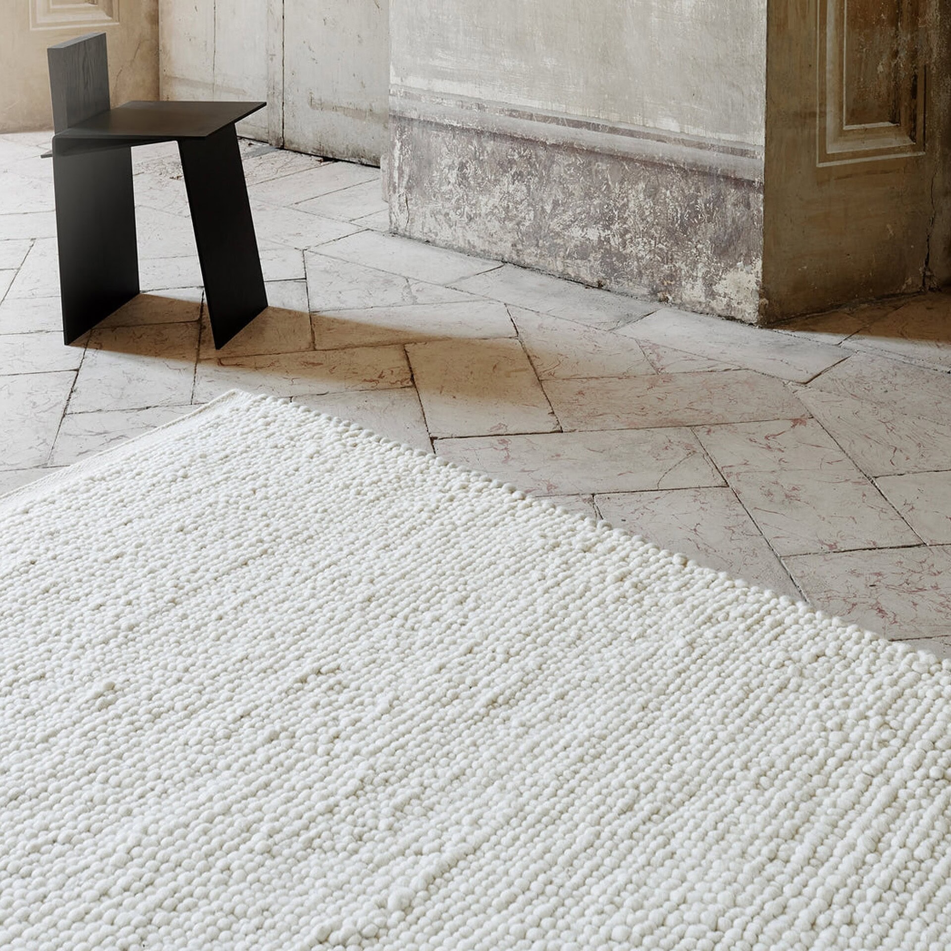 Hand-woven from 100% New Zealand wool with a cotton warp. Features a 22 mm total height for substantial underfoot texture and comfort.