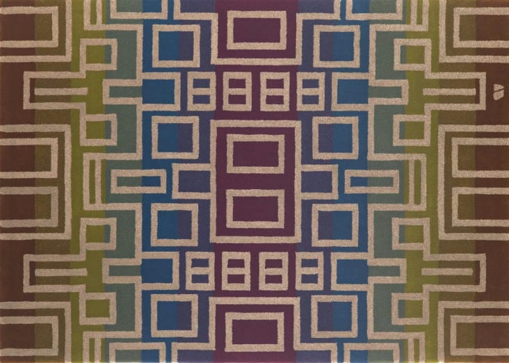 The Maze Area Rug by Dellarobbia layers a complex geometric design upon a background of delightfully colorful stripes. Part of the Arktika range.