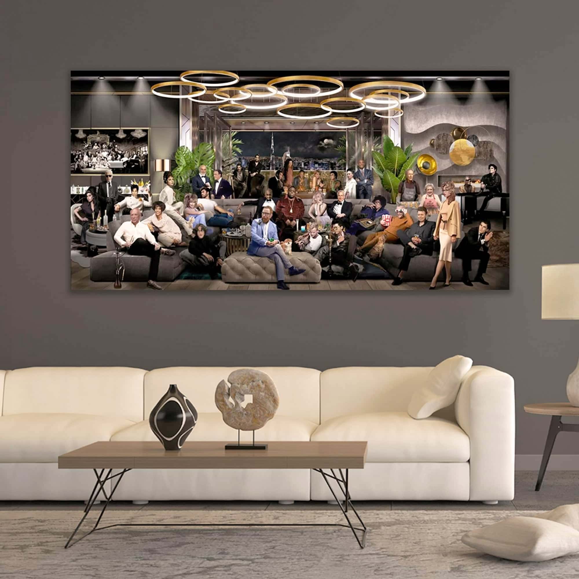 The Legacy of GOAT Wall Art by James Chiew is a striking contemporary masterpiece that brings together legendary cultural icons and visionaries in one captivating scene. Set against an ultra-stylized lounge backdrop with moody lighting and rich detail, the piece balances cultural tribute with modern design, making it both a conversation starter and a statement of influence. Chiew’s innovative fusion of analog and digital techniques gives the work unmatched vibrancy and depth, ensuring it stands out in any interior.