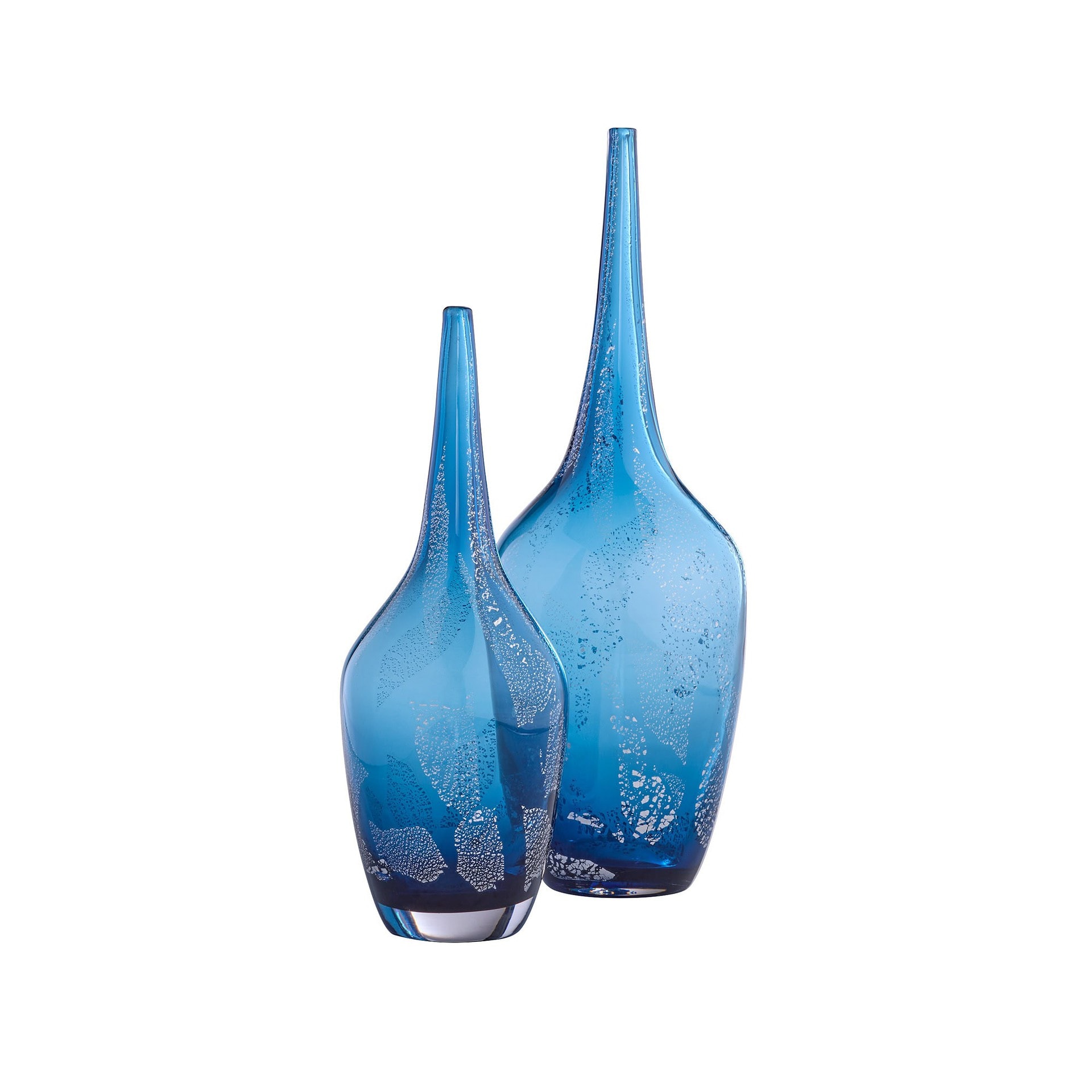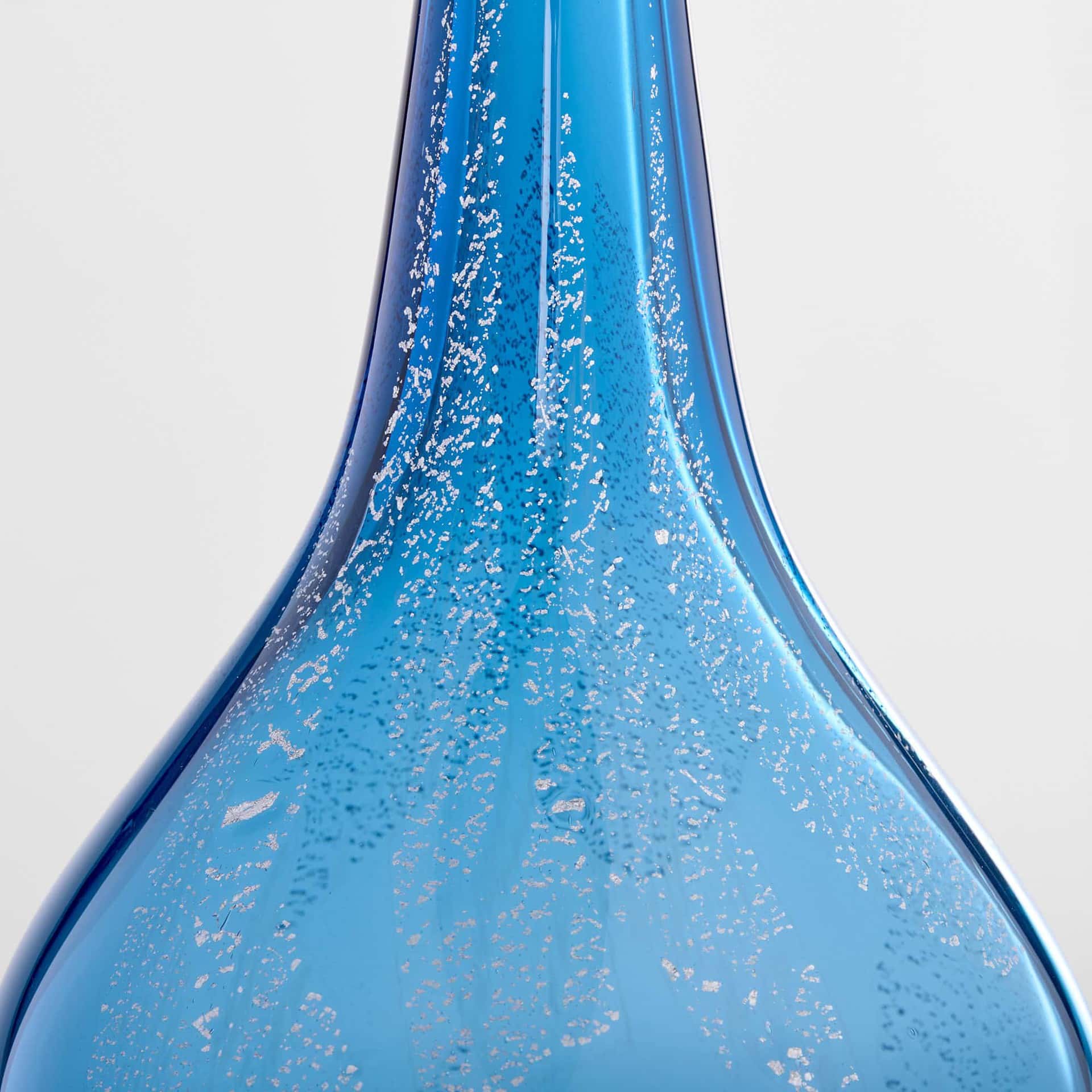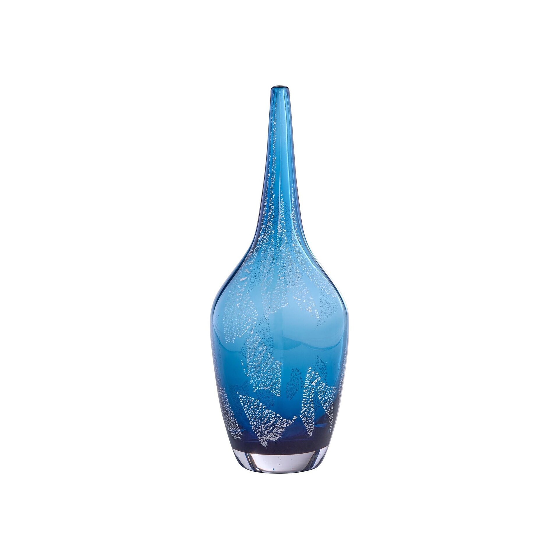 The Vero Vase delivers a captivating blend of elegance and craftsmanship, defined by its elongated neck and graceful silhouette. With rich ocean blue tones that deepen toward the base and subtle metallic swirls, this hand-blown glass vase makes a sophisticated statement on any surface. The translucent clear glass base creates a seamless visual transition, grounding the form while elevating its sculptural presence.