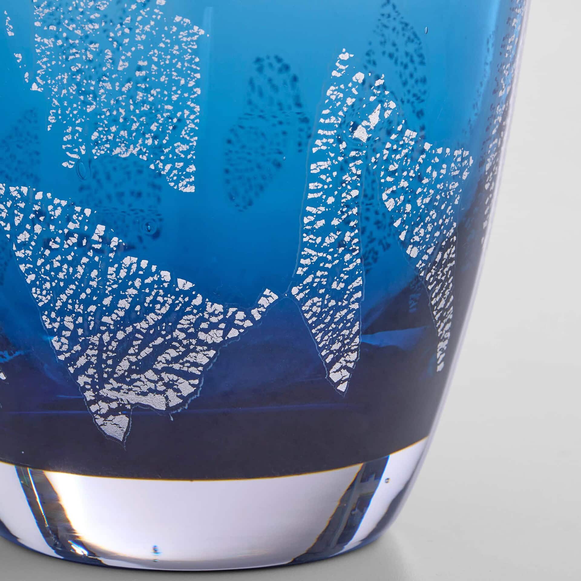 Hand-blown glass with ocean blue and metallic gold finishes; clear glass base. Slight natural variations may occur.