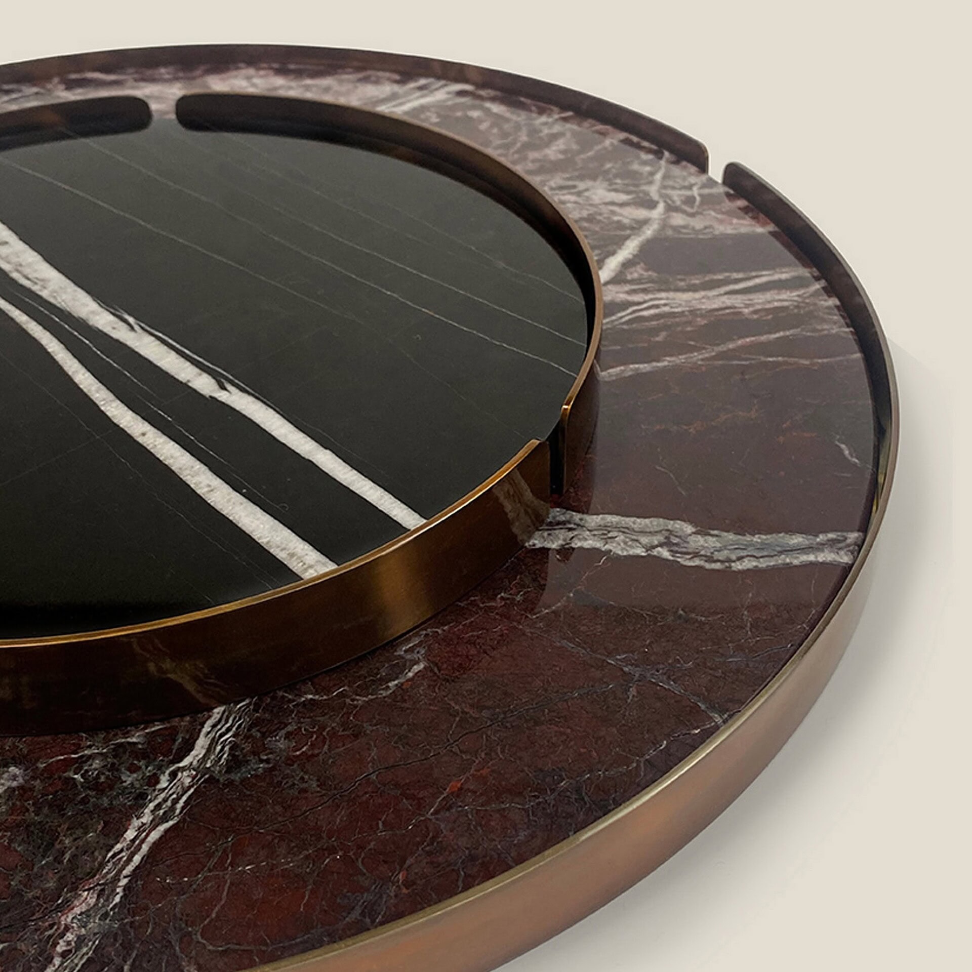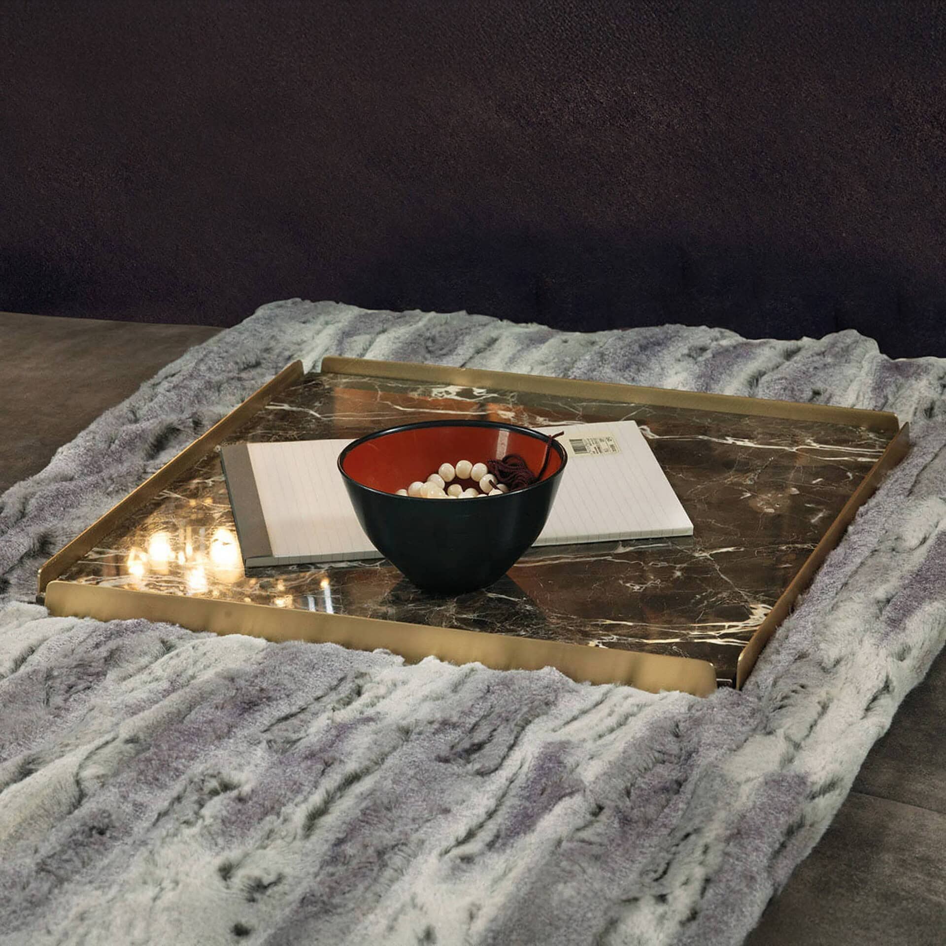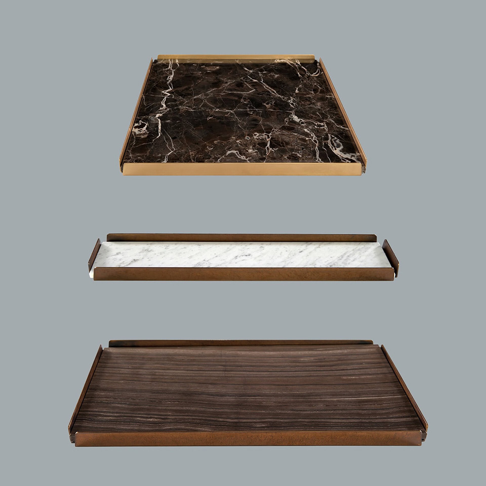 With a focus on materiality, the Hug Trays are offered in a range of exquisite combinations: from the deep veining of Sahara Noir and Emperador Dark marble to the warm patina of Burnished Bronze frames and soft, artful leathers. Their thoughtful proportions and rich surfaces bring a touch of Italian craftsmanship to everyday rituals. Available in multiple sizes, each piece can stand alone or be grouped for an elevated, curated aesthetic.
