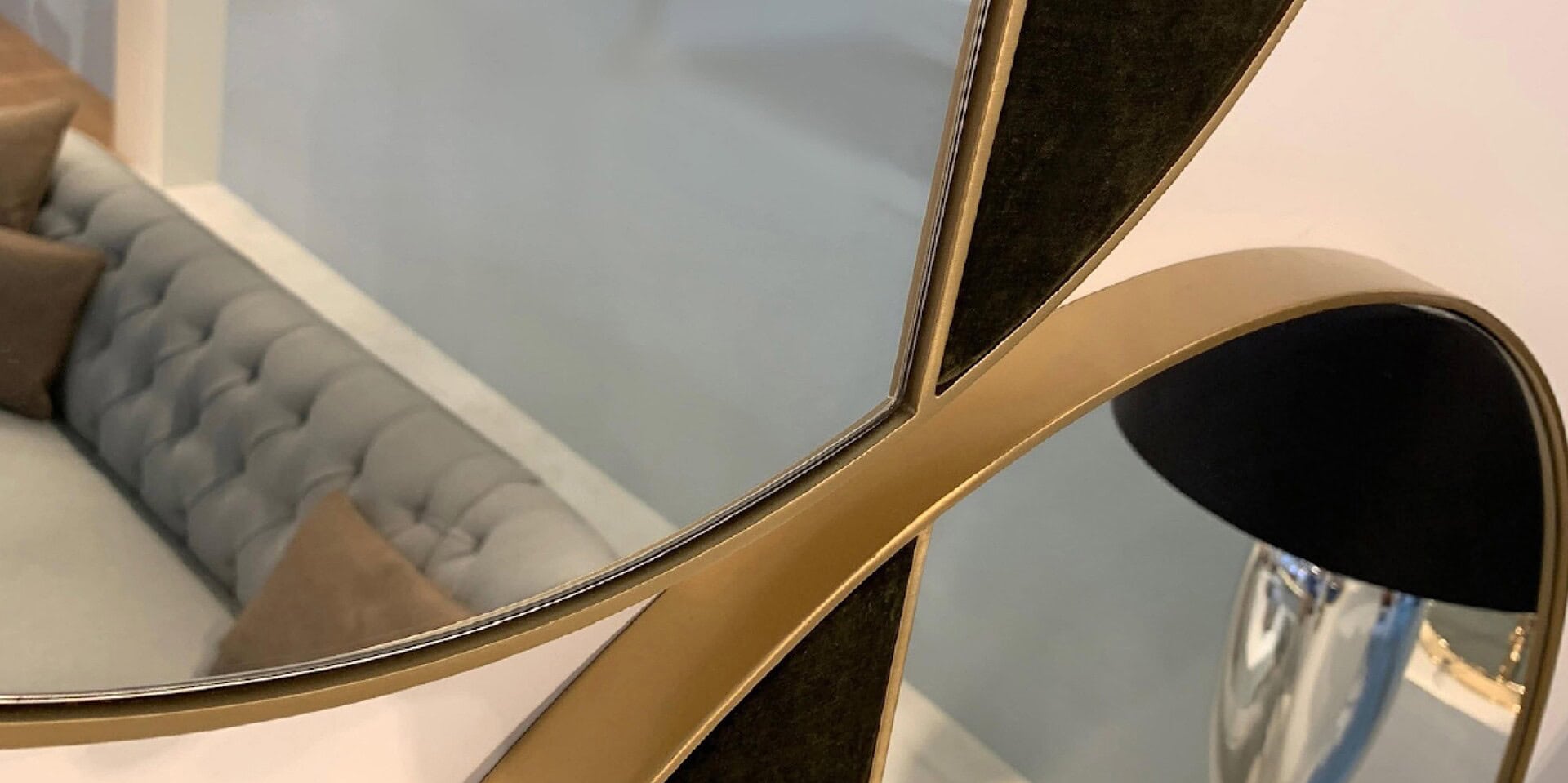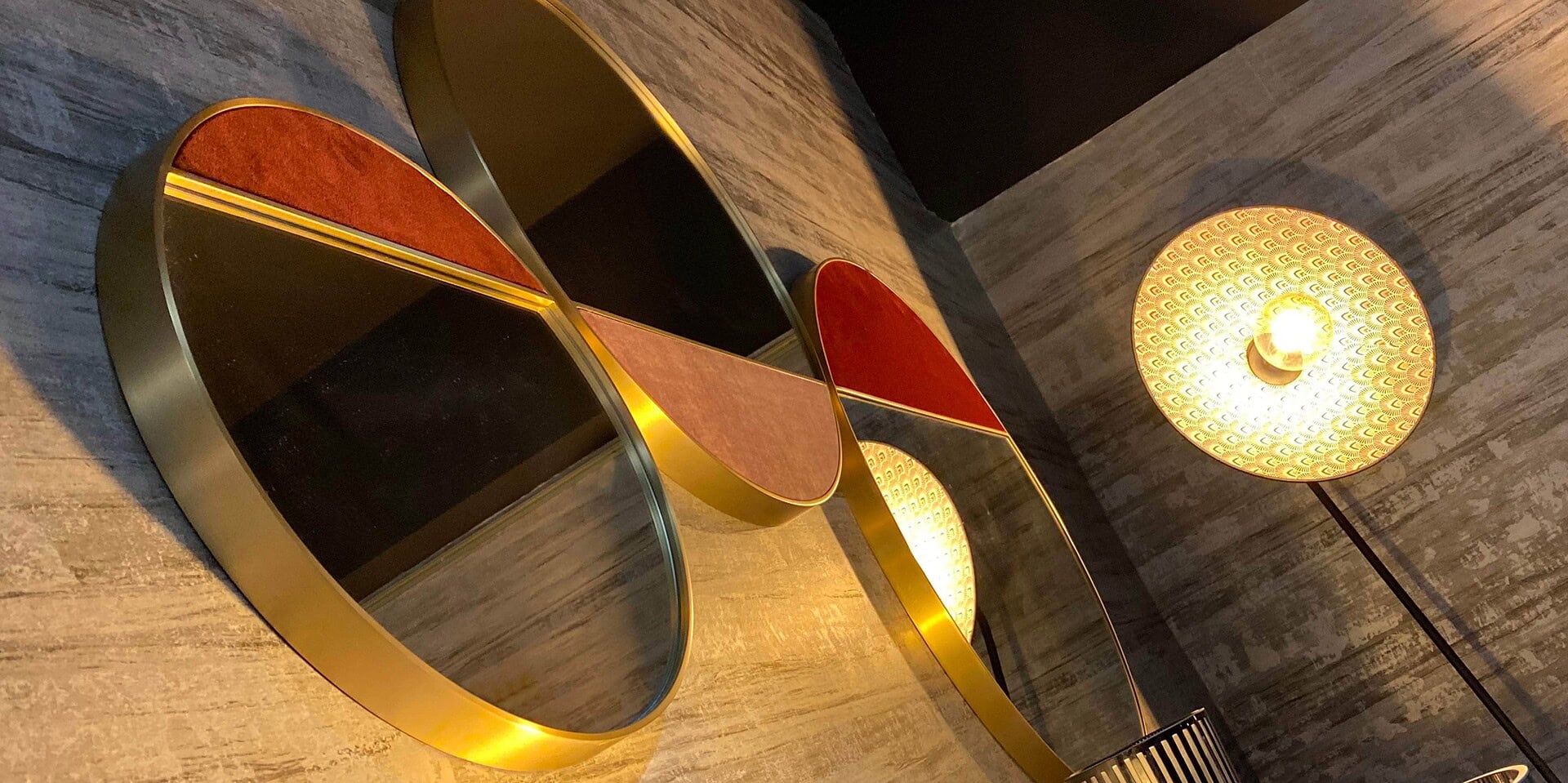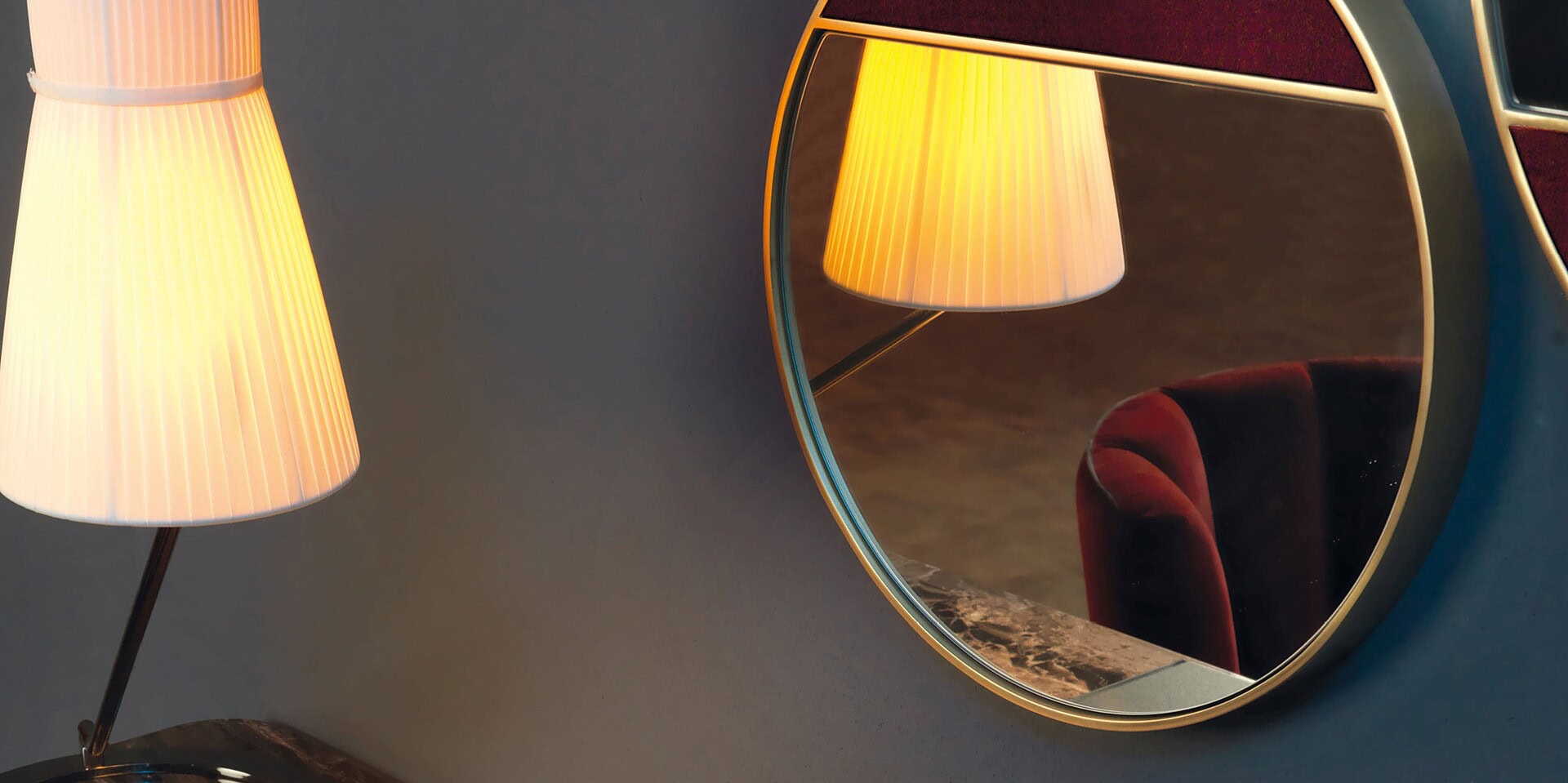 Series of treated metal mirrors with several finishes, having also a part coverable with each article of leather or fabric in the collection.