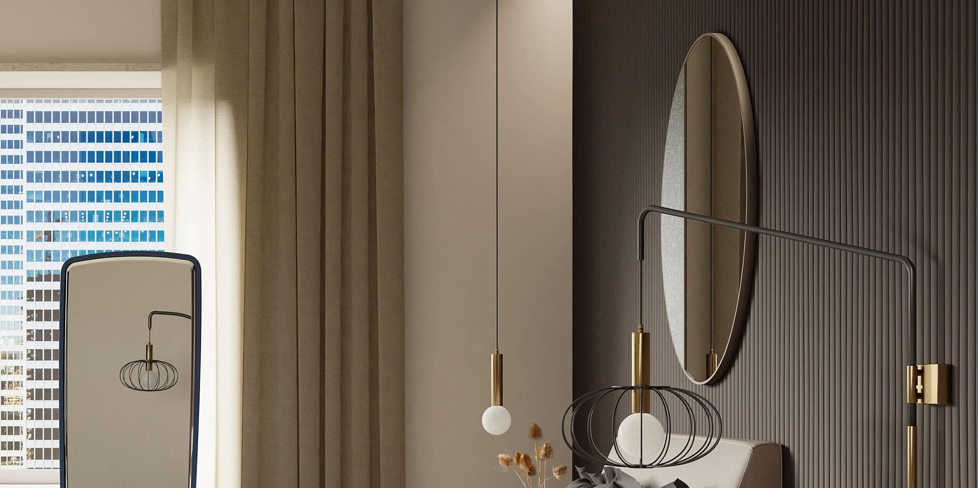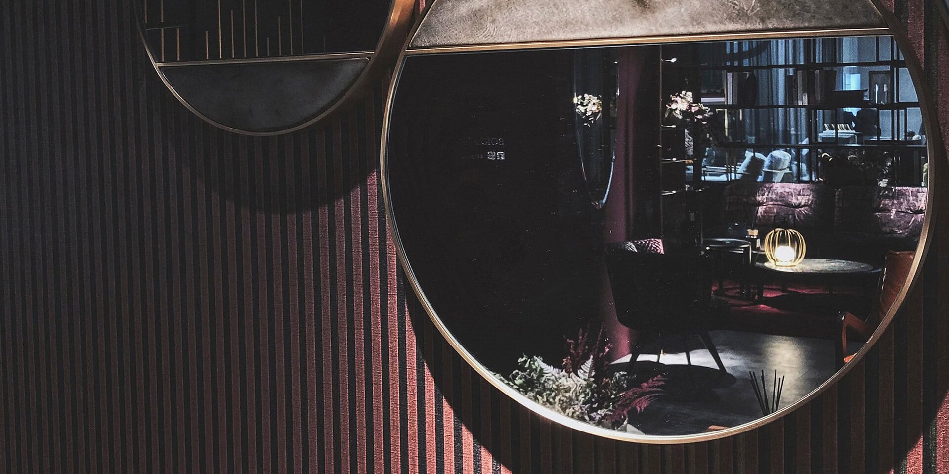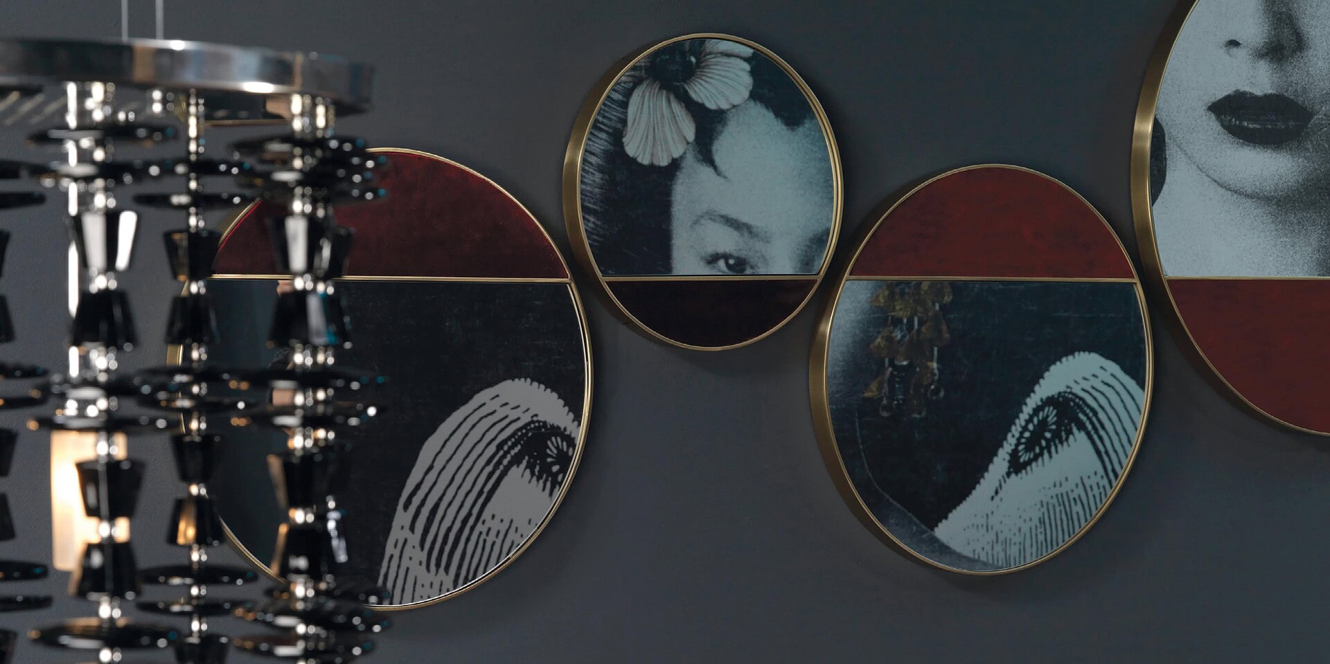 Series of treated metal mirrors with several finishes, having also a part coverable with each article of leather or fabric in the collection.