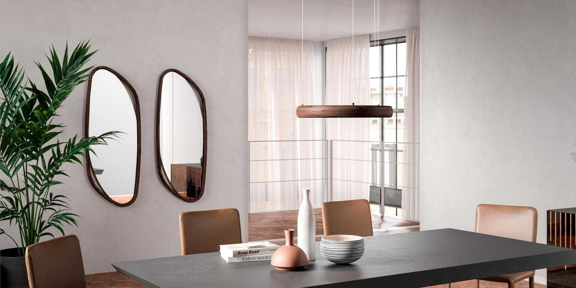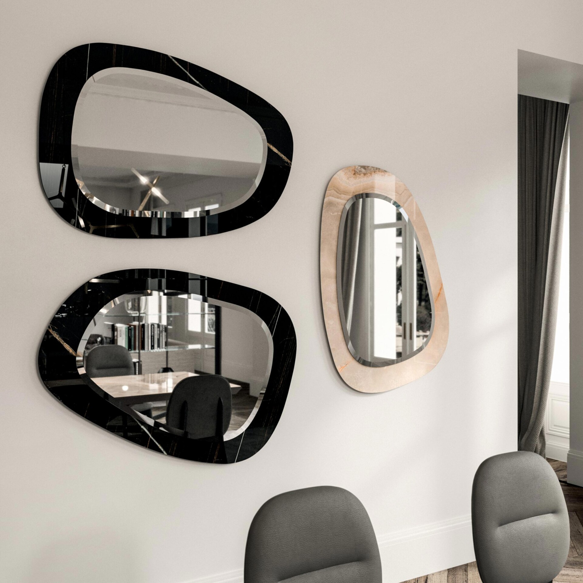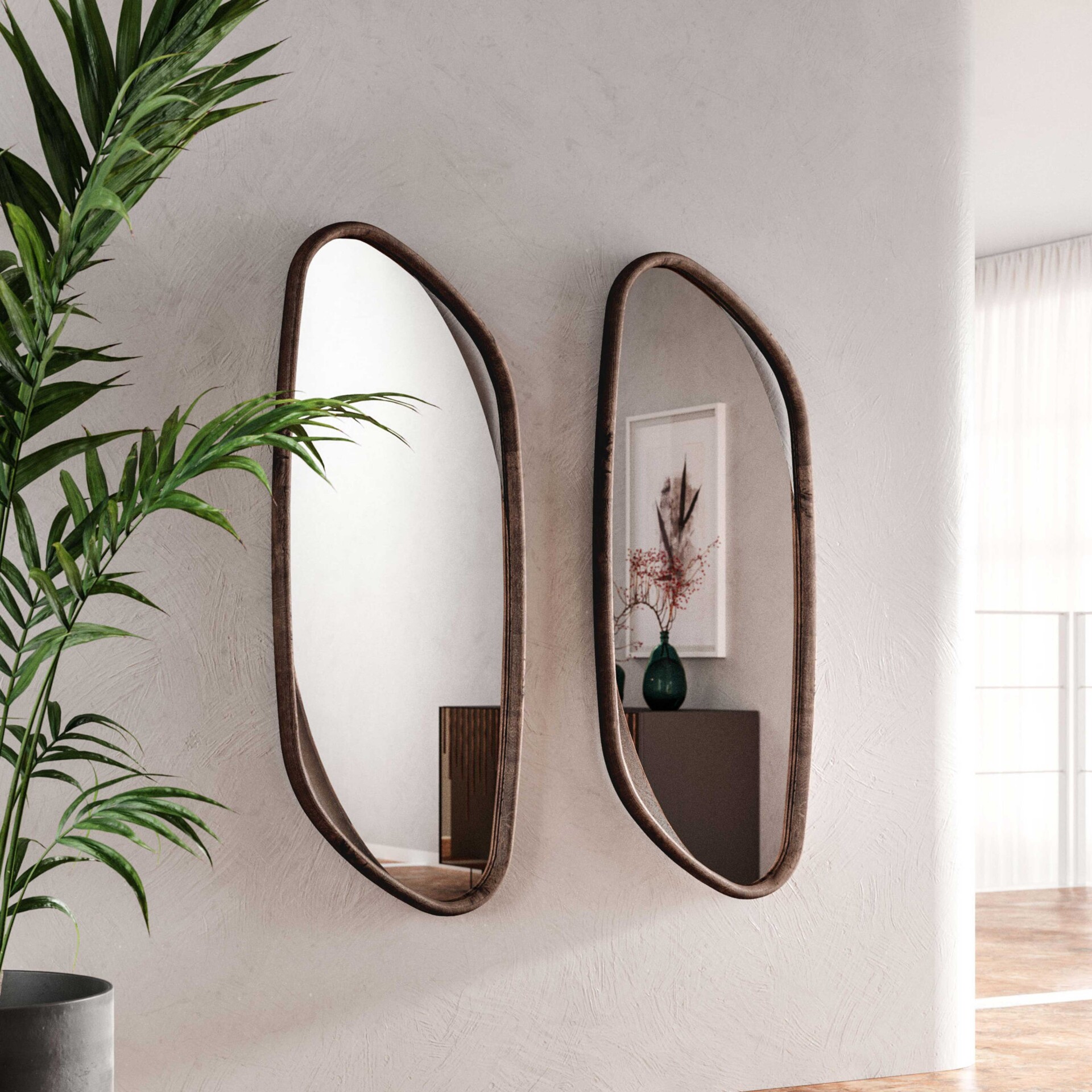 The Monza Mirror, with its elegant oval form, gently tilts against your home's walls, creating a sophisticated air. A luxurious wooden frame indulges in a bold flourish, assertively growing outward, adding depth and character. This mirror embodies a contemporary allure, offering an ethereal touch of grace to your space.