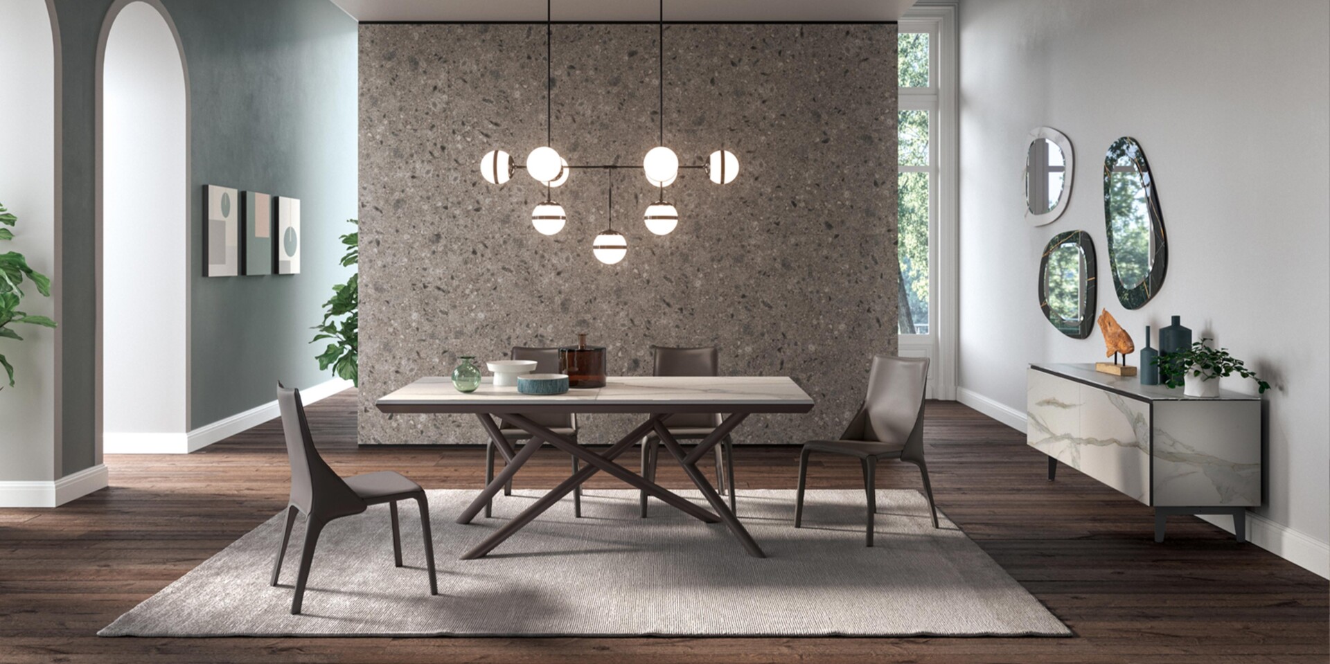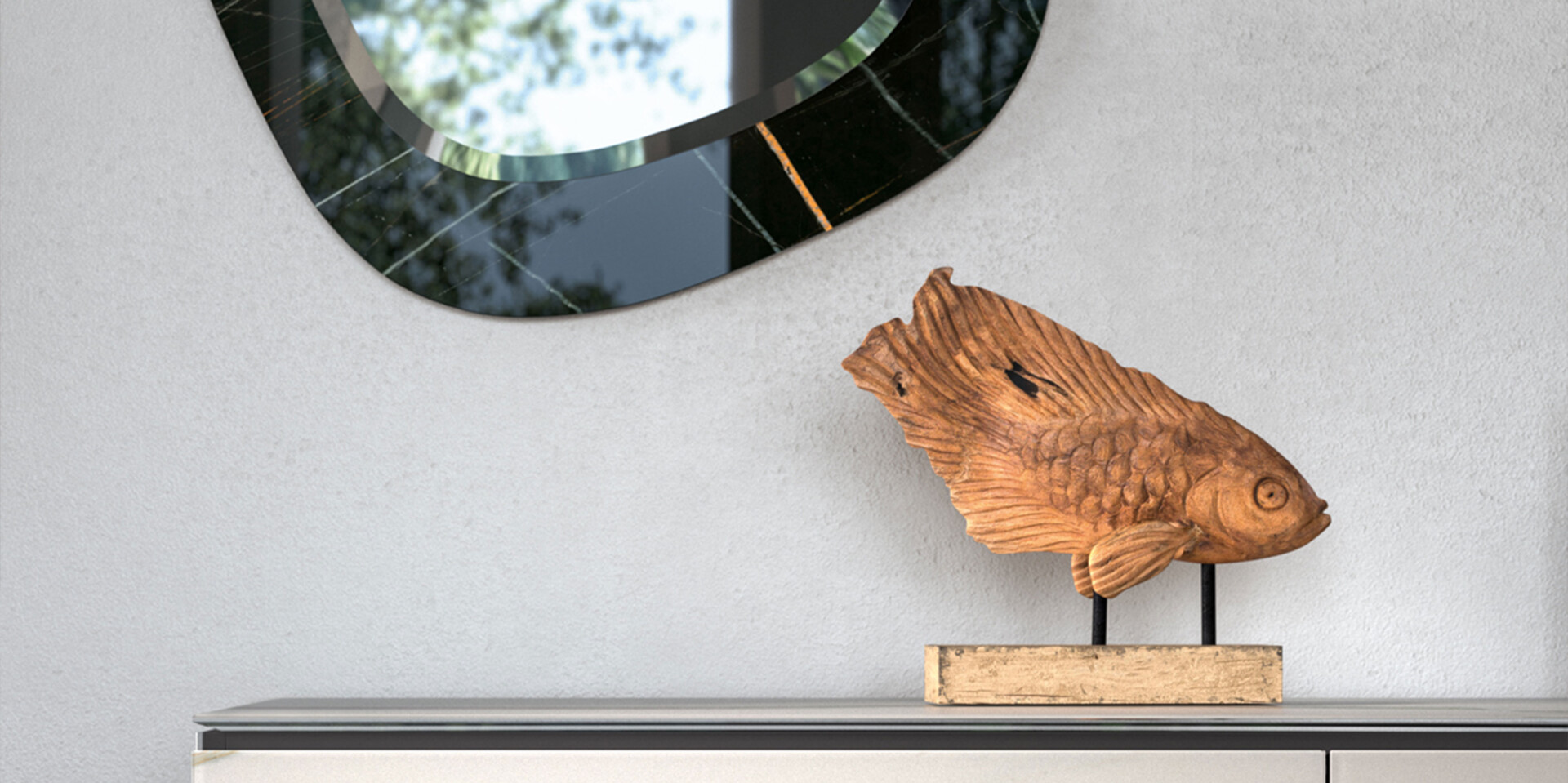 With an asymmetrical organic shape and a double depth, this mirror is complemented by an elegant functional bevel. In addition, the Marble Glass frames contribute to the creation of chromatic compositions that fill bare walls with light and movement. Vertically or horizontally adjustable.