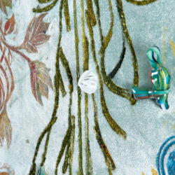 This tapestry, which is a component of the Velvet Lagoon Project on display at the Venice Biennale, is hand-painted using natural pigments and colored pastes on a silk velvet canvas that has been mounted on a wooden frame. The painting depicts a mystical lagoon landscape with mouth-blown Murano glass accents and features hues of azure, blue, green, pink, and gold.