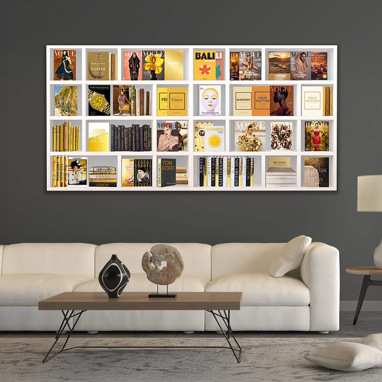 A striking fusion of nostalgia and modern artistry, Pleasures of Life Wall Art transforms pop culture icons into a refined visual statement. This bookshelf-inspired composition features glossy fashion covers, golden spines, and bold graphic elements, creating a gallery-worthy presence. Its vivid palette of yellow, gold, and black adds vibrancy and depth, making it the perfect conversation piece for living rooms, hallways, or media spaces.