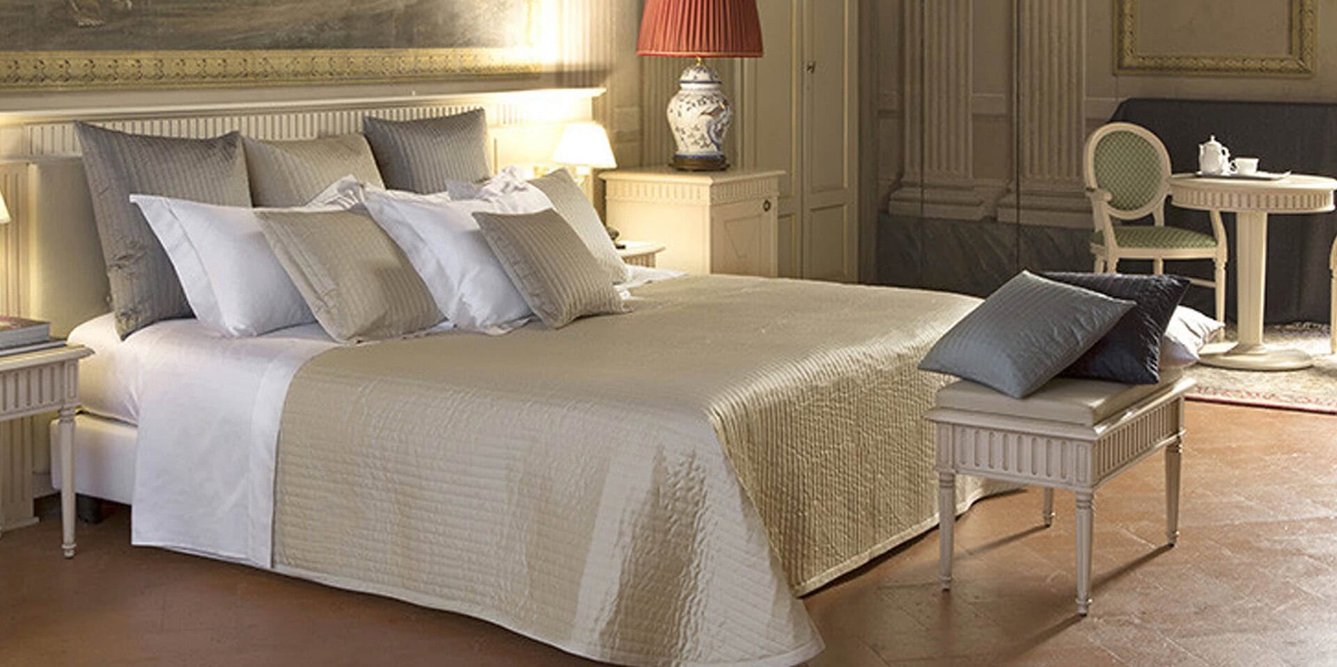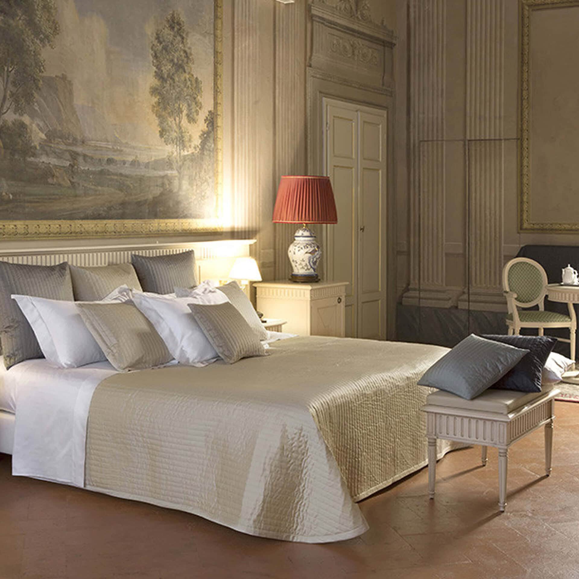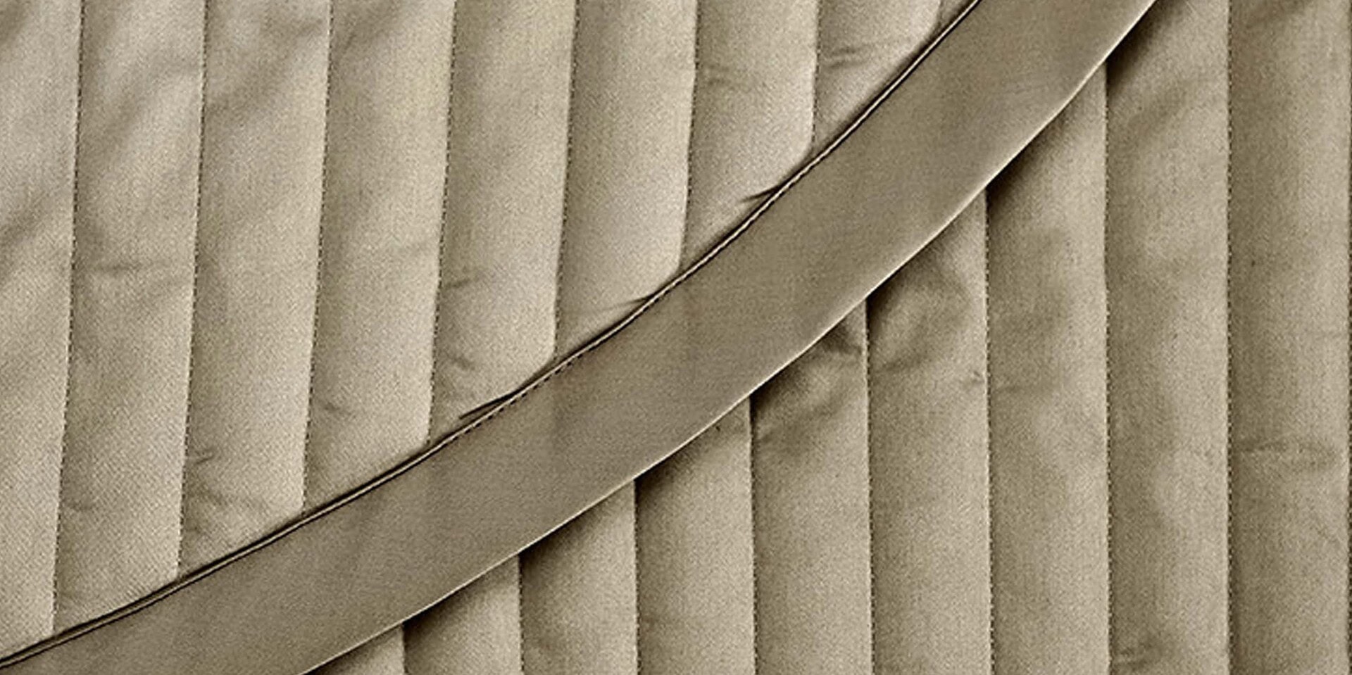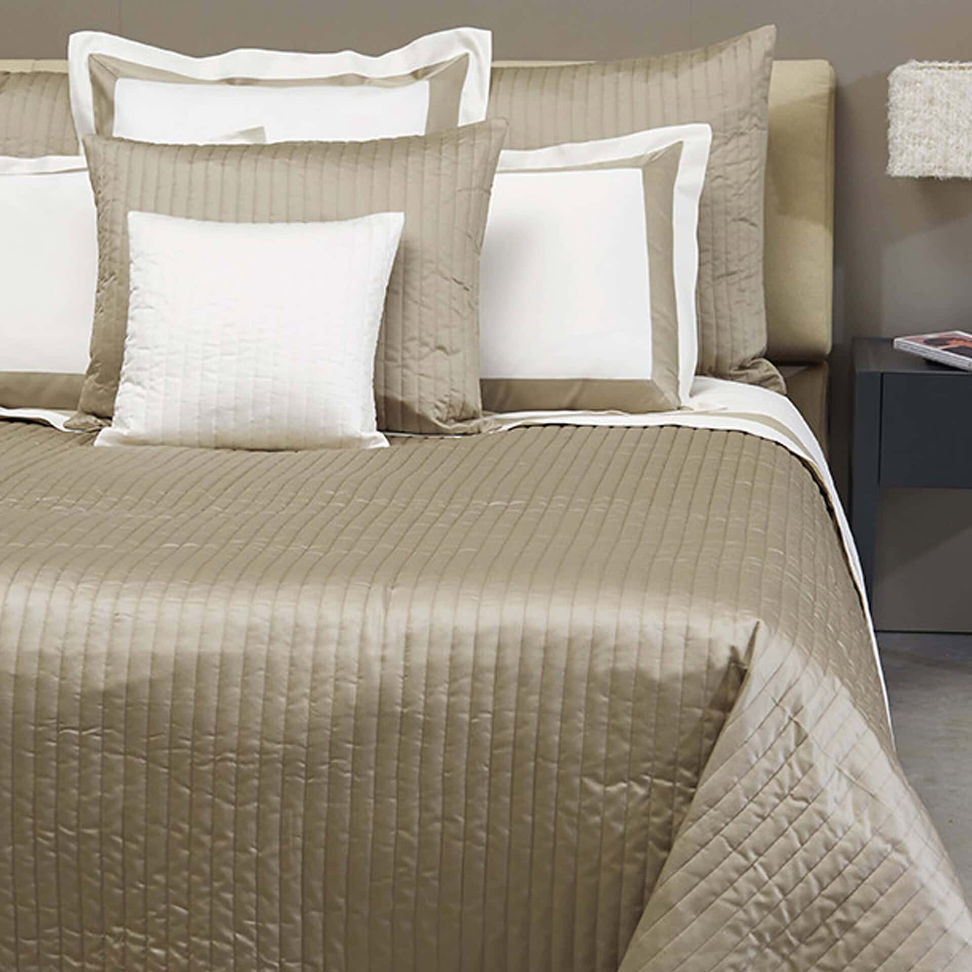 Combined with the smoothness that sateen fabrics are known for, the classic channel design makes this collection a timeless coverlet. An elegant plain sateen border in coordinating color borders the Siena coverlet, which is filled with a layer of warm but light weight polyester. The fabric is backed with the same color cotton percale. The Siena coverlet is available in a variety of colors and sizes. The collection is completed by decorative pillowcases in the same fabric. Designed and manufactured in Italy.