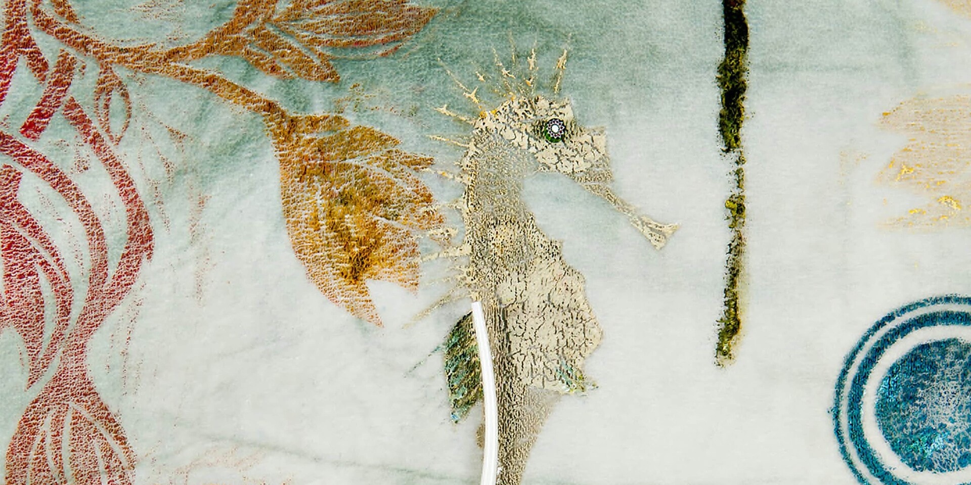 This tapestry, which is a component of the Velvet Lagoon Project on display at the Venice Biennale, is hand-painted using natural pigments and colored pastes on a silk velvet canvas that has been mounted on a wooden frame. The painting depicts a mystical lagoon landscape with mouth-blown Murano glass accents and features hues of azure, blue, green, pink, and gold.