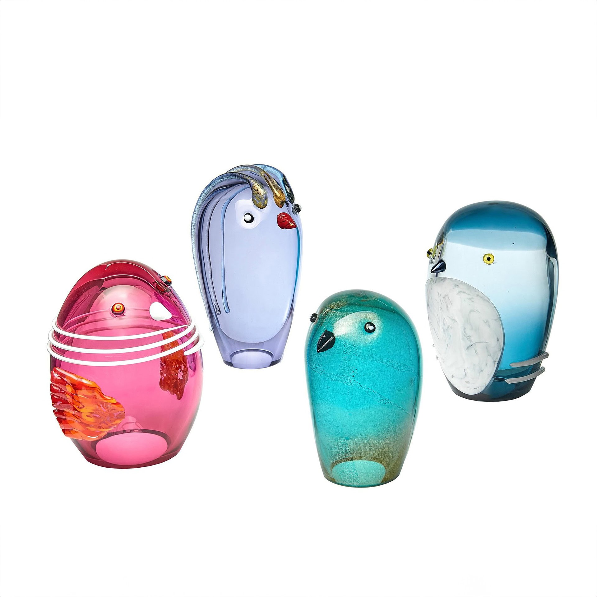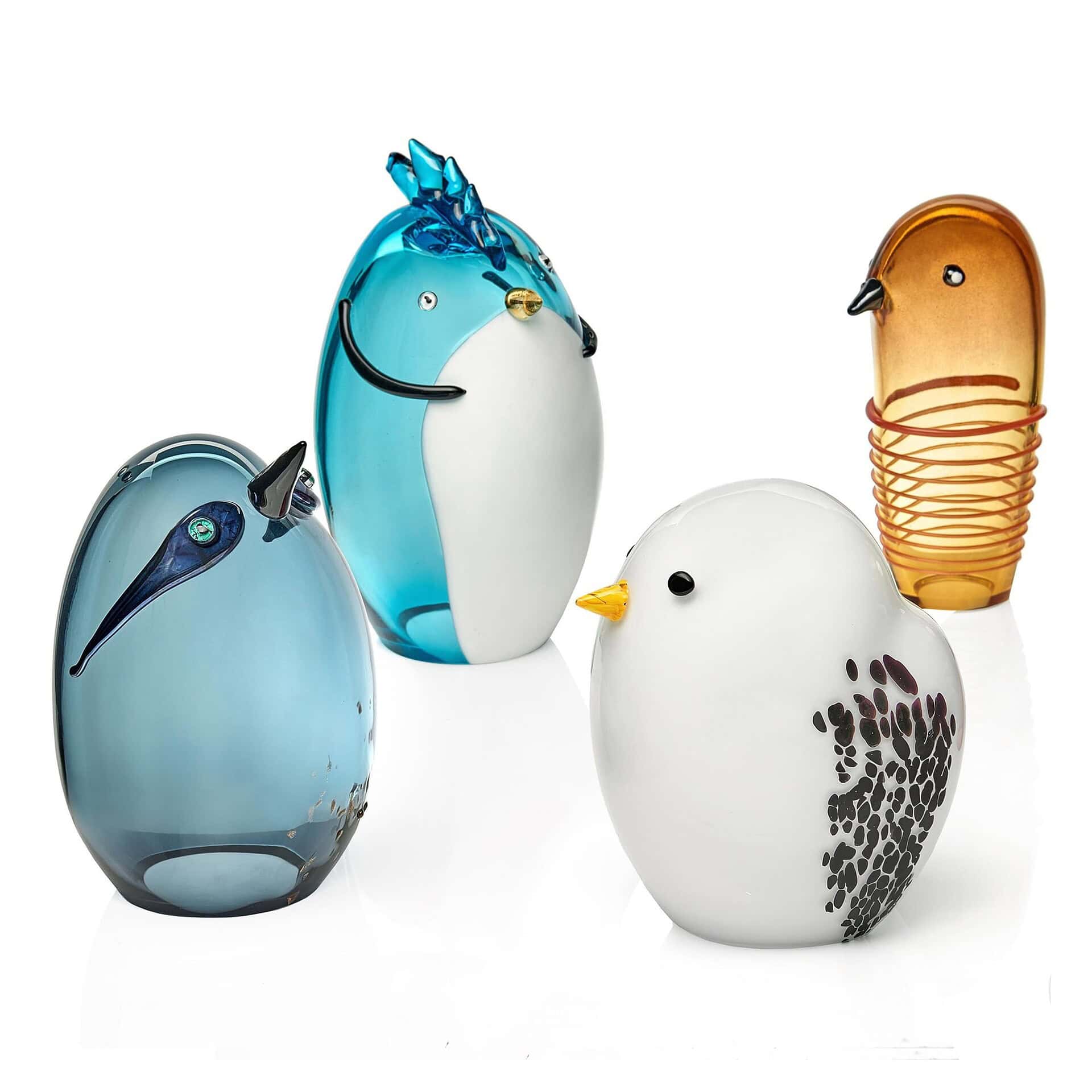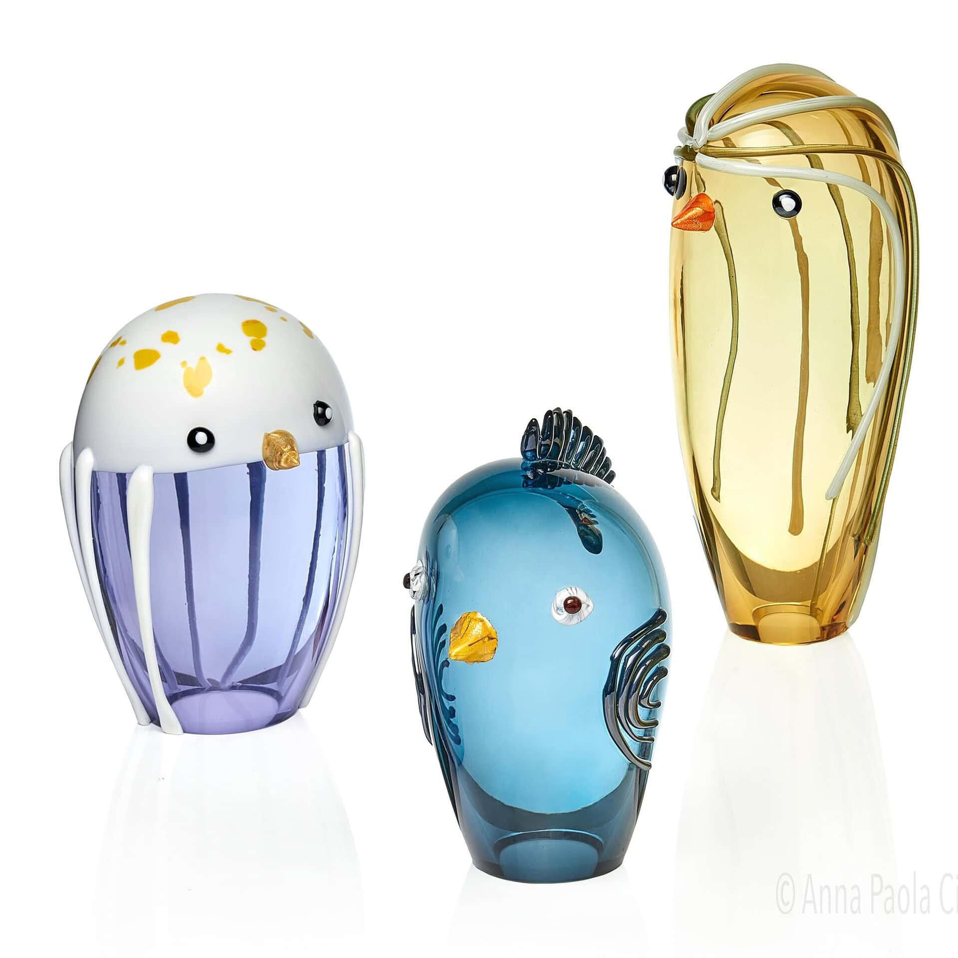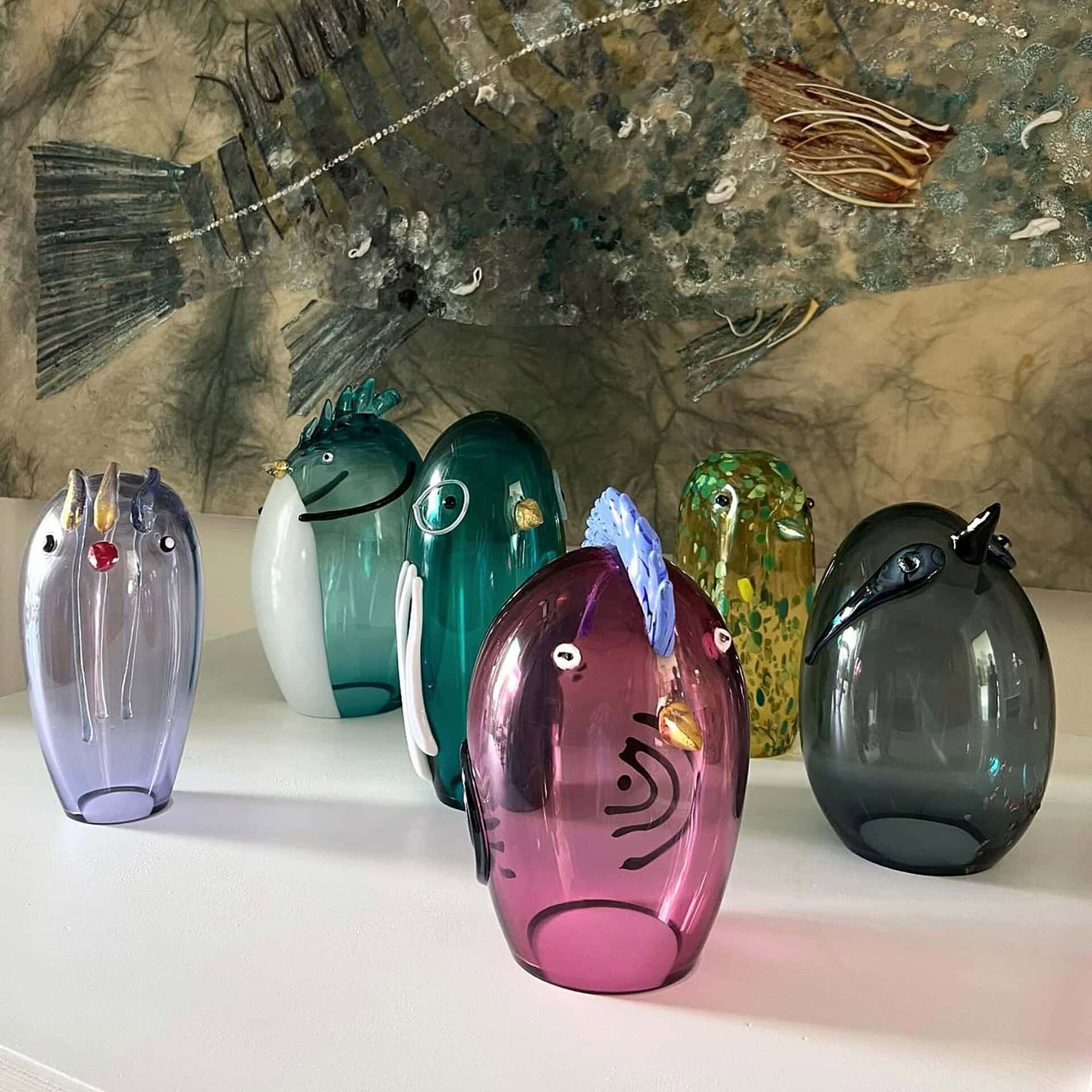 The Funny Birds feature a vibrant spectrum of colors inspired by the luminous beauty of Murano glass and the diverse avian life of the Venetian lagoon. Each bird is individually crafted with its own distinctive color palette, ranging from soft, translucent tones to bold, saturated hues—ensuring no two are alike.