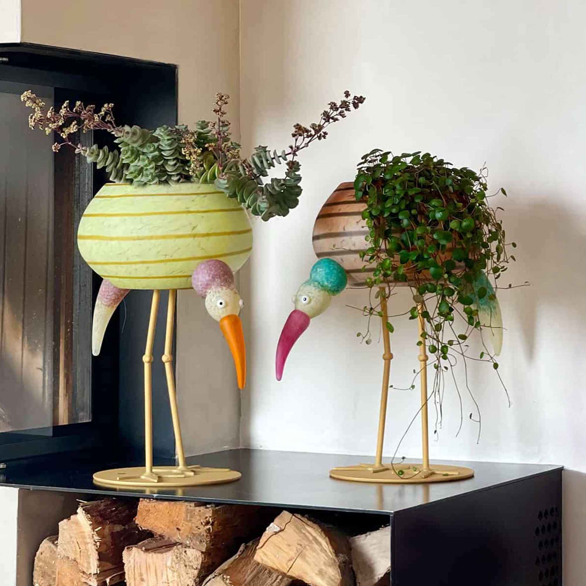 The Ibis Hand-Blown Glass Vessel by Borowski blends playful artistry with refined craftsmanship, serving as both a sculptural accent and a versatile functional piece. Its rounded glass form rests elegantly on slender metal legs, echoing the graceful stance of the ibis bird. Whether styled as a planter, candleholder, or decorative bowl, it infuses interiors with light, color, and character, making it a striking focal point in any setting.