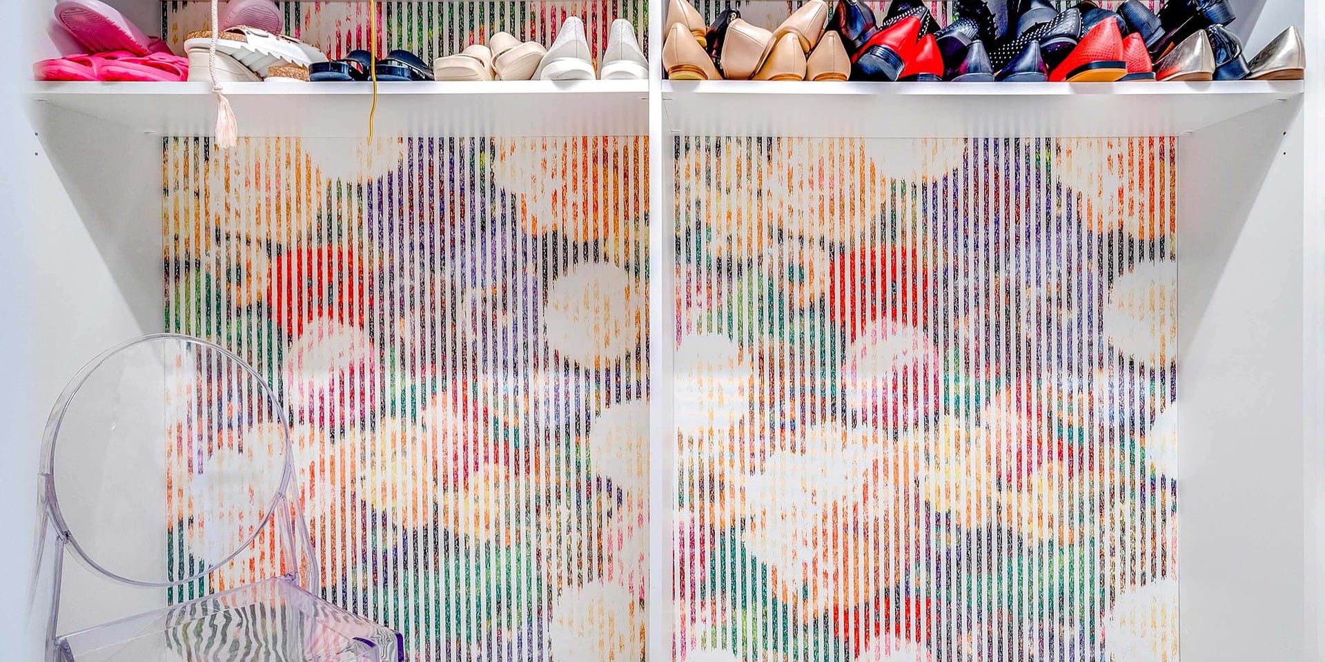 A colorful, striped spherical lampshade hanging against a wall covered in intricate floral wallpaper with muted pink, blue, and orange patterns.