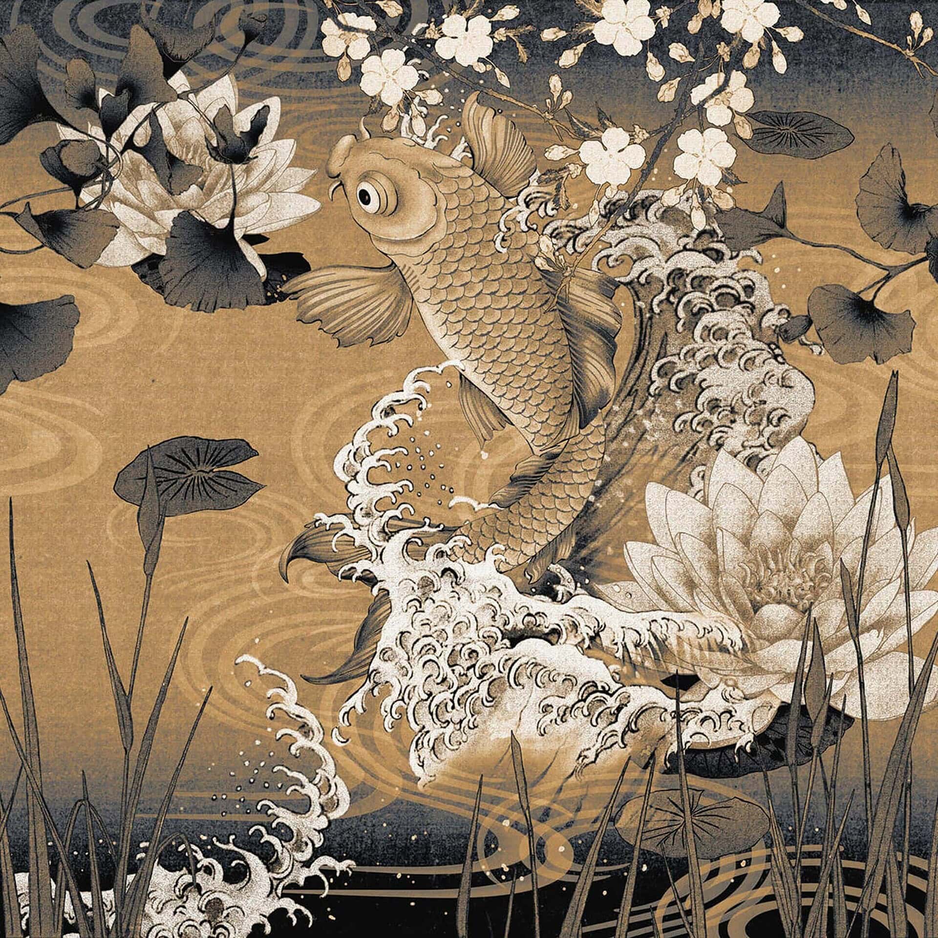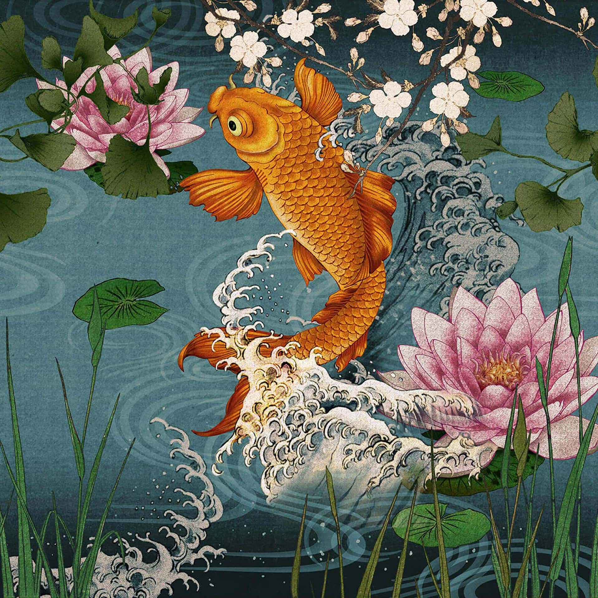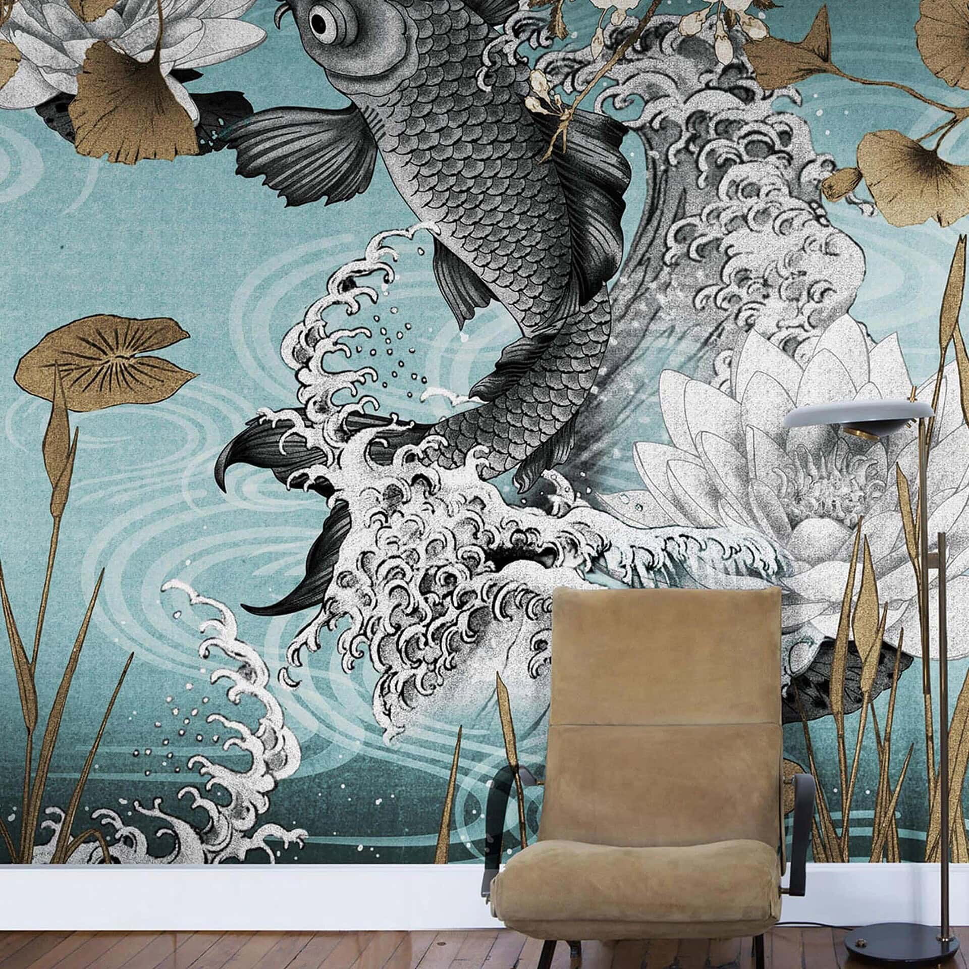 Elevate your interior space with the Koi Wallpaper by LondonArt, a masterful blend of artistry and functionality. This wallpaper transports your home into an enchanting underwater realm, beautifully capturing a koi in its natural habitat. The intricate design features a koi elegantly navigating through vibrant lily pads and flowers, with contrasting colors creating a captivating visual depth. Thanks to the designer's meticulous detail, the wallpaper evokes a lifelike ripple effect, instilling movement and vibrancy into any room. Whether in a modern living room or a tranquil bedroom, the Koi Wallpaper adds a refined Eastern touch, making your walls a striking focal point.