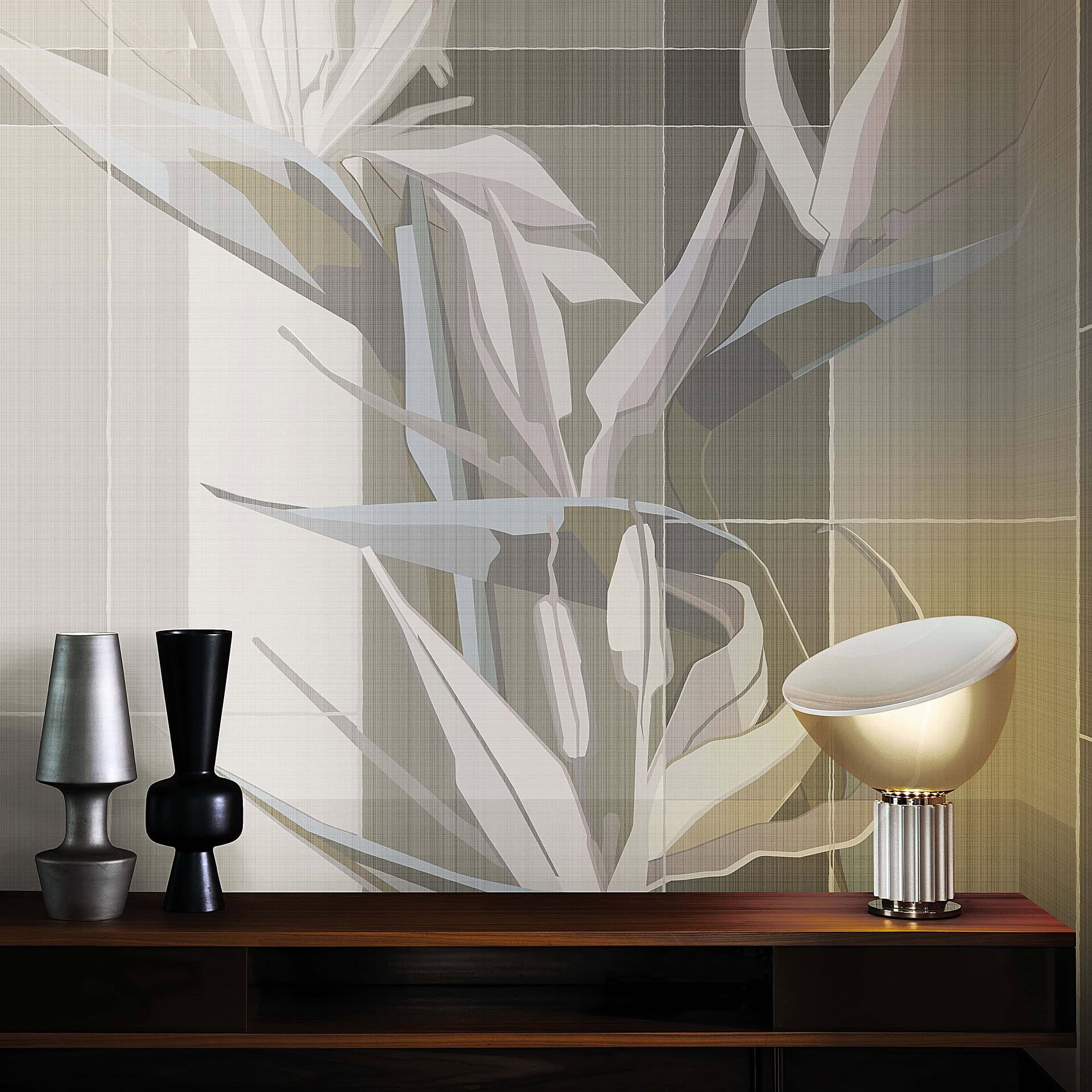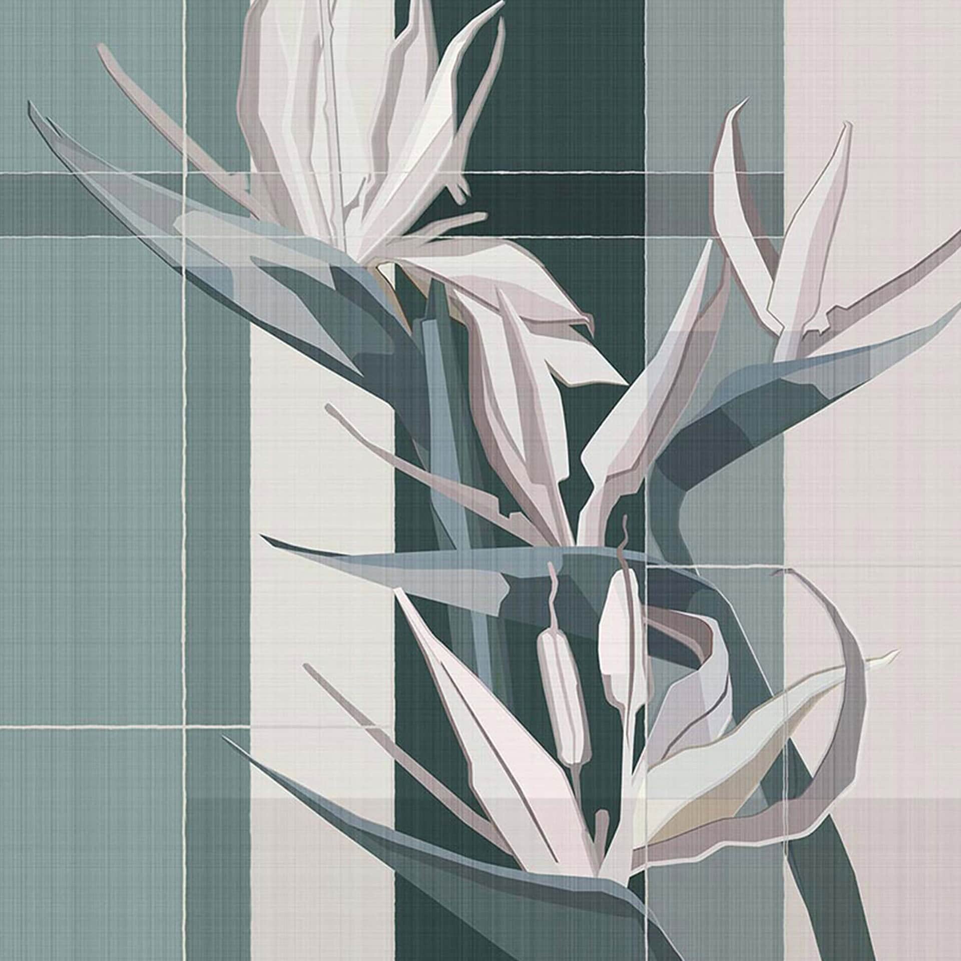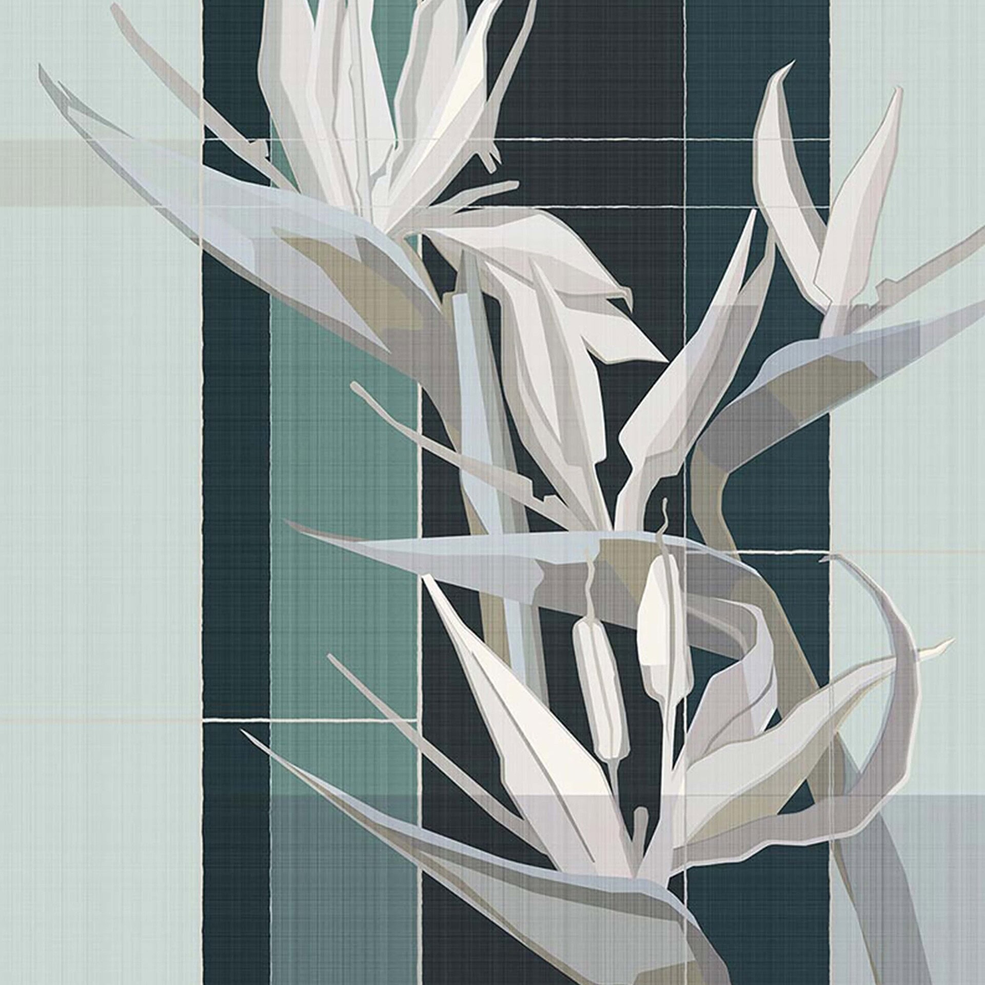 In the past, the Strelitzia flower was the flower of choice to send to royal families for its majesty and elegance. By presenting well-defined shapes and colors on a large-scale image, the main characteristics of the plant on the Strelitzia Wallpaper are reversed. By enlarging its dimensions ironically, its contours and tones are softened, resulting in an effect of composite, but evanescent, imagery that plays on transparency.