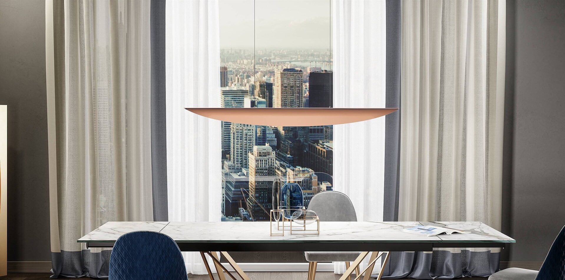 Multi-ring Cerchio Ring Suspension Light installed in a contemporary living room with large windows.