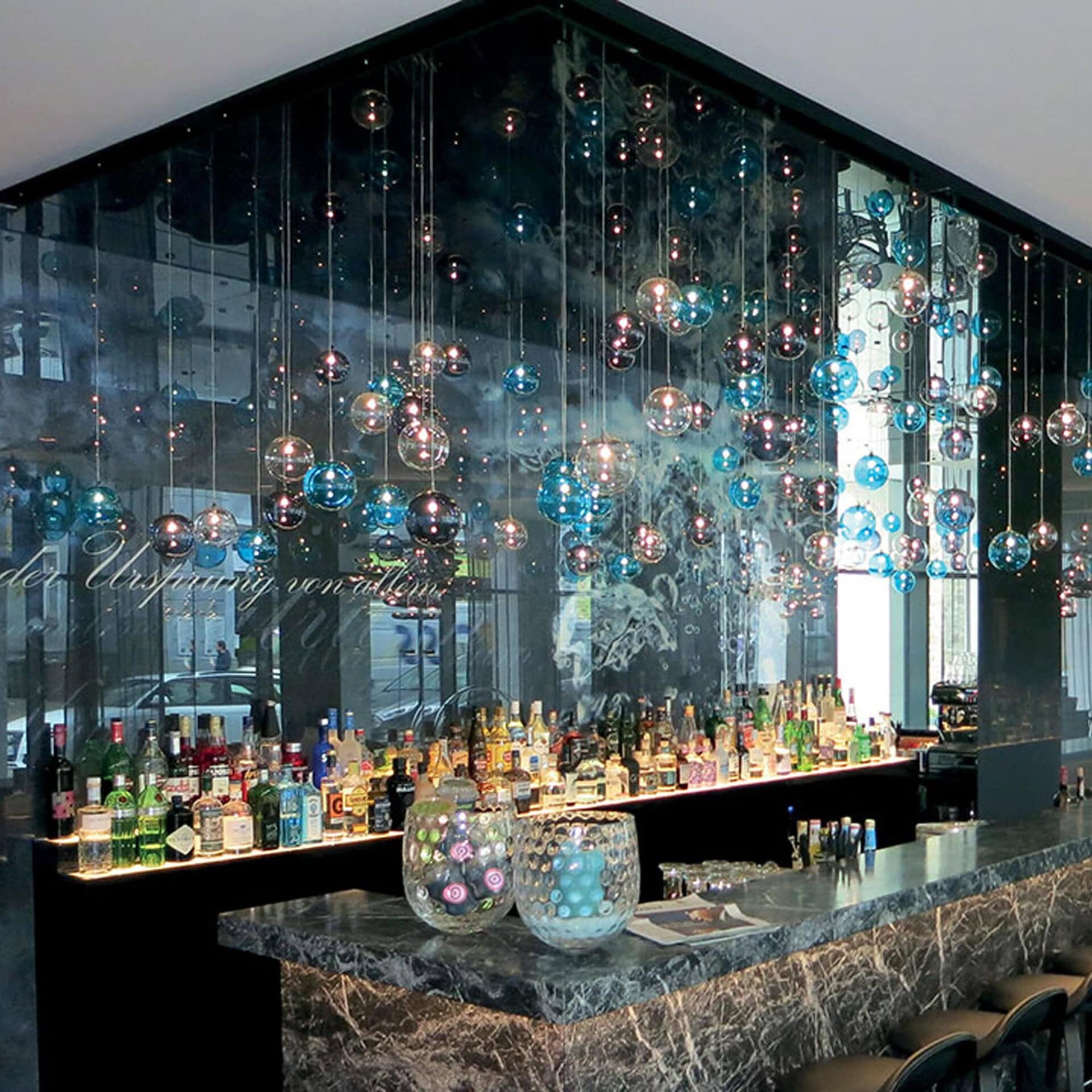 Designed in Italy, this striking chandelier combines artisanal glasswork with modern light technology. Each fixture features smooth borosilicate glass spheres suspended from a lacquered or mirrored glass canopy, creating a mesmerizing play of light and reflection. Available in various configurations, Bulles can feature as few as 12 or as many as 178 individual spheres in transparent or tinted hues such as blue-grey, amber, aquamarine, or alexandrite. Integrated LED lights offer warm, energy-efficient illumination, while the adjustable 236″ suspension height allows for tailored installation in both residential and commercial spaces. Elegant yet avant-garde, the Bulles Chandelier redefines contemporary luxury lighting.
