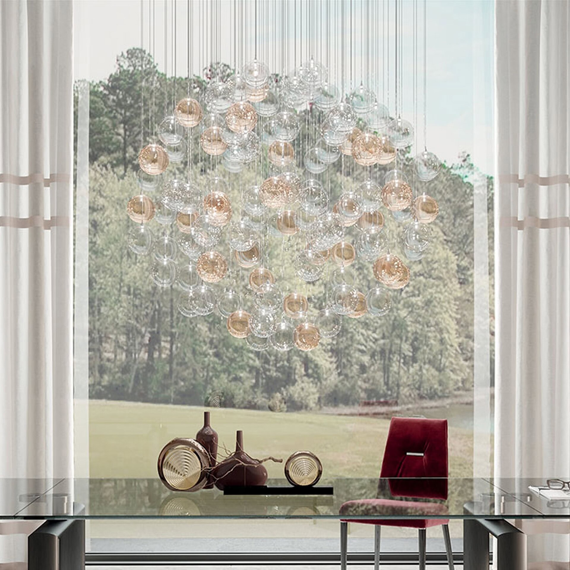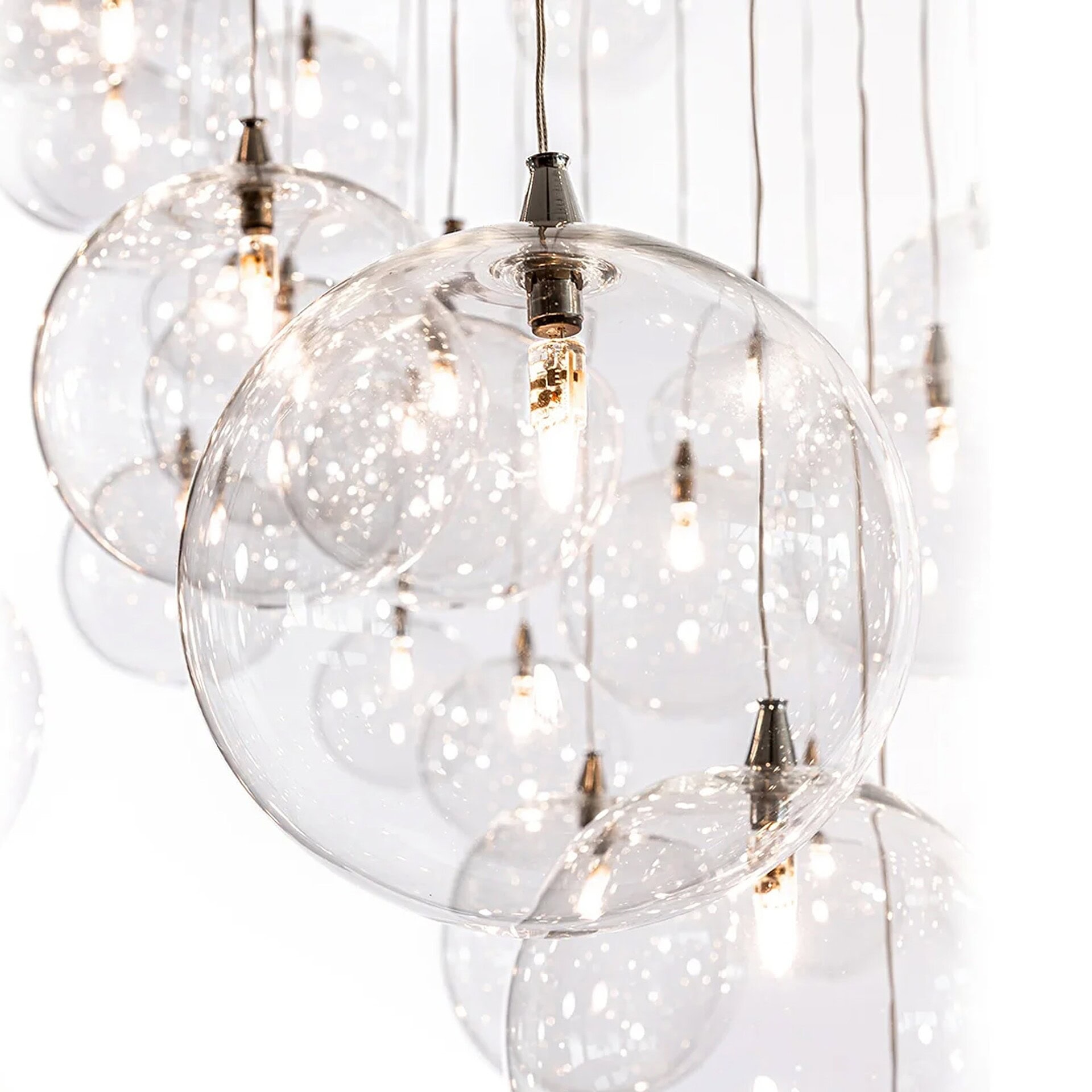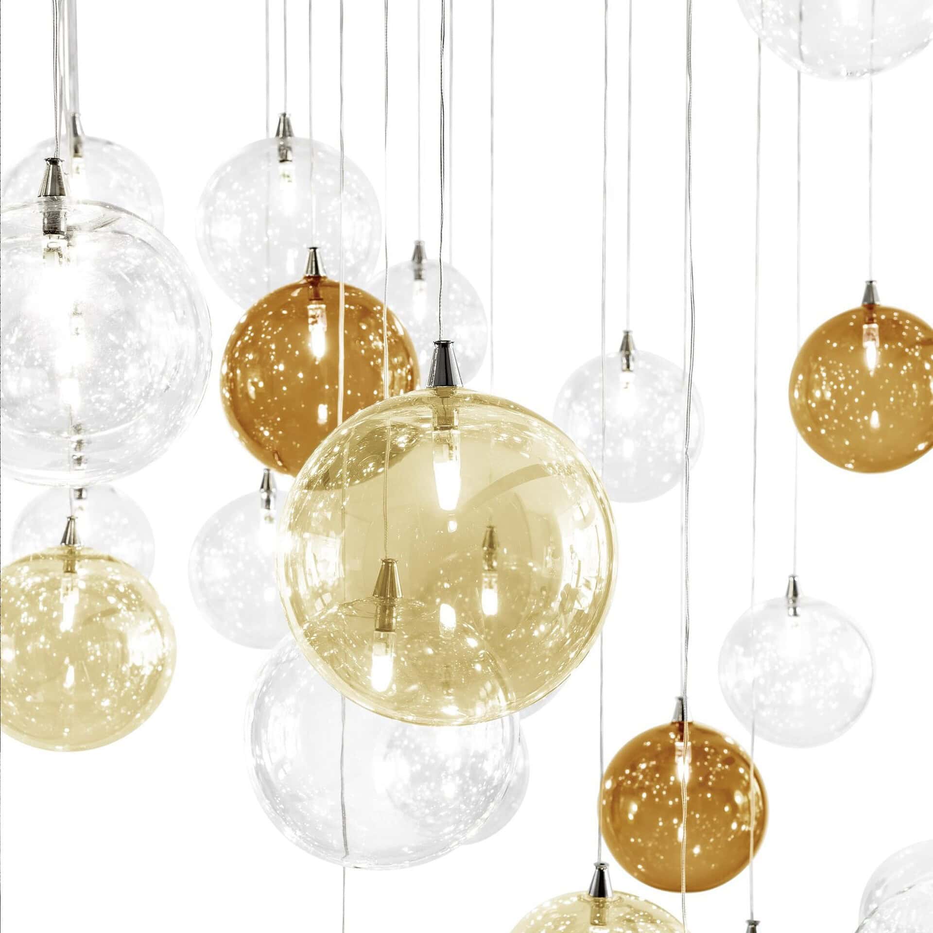 The Bulles Glass Cluster Chandelier by Reflex is a captivating centerpiece that transforms any interior with its fluid arrangement of suspended glass spheres and radiant LED illumination.