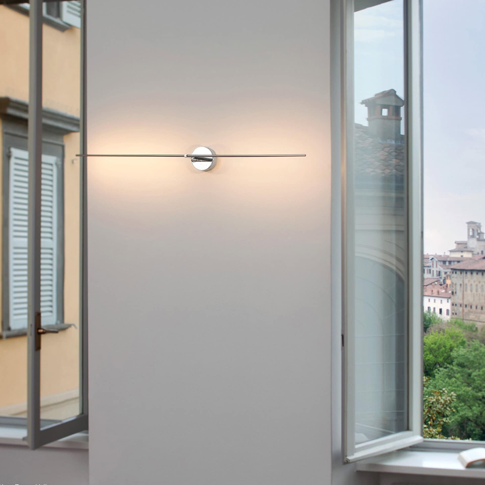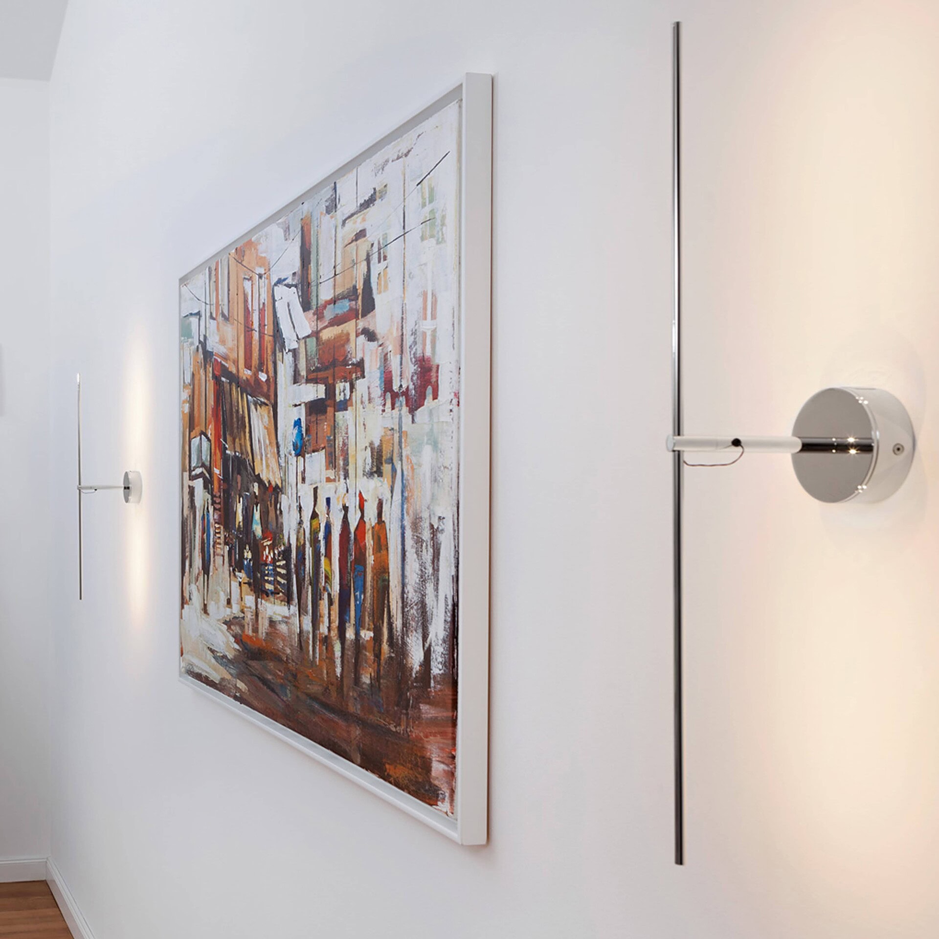 Light Stick impresses with its clear minimalism and filigreed design, first made possible by LED lamps. Copper rods with warm white LED lamps are mounted vertically on the base or horizontally or vertically in front of the wall. A single light source provides indirect lighting. It's the light that stands out, not the light fixture. In the living room, Light Stick can be used to decorate empty walls with lighting accents or to softly and efficiently illuminate rooms. Almost any interior can be styled with the light fixture.
